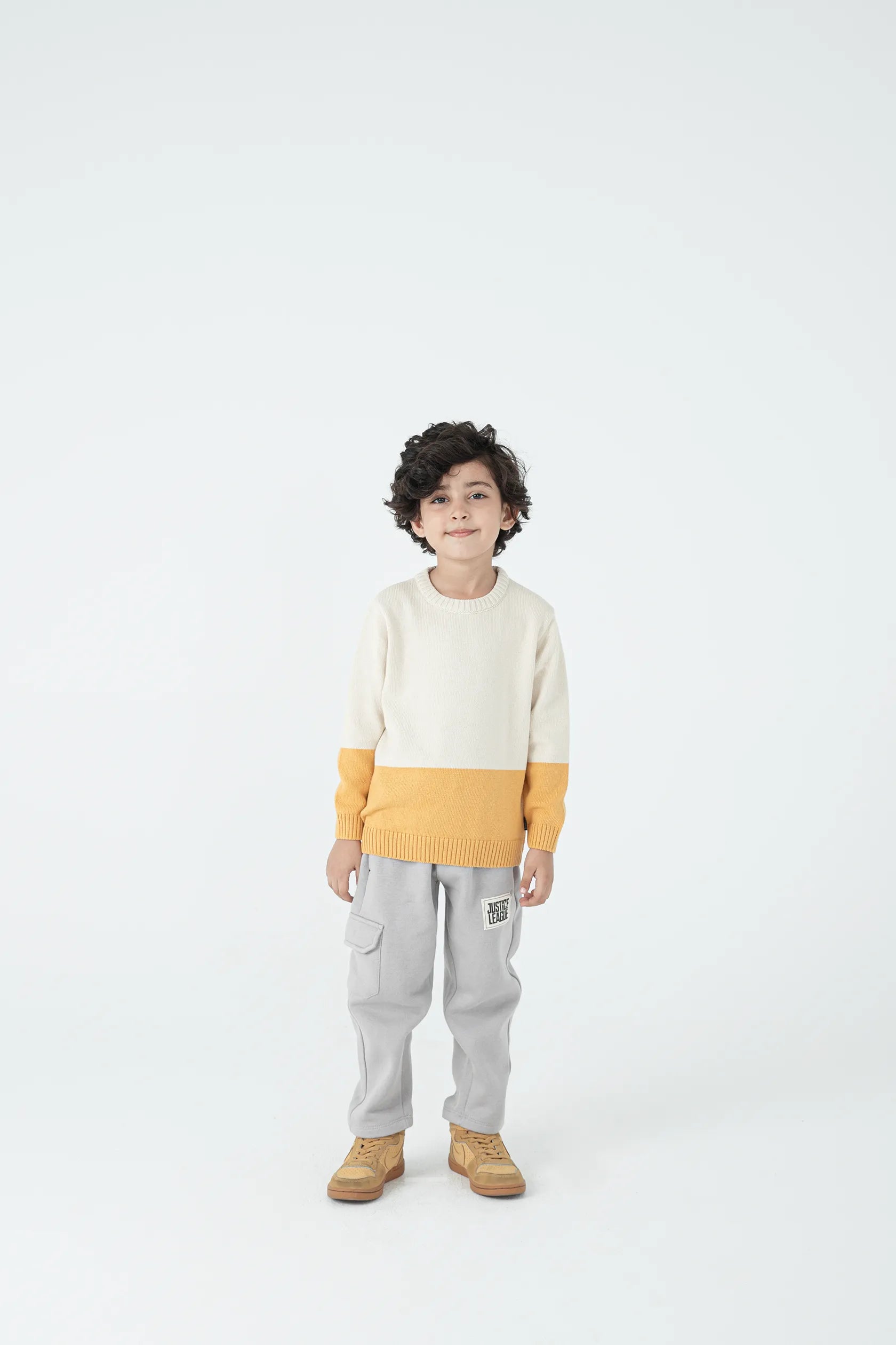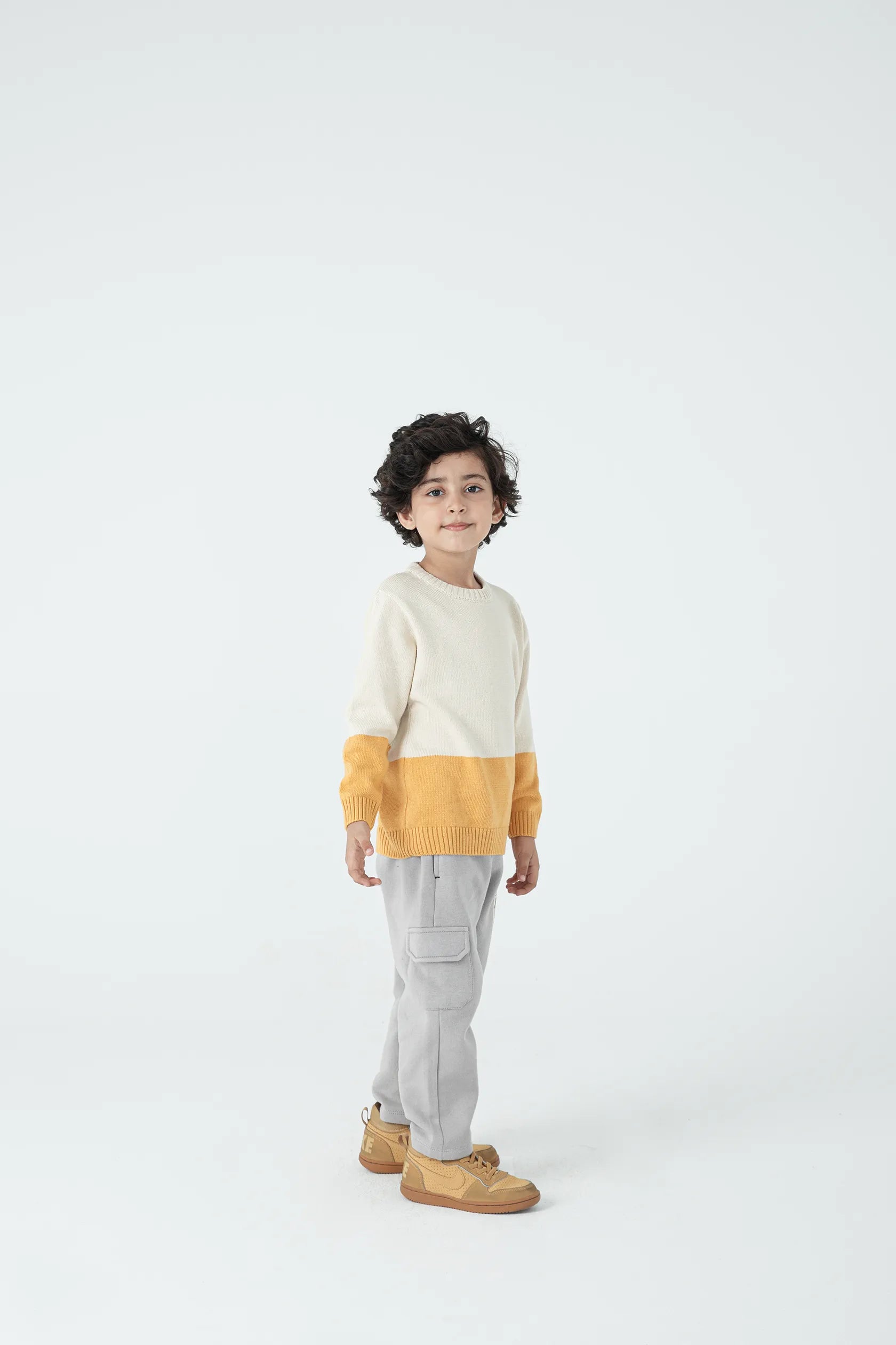 A bold twist on basics, this cotton knitted sweater features a half-and-half colorblock of skin and mustard. Ribbed cuffs and hem provide structure, while the soft knit keeps it comfy all day. Whether layered or solo, it's perfect for chilly school mornings or weekend outings with flair and ease.