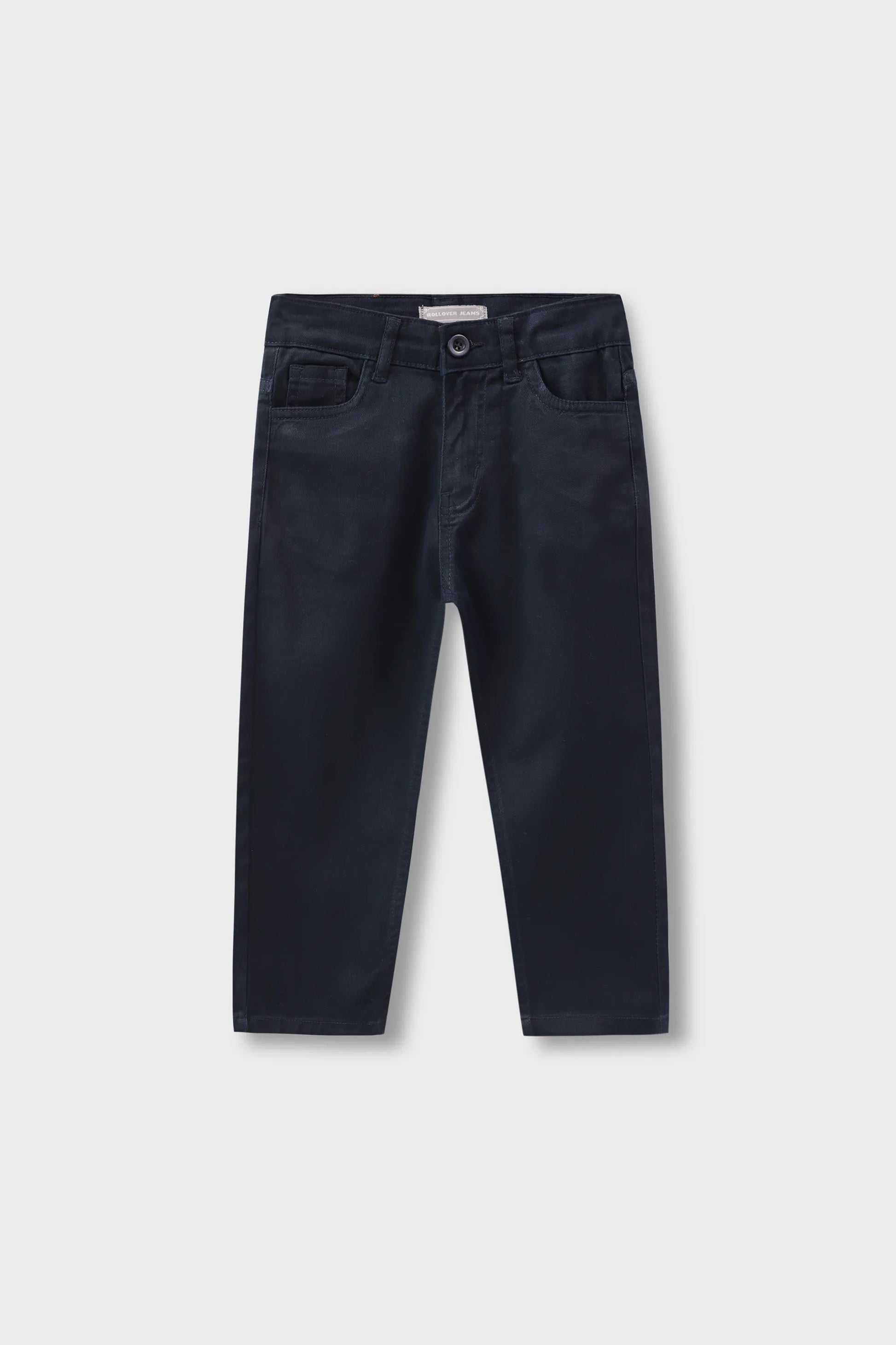 Crafted in soft twill with a sleek navy tone, these straight-fit pants feature coin-friendly round pockets, a neat fly with tonal bar tack, and plastic buttons that blend seamlessly. Double-stitched for durability, they deliver clean lines and casual confidence. Designed for boys who like to look sharp on the go.