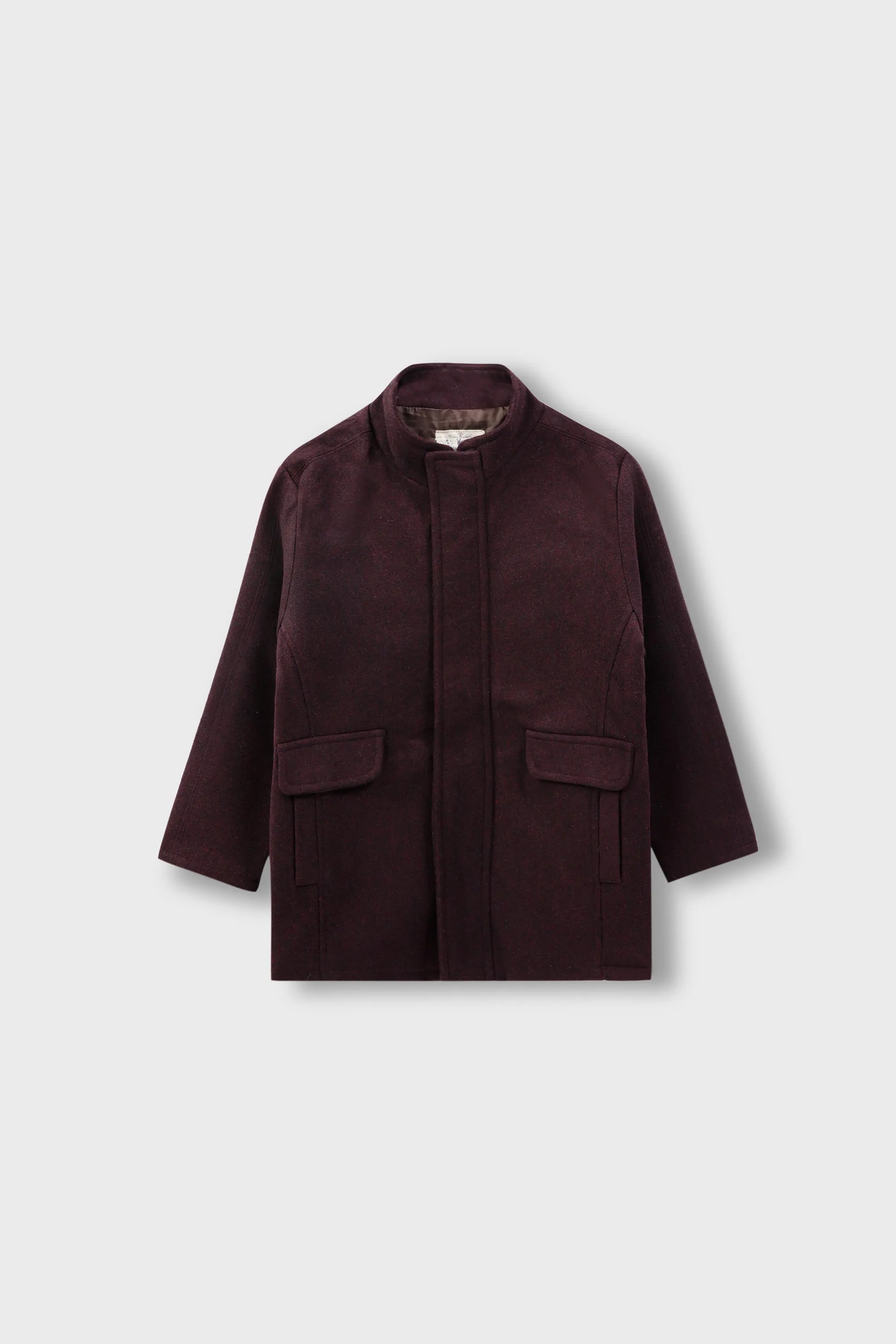 The Burgundy Felt Coat is the ultimate in modern style for boys. Crafted in luxurious felt fabric, this navy blue coat features a chic mock neck and sleek hidden zip closure for a clean, minimalist look. Two front pockets offer practicality, while the cut-and-sew panel at the back adds subtle sophistication. A stylish coat for boys who value modern fashion with an edge.