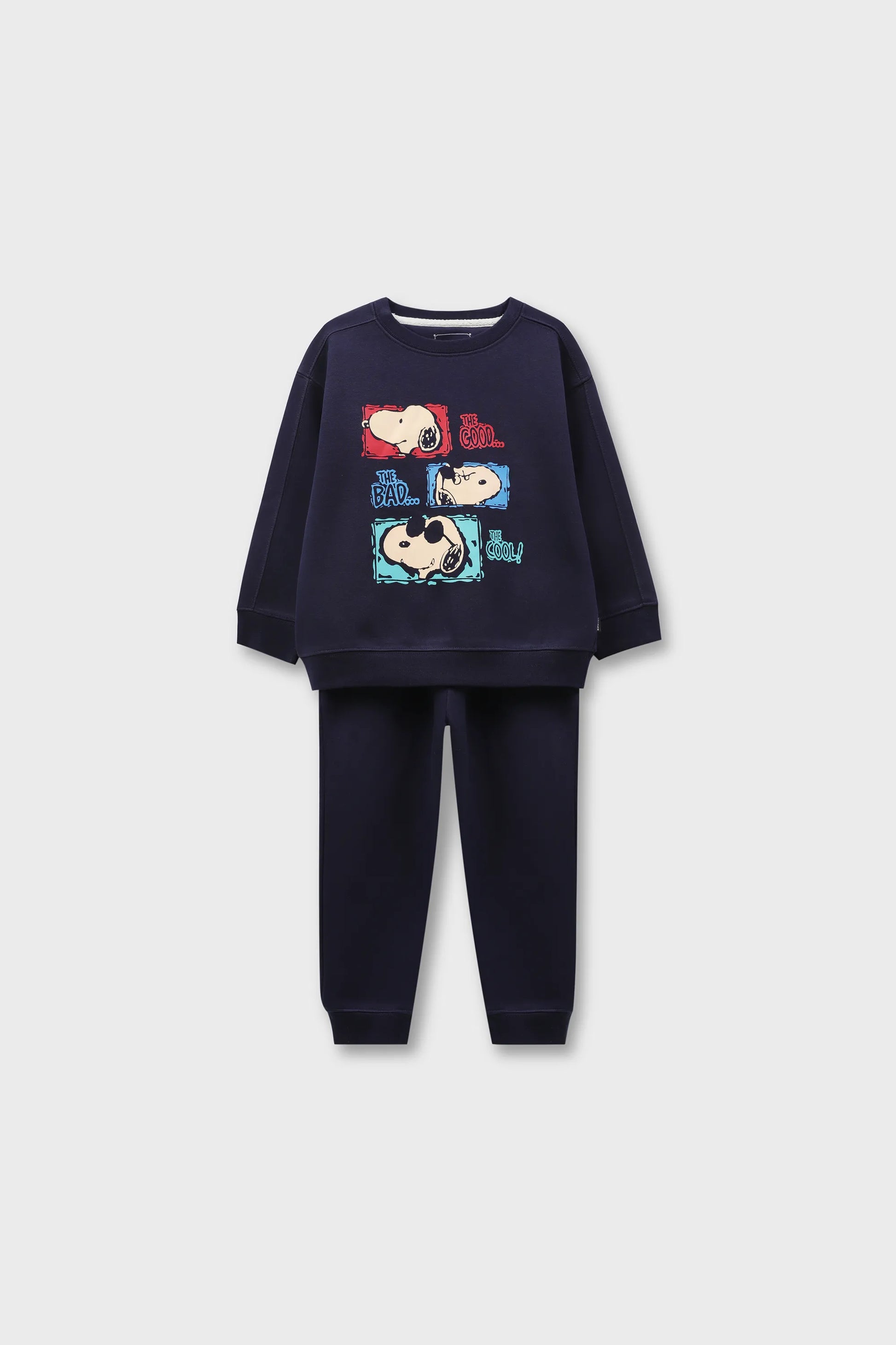 Crafted from ultra-soft fleece, this navy co-ord set keeps boys warm and stylish. The crewneck sweatshirt features a fun printed graphic with contrast panels and drop shoulders for a relaxed fit. Matching jogger trousers with drawstring waist and ribbed cuffs complete this cozy, all-day winter outfit.