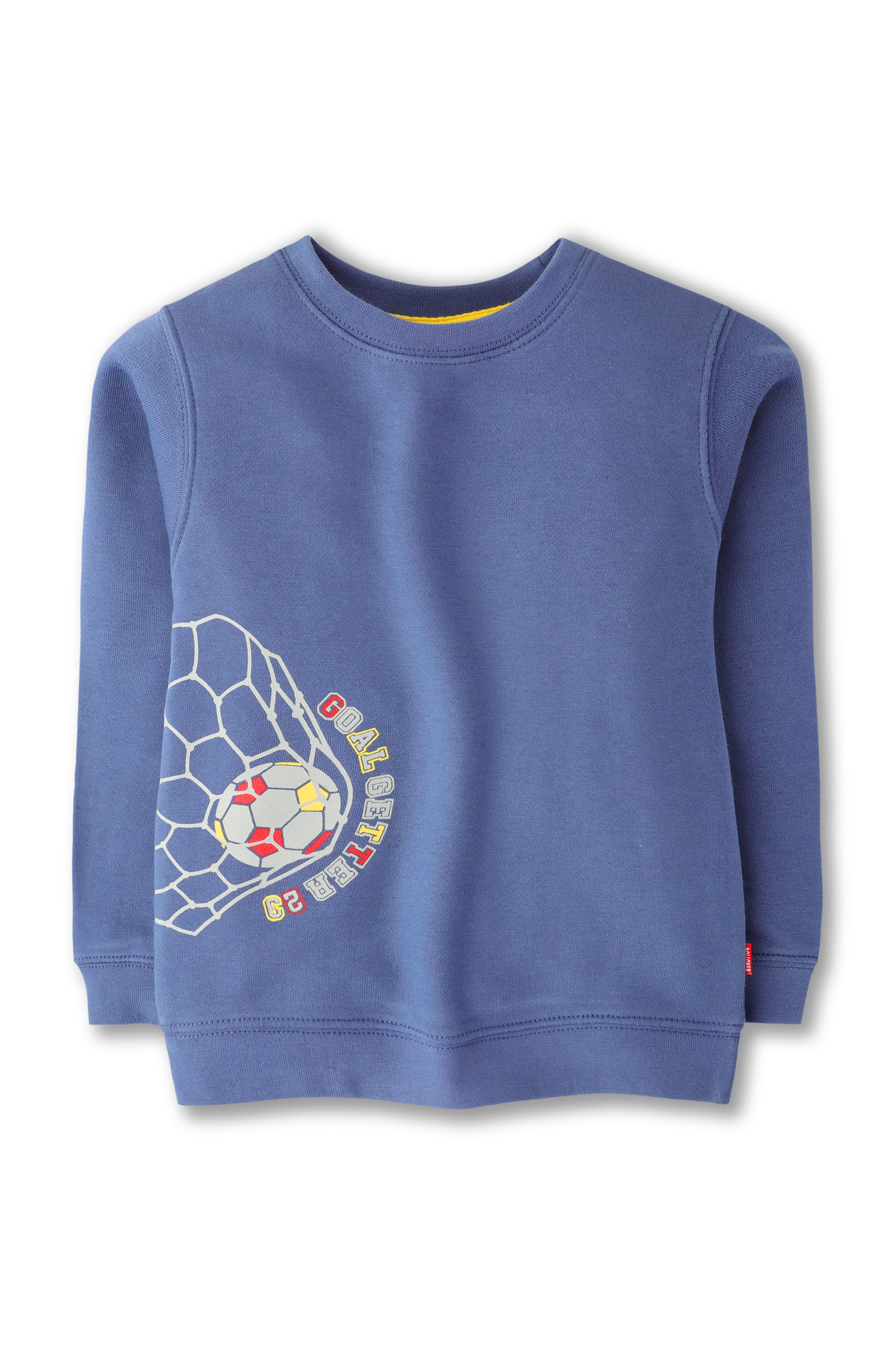 Keep your little one warm and stylish with this ink blue sweatshirt made from cozy fleece fabric. It has round crew ribbed neck, straight ribbed hem, and ribbed cuffs on full sleeves. The colourful graphics with text 'Goal Getter 29' to add a cool touch to his outfit.
