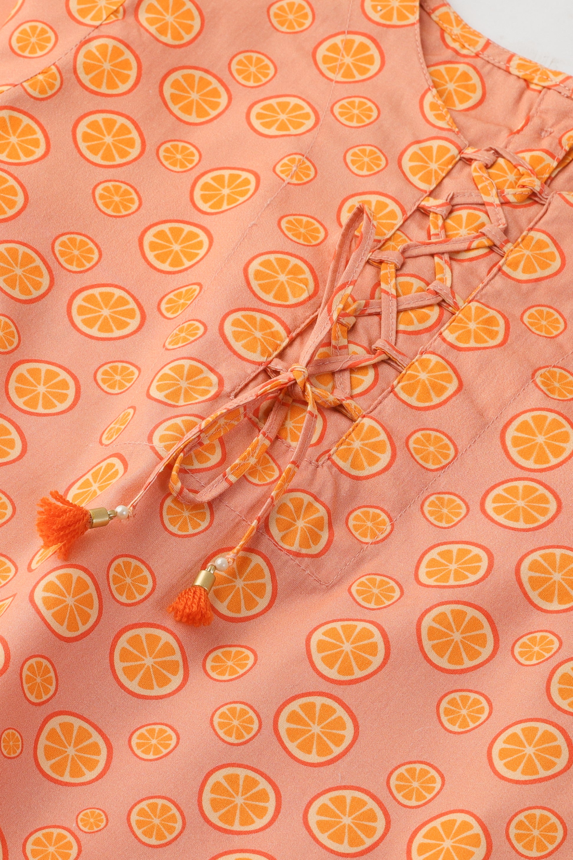 Refresh her wardrobe with this delightful girls' top. The soft cotton fabric is adorned with a vibrant citrus print, while the criss-cross detail at the neckline offers a stylish twist. Elasticized sleeves add comfort and ease, making it perfect for busy days out whether she’s at a family barbecue or enjoying a day in the park