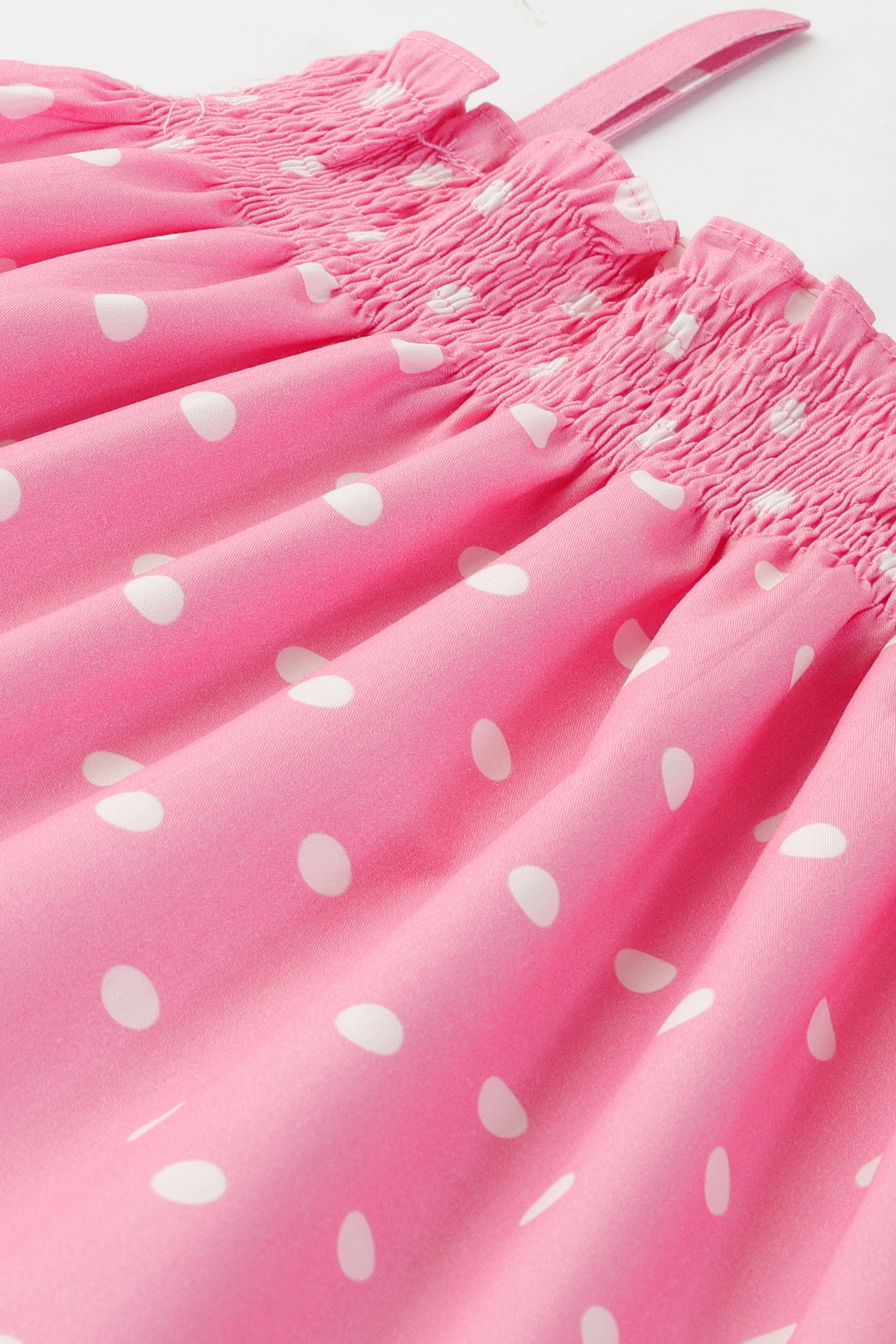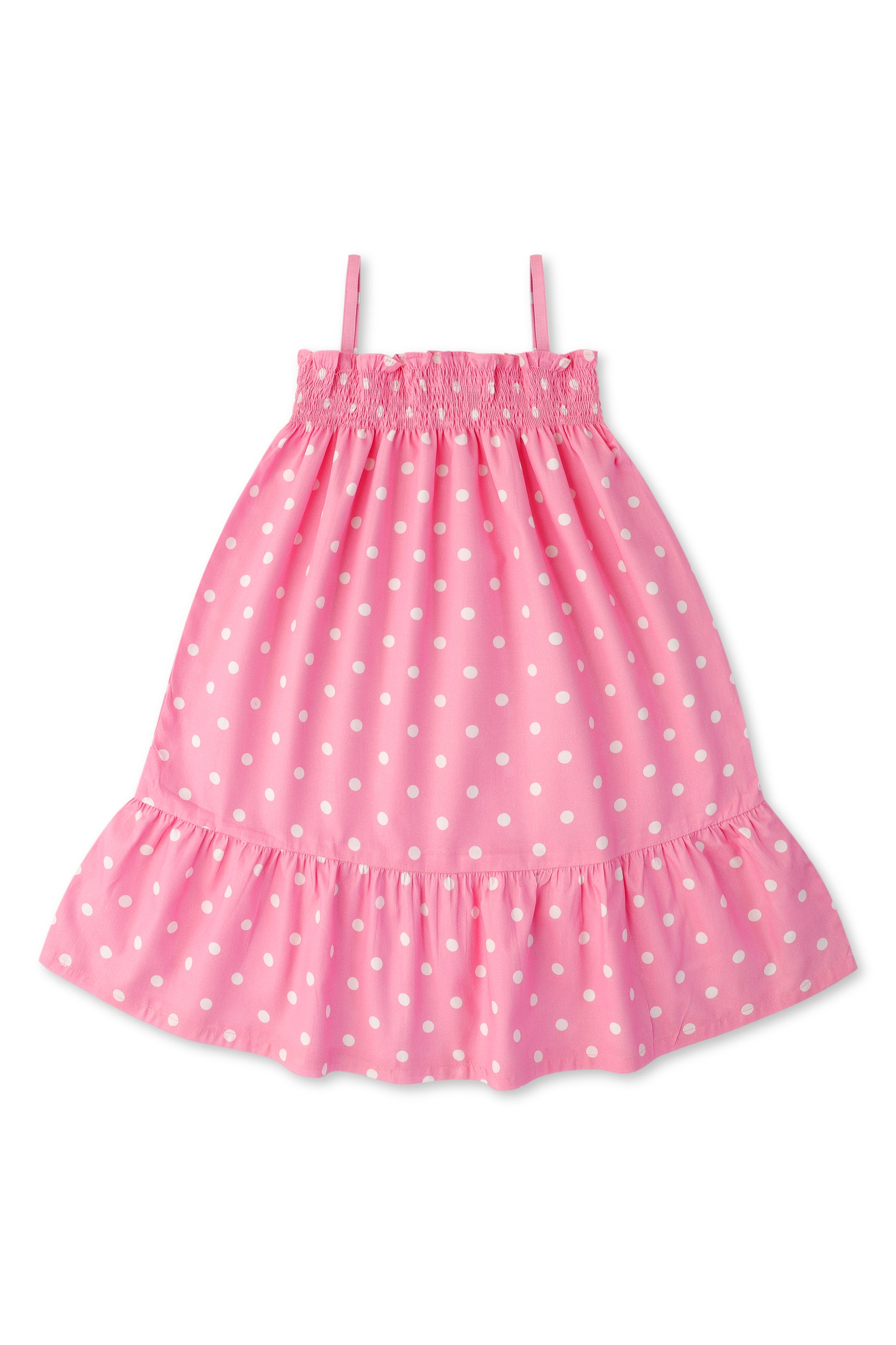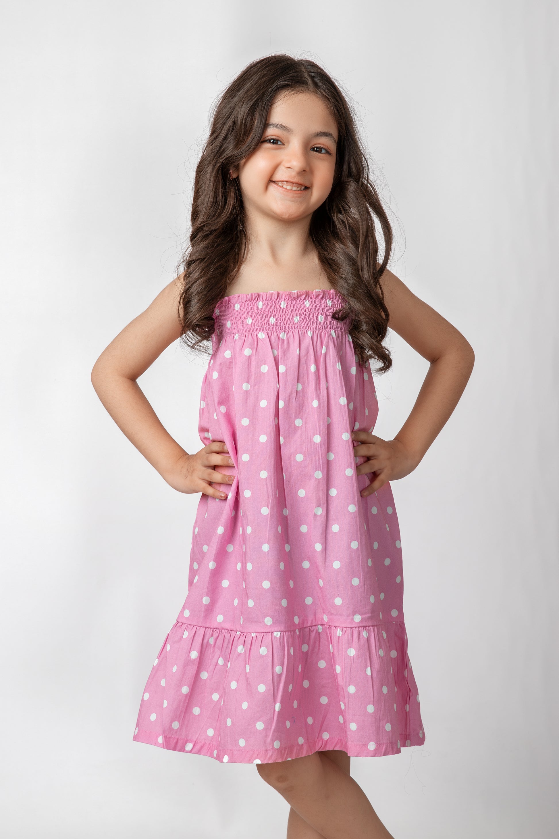 Let your little one twirl in style with the Pink Polka Smocked Cotton Dress! Designed with soft cotton fabric, this dress features a smocked bodice, delicate straps, and a gathered silhouette. The playful polka dot pattern and frilled hem add extra charm, making it a perfect pick for sunny days.