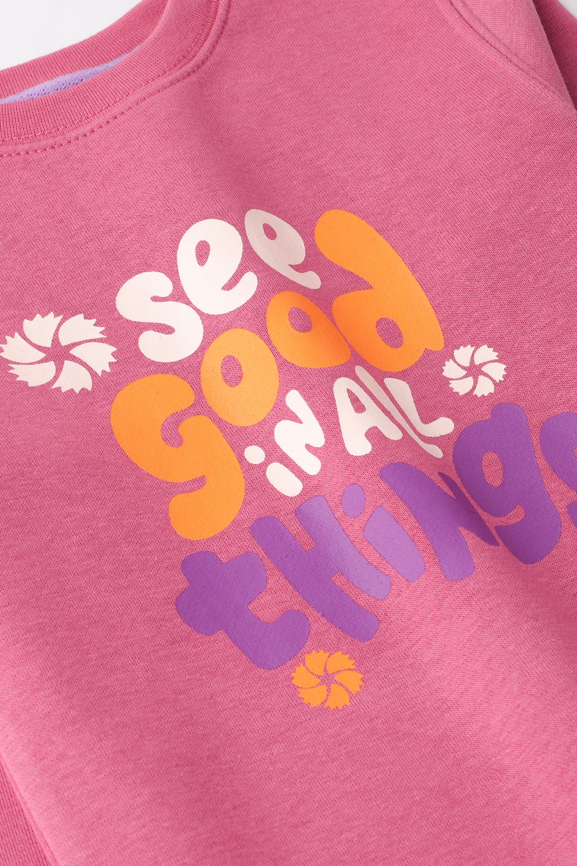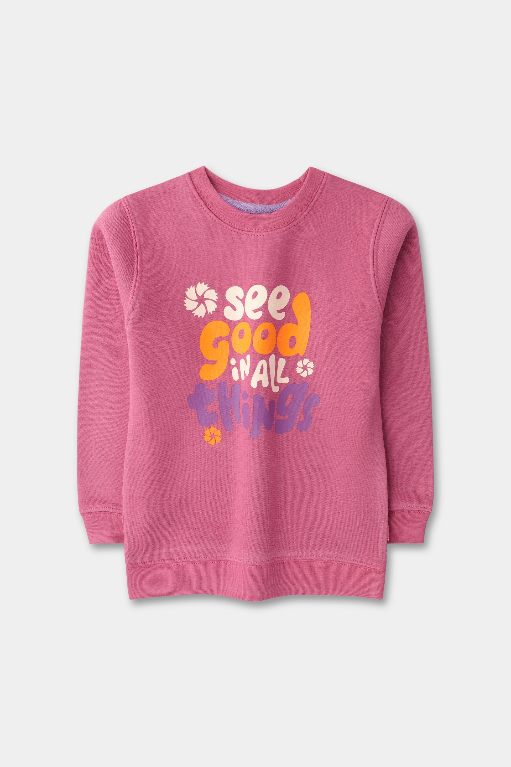 Girls Magenta Bliss Sweatshirt brings warmth and inspiration together. Made from plush fleece fabric, this sweatshirt features a dynamic “See Good in All Things” graphic in bright, playful colors. The deep magenta color and matching ribbed cuffs create a snug, stylish fit, making this sweatshirt a go-to choice for comfort and effortless style.