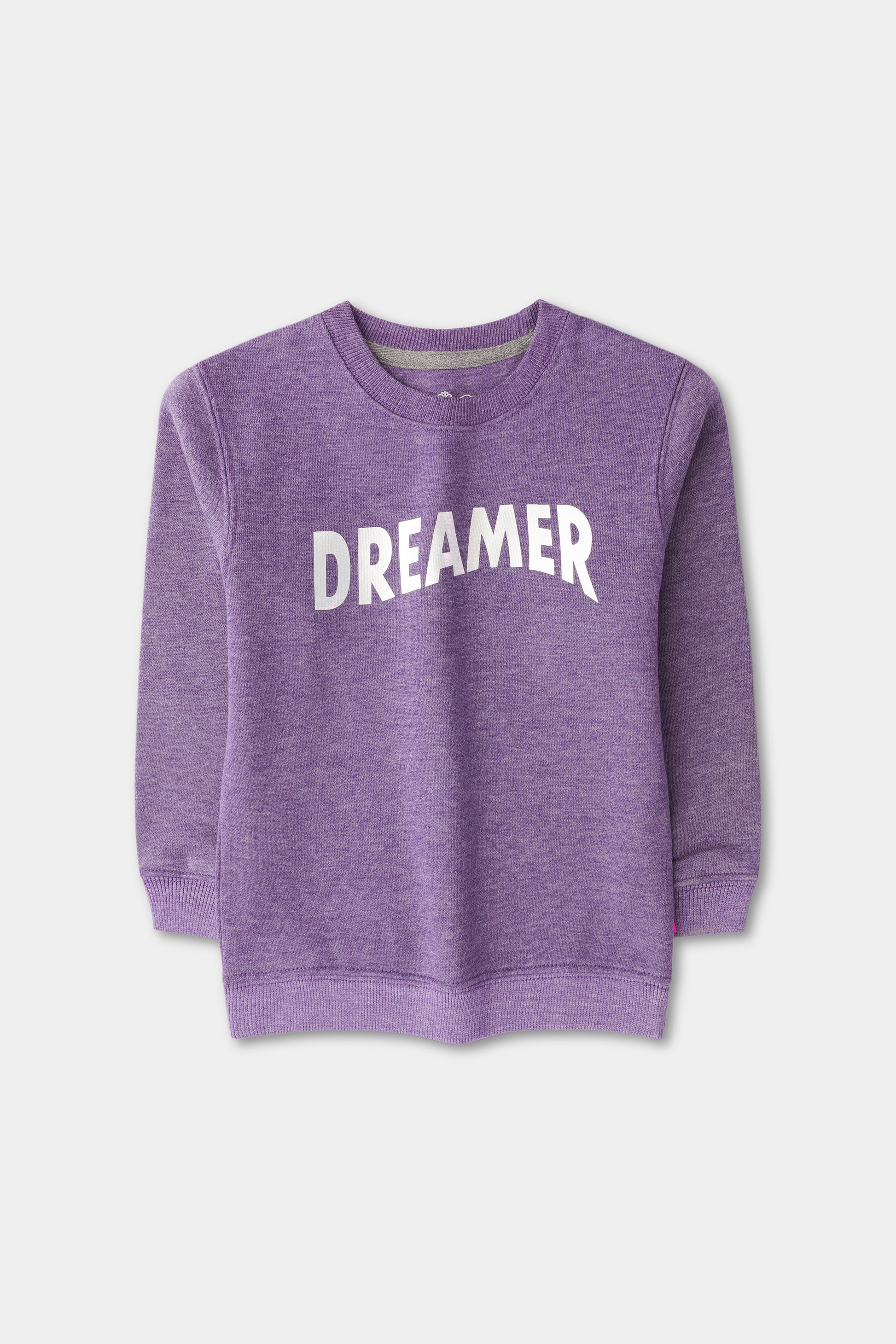 Wrap your little one in ultimate comfort with this soft, purple fleece sweatshirt. Boasting a sleek crew neckline and ribbed details at the cuffs and hem, it offers both warmth and style. The eye-catching "Dreamer" graphic in silver vinyl adds a pop of playful charm, making this top a stylish pick for weekend adventures or relaxed days at home.