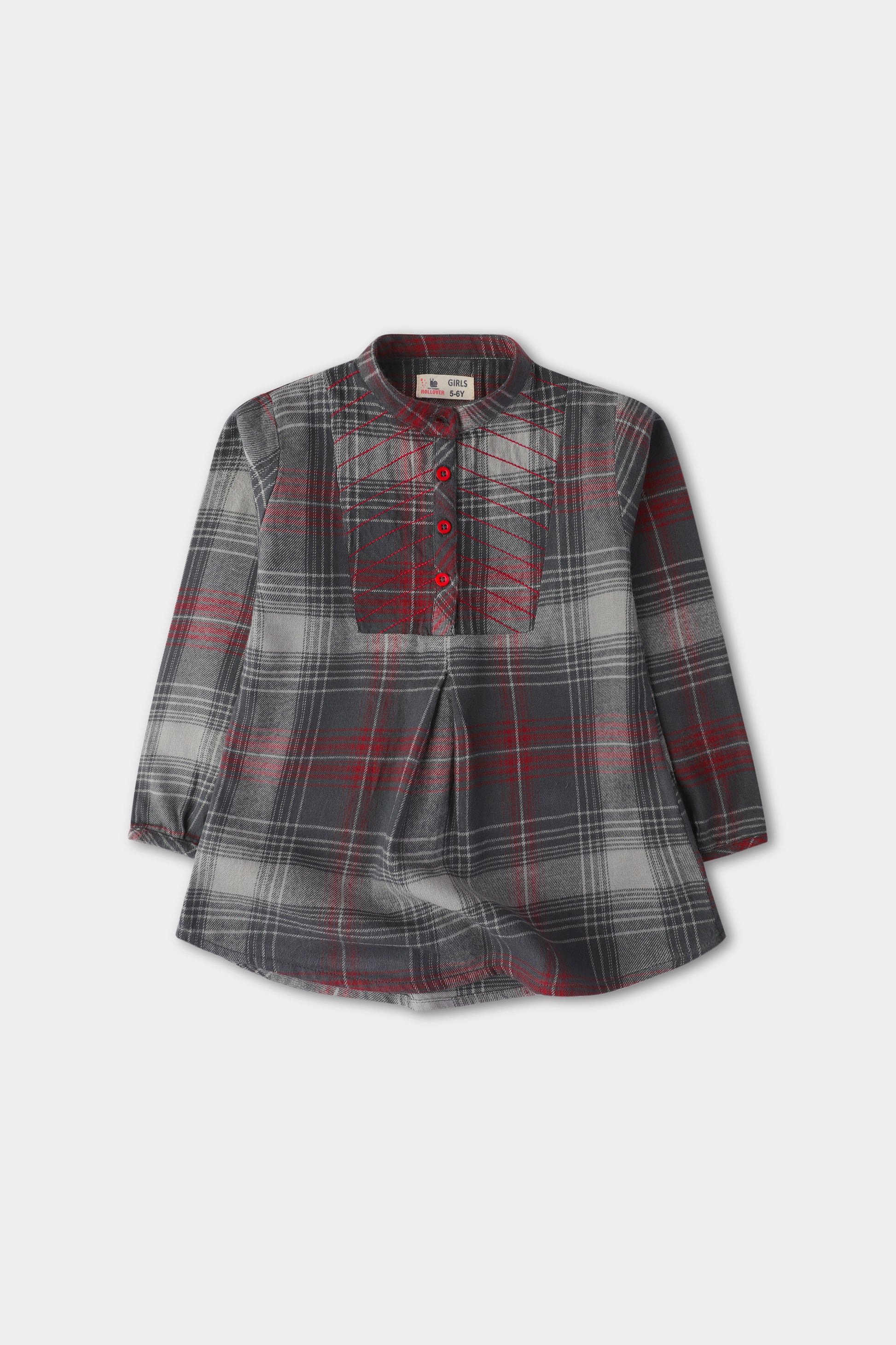 Soft and stylish, this girls' flannel tunic comes in a multi-grey check fabric. It features a chic ban neck and front button placket for a refined look. The sleeves are detailed with subtle gathers and binding, while a box pleat at the front adds structure. The slightly rounded bottom offers a modern silhouette, making this top an easy pick for everyday style.