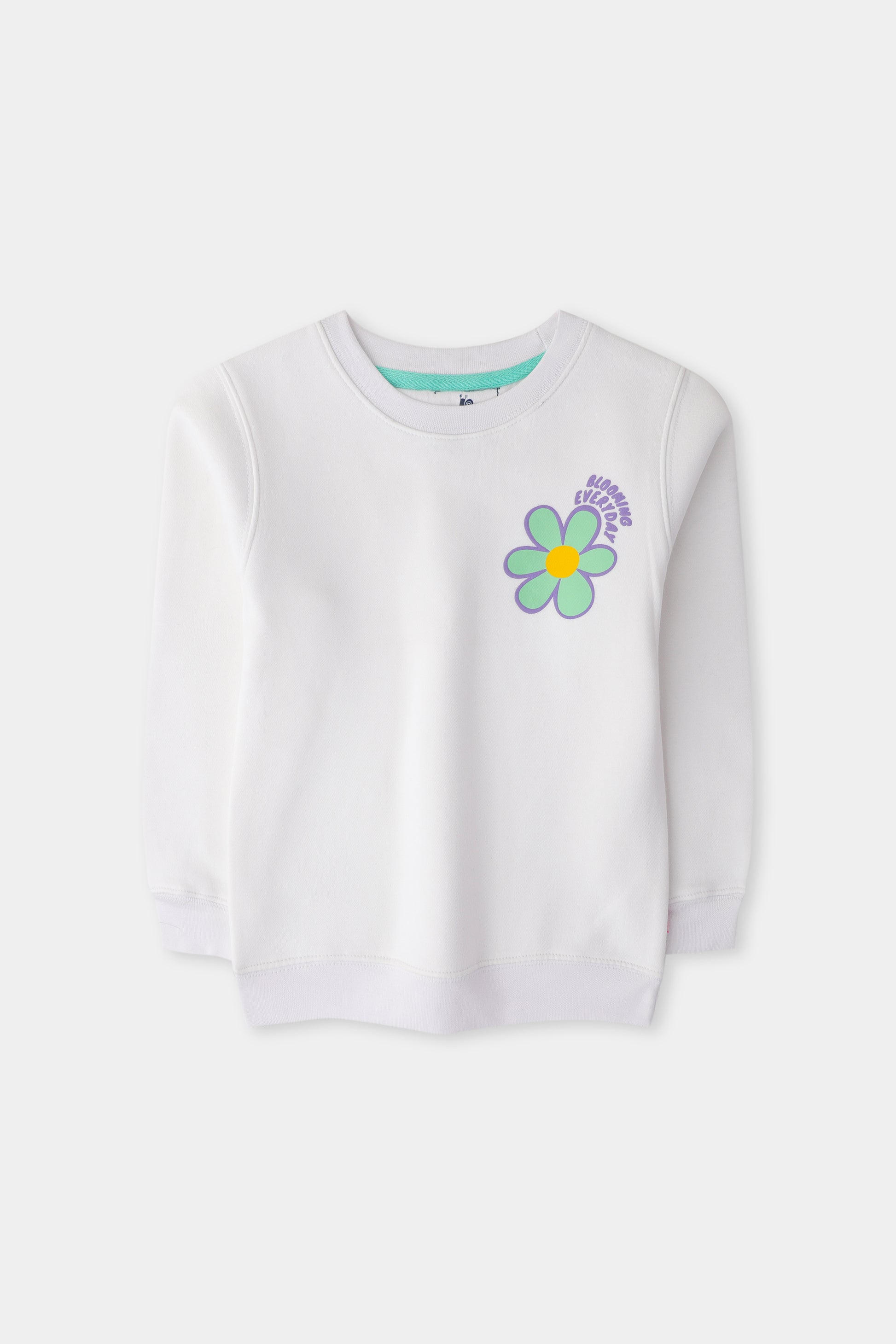 Keep warm and stylish in this white fleece sweatshirt designed with a cheerful flower graphic on the chest. Made from soft fleece fabric with ribbed cuffs and hem for a snug fit, it's perfect for layering during colder days. The charming flower motif adds a pop of color and fun, making it a must-have for your little one's wardrobe.