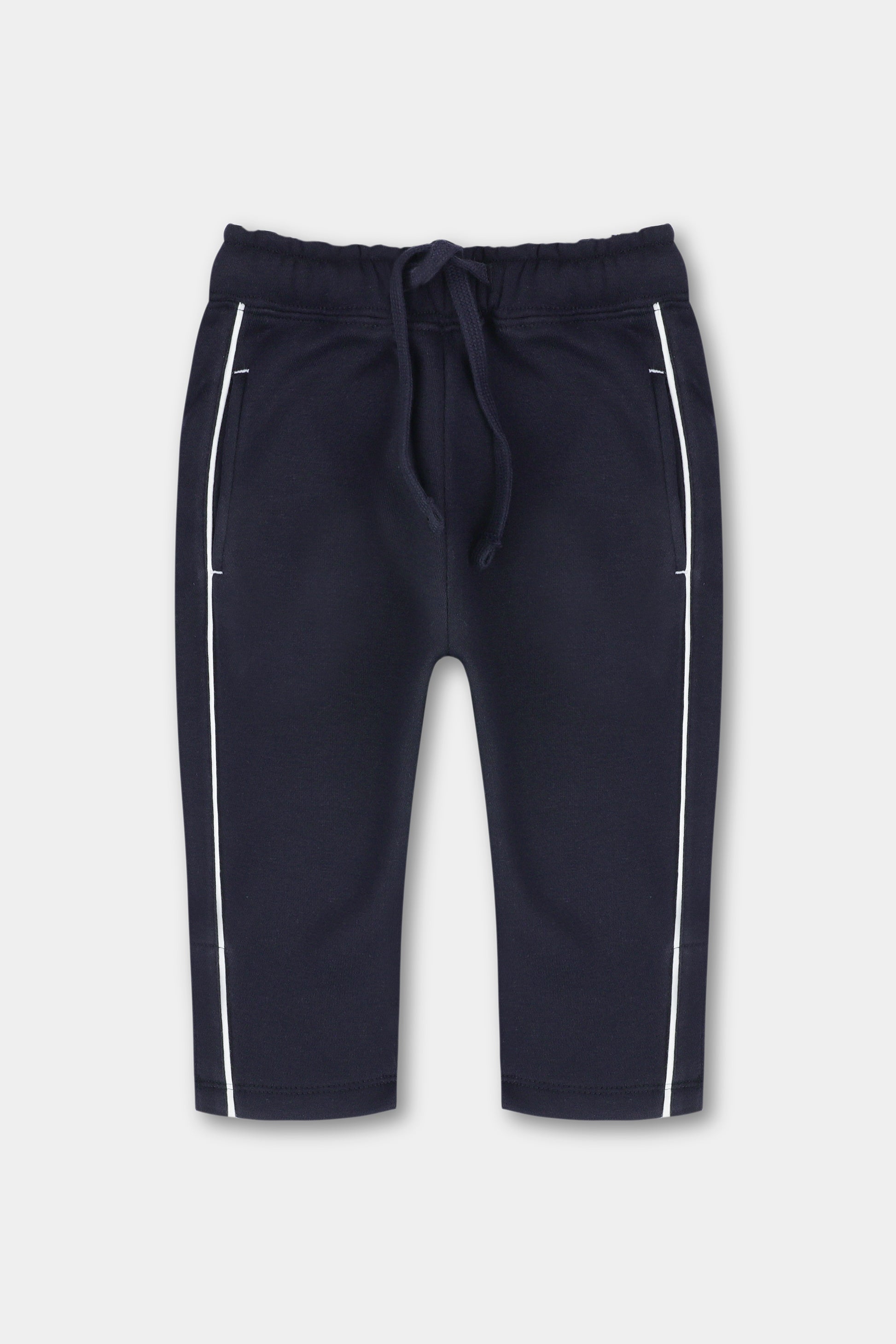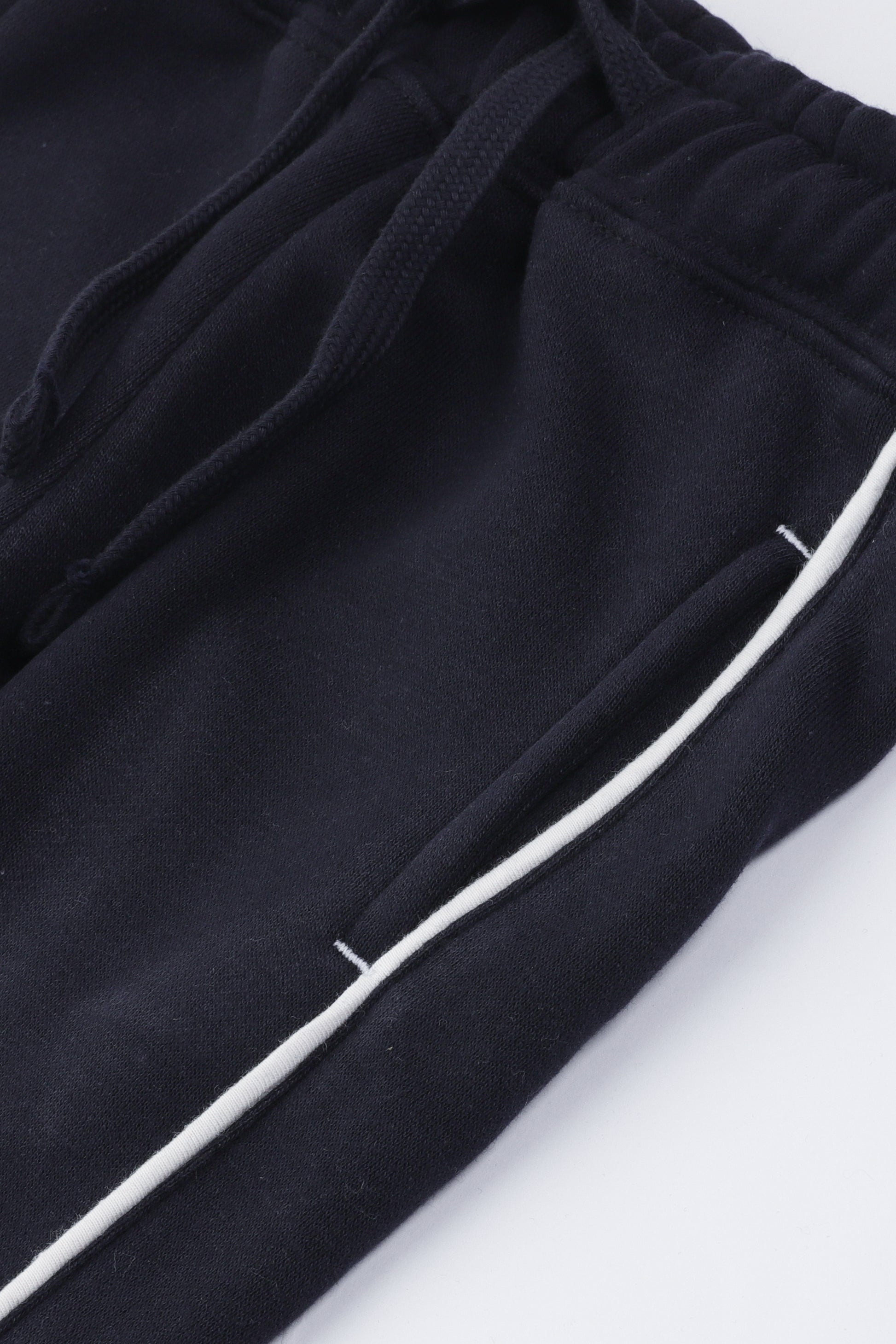Elevate everyday style with the Navy piped fleece trousers. Crafted in soft navy-blue fabric with white piping along the cut-and-sew panels, these trousers feature an elasticated waist with a drawcord, two functional side pockets, and a trendy bottom cut. Perfect for comfort and style on casual outings.