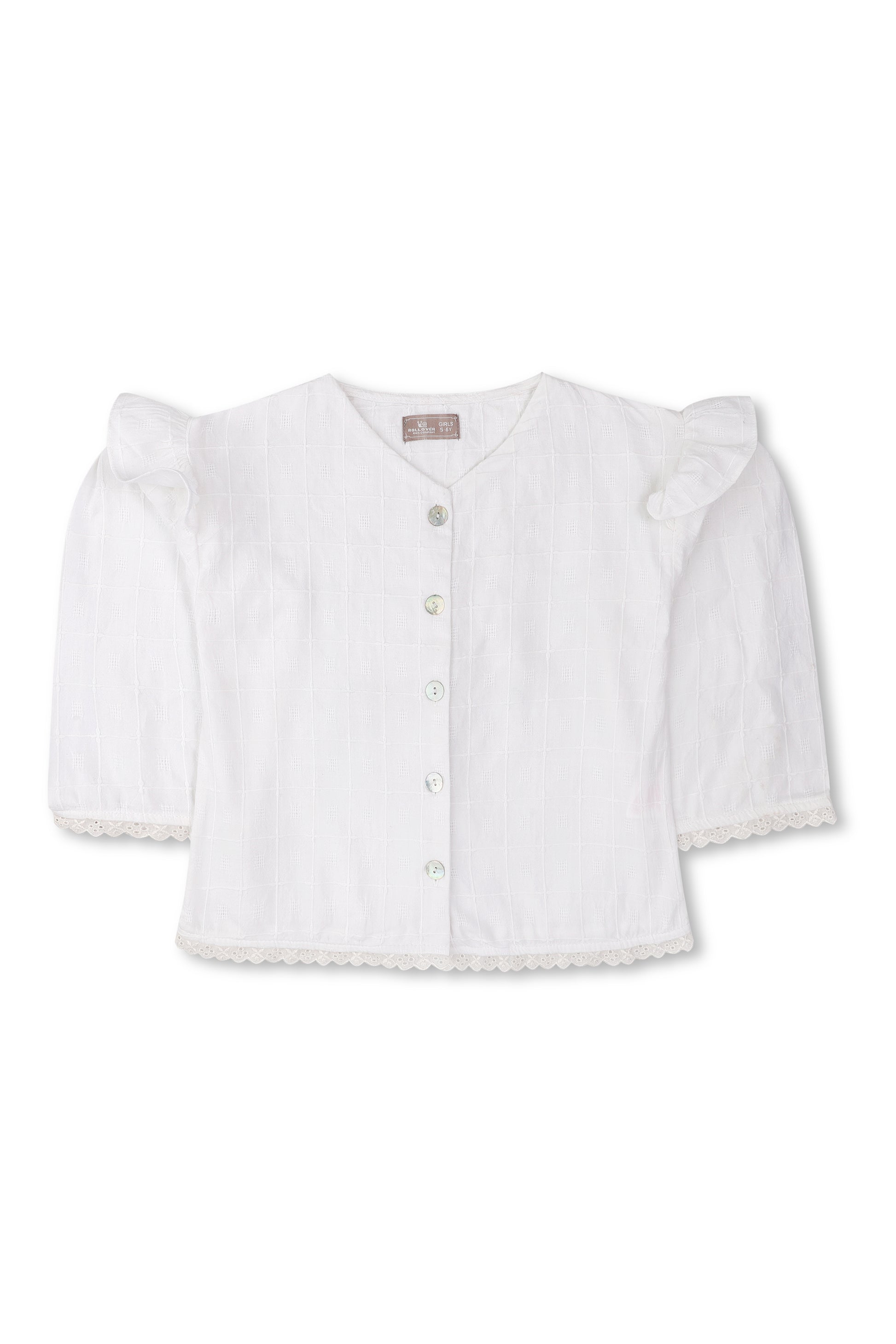 A timeless and classy white top, crafted from chicken fabric for a soft and breathable feel. Designed with full sleeves adorned with lace, a light round bottom, and a front placket with elegant shell buttons, this top is perfect for casual and formal occasions alike.