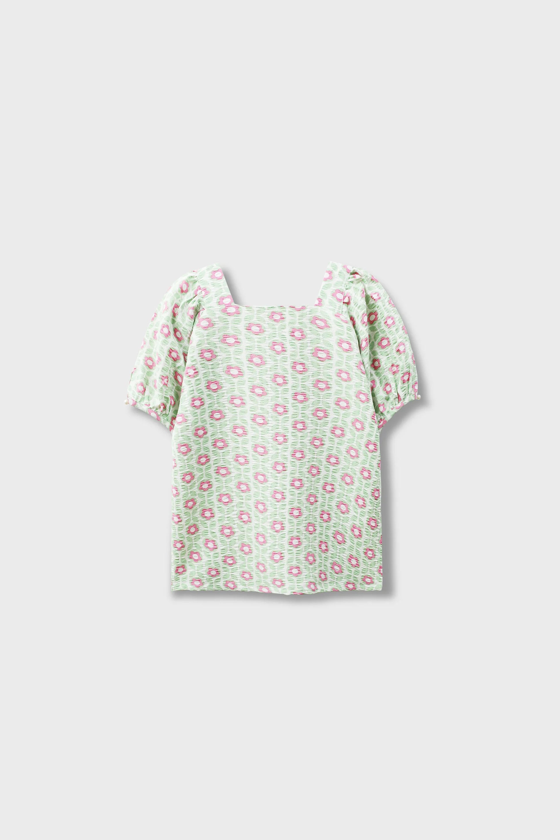 Bright, cheerful, and comfy. This cotton top features a white base with green leaf patterns and pink floral prints. Designed with gathered puff sleeves and a square neckline, it offers a playful, breezy look perfect for summer days, casual outings, or everyday comfort.