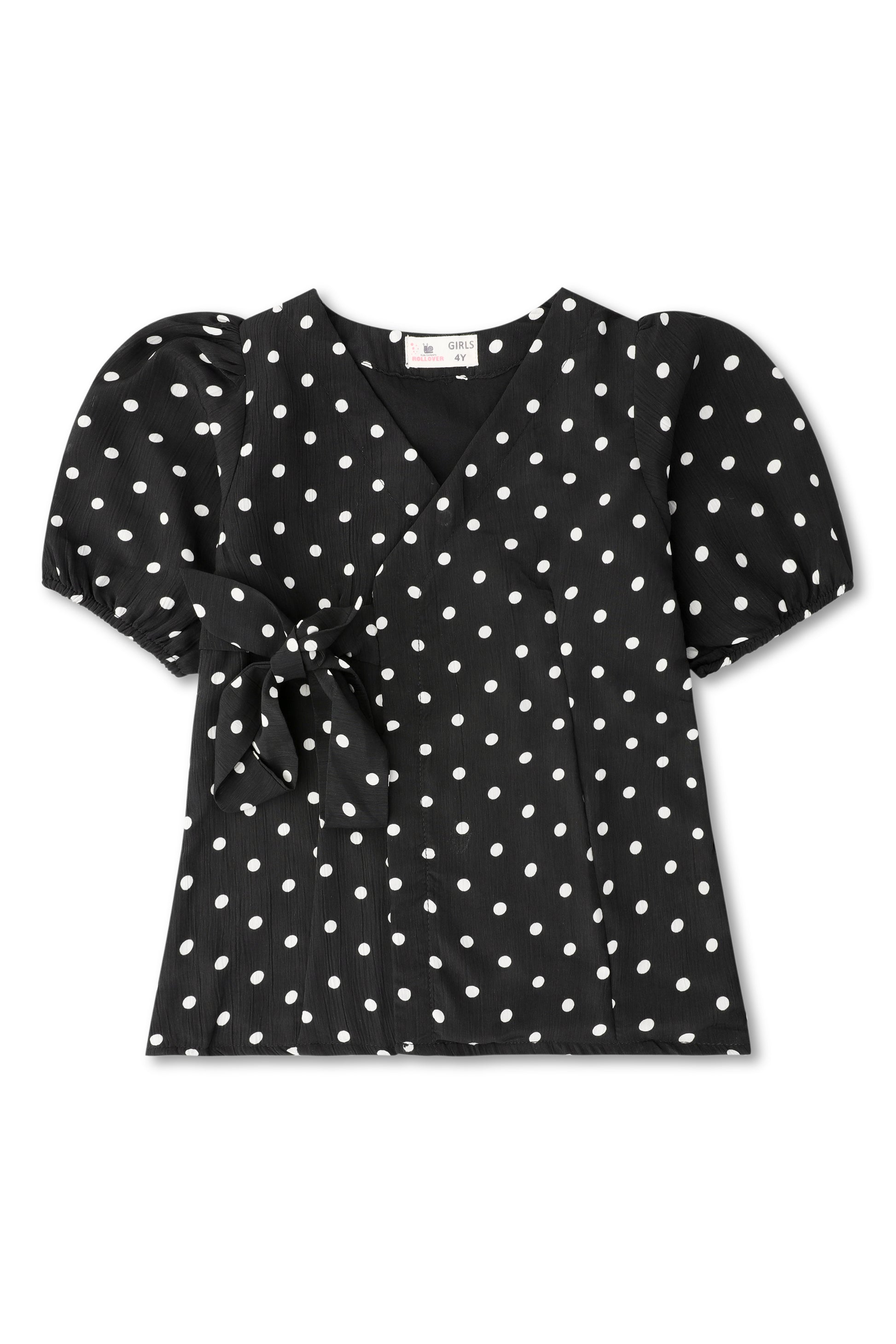Let your little one shine in the Black Dotted Chiffon Top! Made from soft chiffon, this trendy top features a wrap-style V-neck, snap button closure, and elasticated sleeves for a comfortable fit. The polka dot print and straight hem create a chic and fashionable look, perfect for outings and special events.