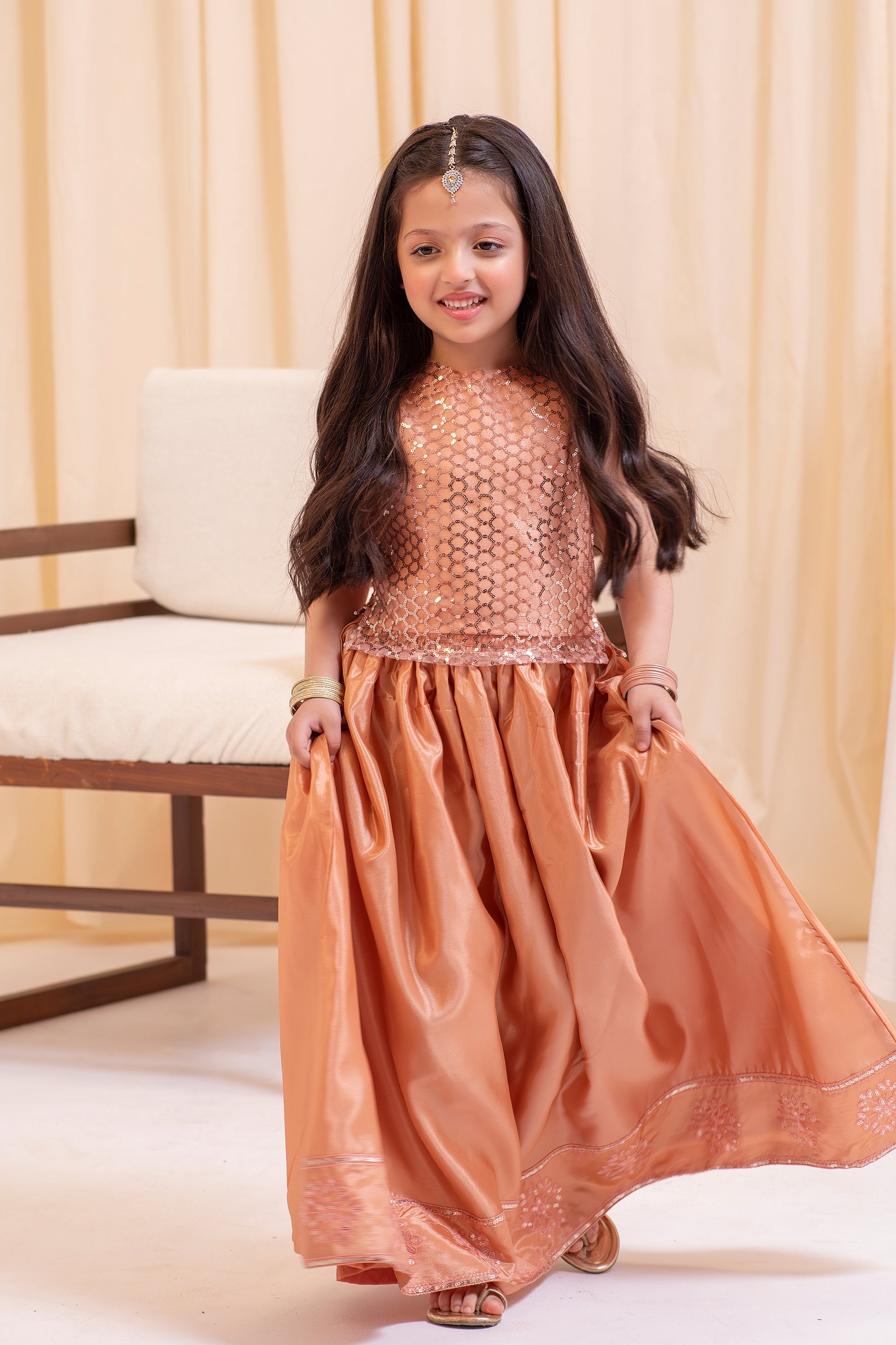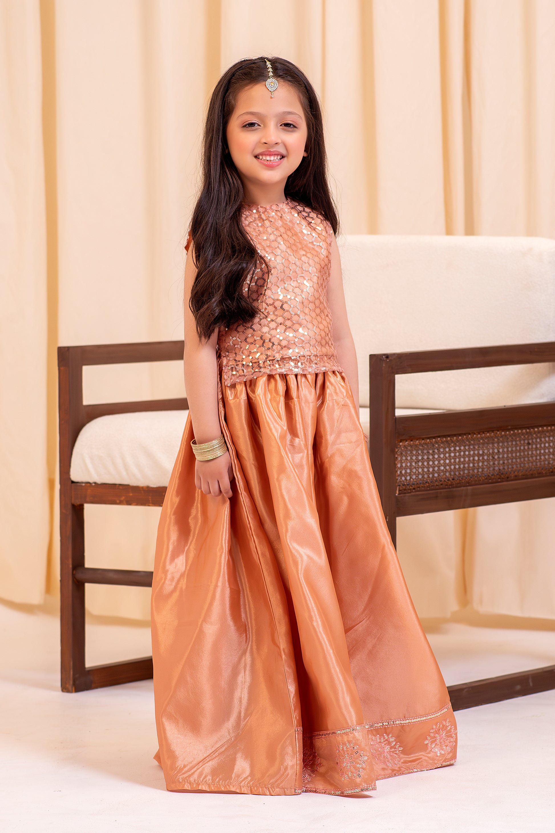 Exude grace and charm in the Sequence Embellished Lehnga Set. This light peach katan silk lehenga is a statement of sophistication, complemented by a fancy net kurti with shimmering sequin embellishments. The inner katan silk lining provides a luxurious feel, making this outfit the ultimate choice for festive occasions, weddings, and traditional celebrations.