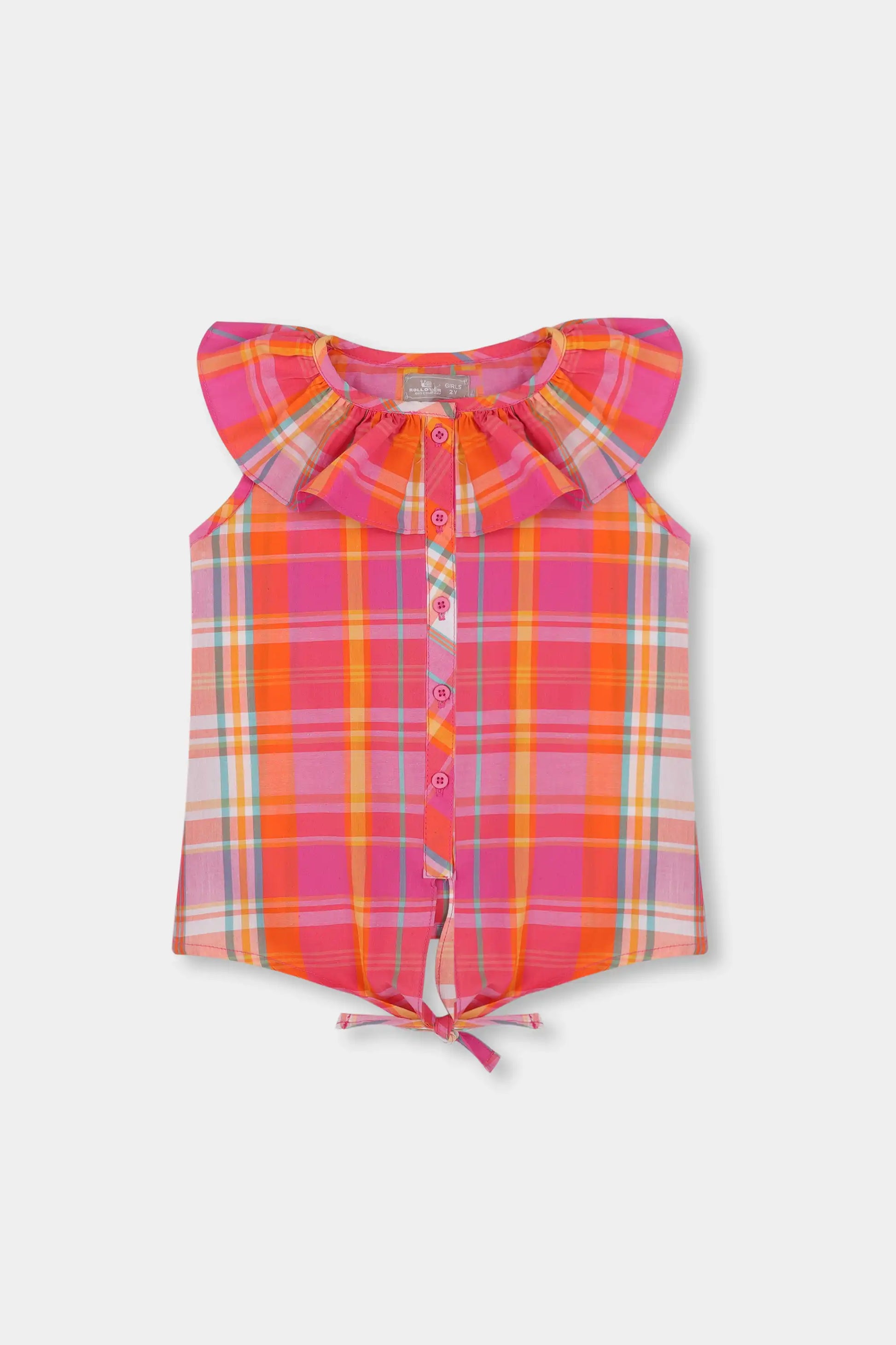 A delightful blend of style! This orange plaid cotton top features an adorable frilled collar, functional buttons, and a tie-front detail that adds a touch of playfulness. Its sleeveless design makes it a great choice for warm days, keeping her looking fresh and fabulous.