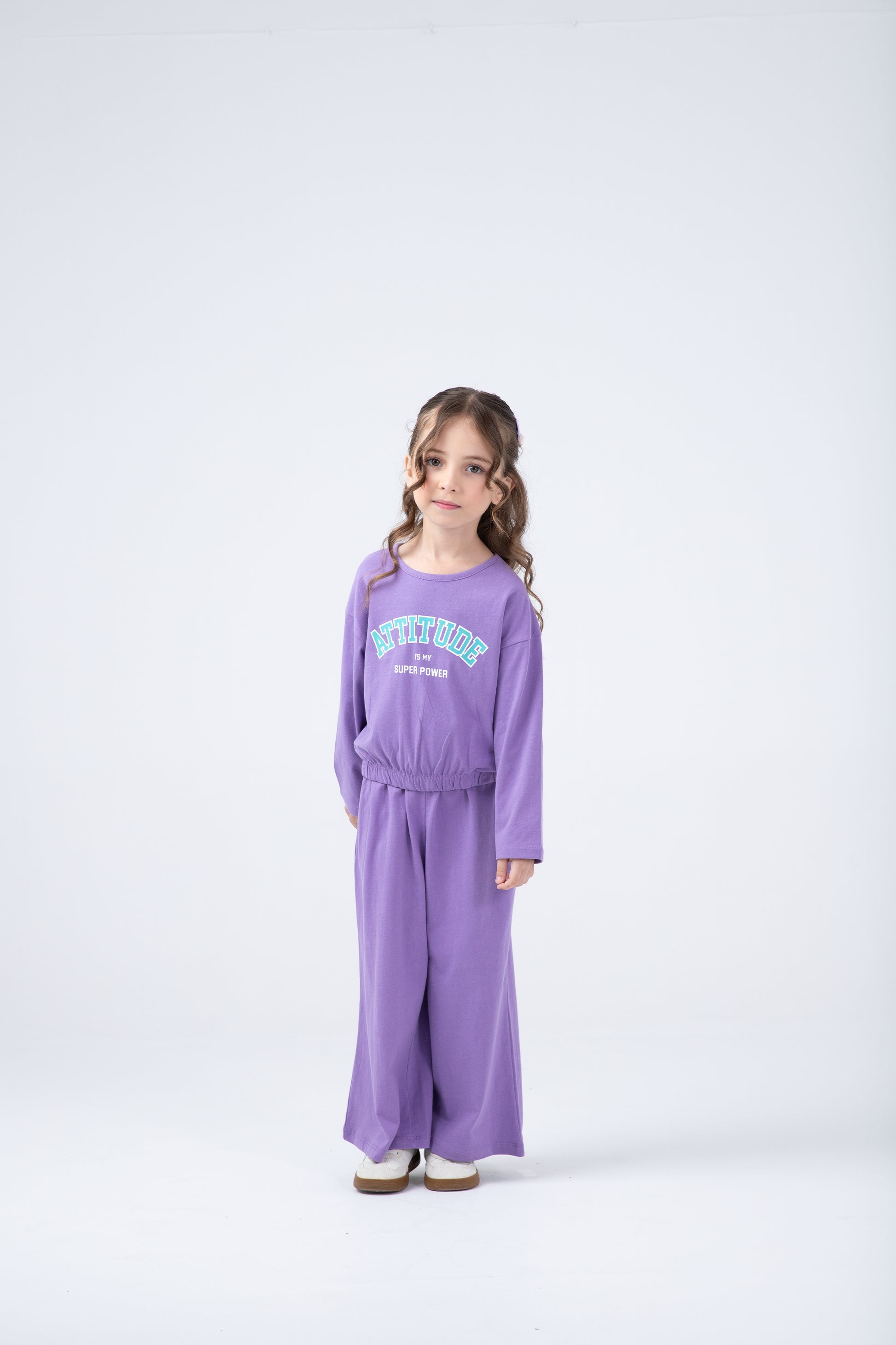 Own every room in this bold lilac co-ord set. The cropped tee features drop shoulders, a gathered hem, and a confident “Attitude is my Super Power” print. Paired with soft wide-leg trousers in matching heavy jersey, it’s comfort and coolness all wrapped in one empowering outfit.