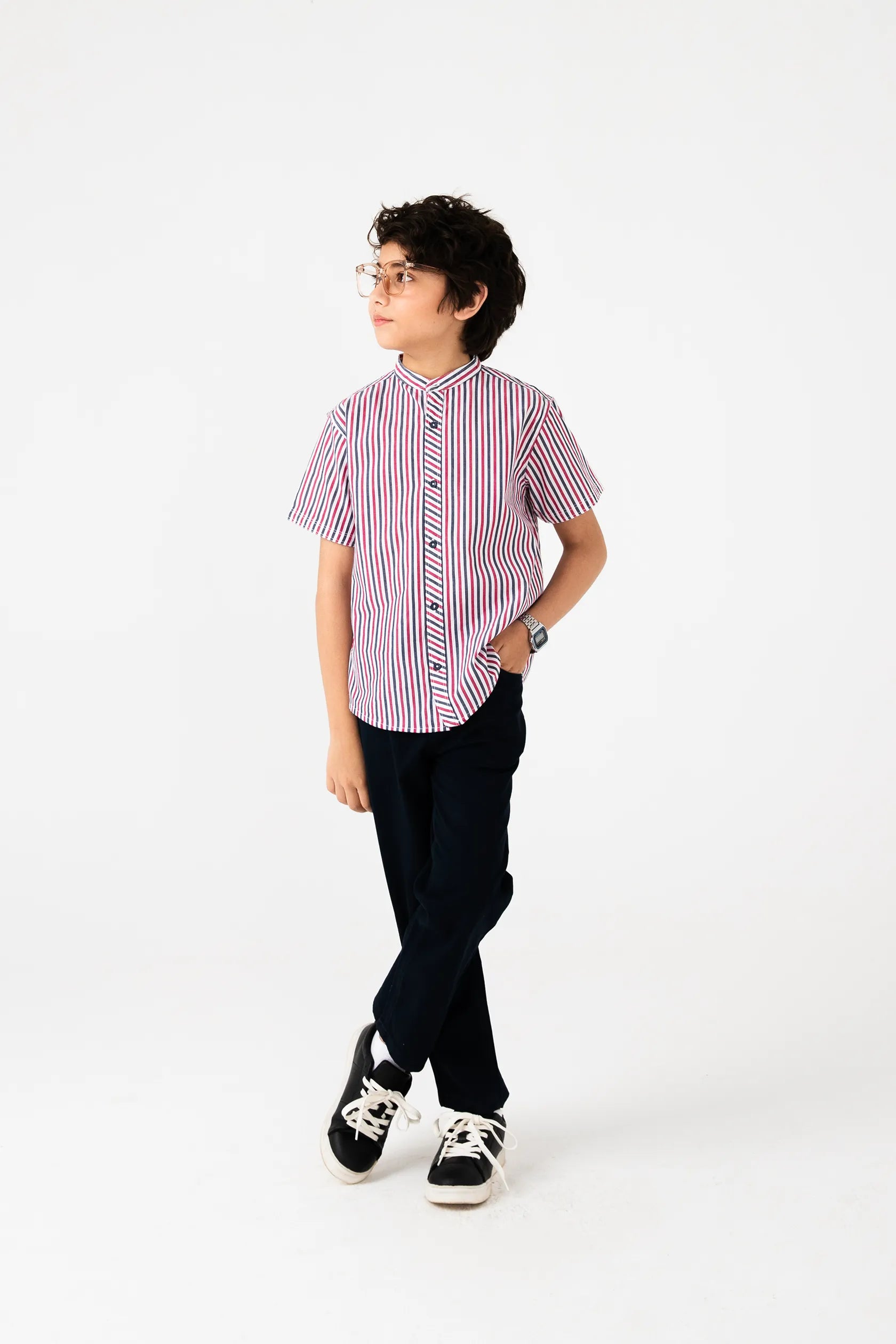 Get ready to turn heads with this bold red and white striped shirt. Featuring a stylish diagonal placket and black buttons, this shirt is ideal for any casual occasion. With its sharp fit and clean lines, it’s a must-have for the young, trend-conscious dresser.