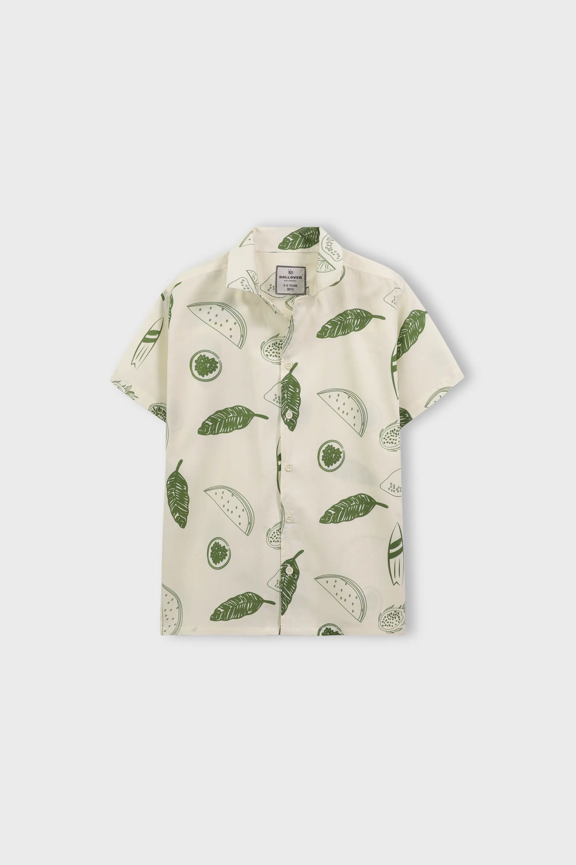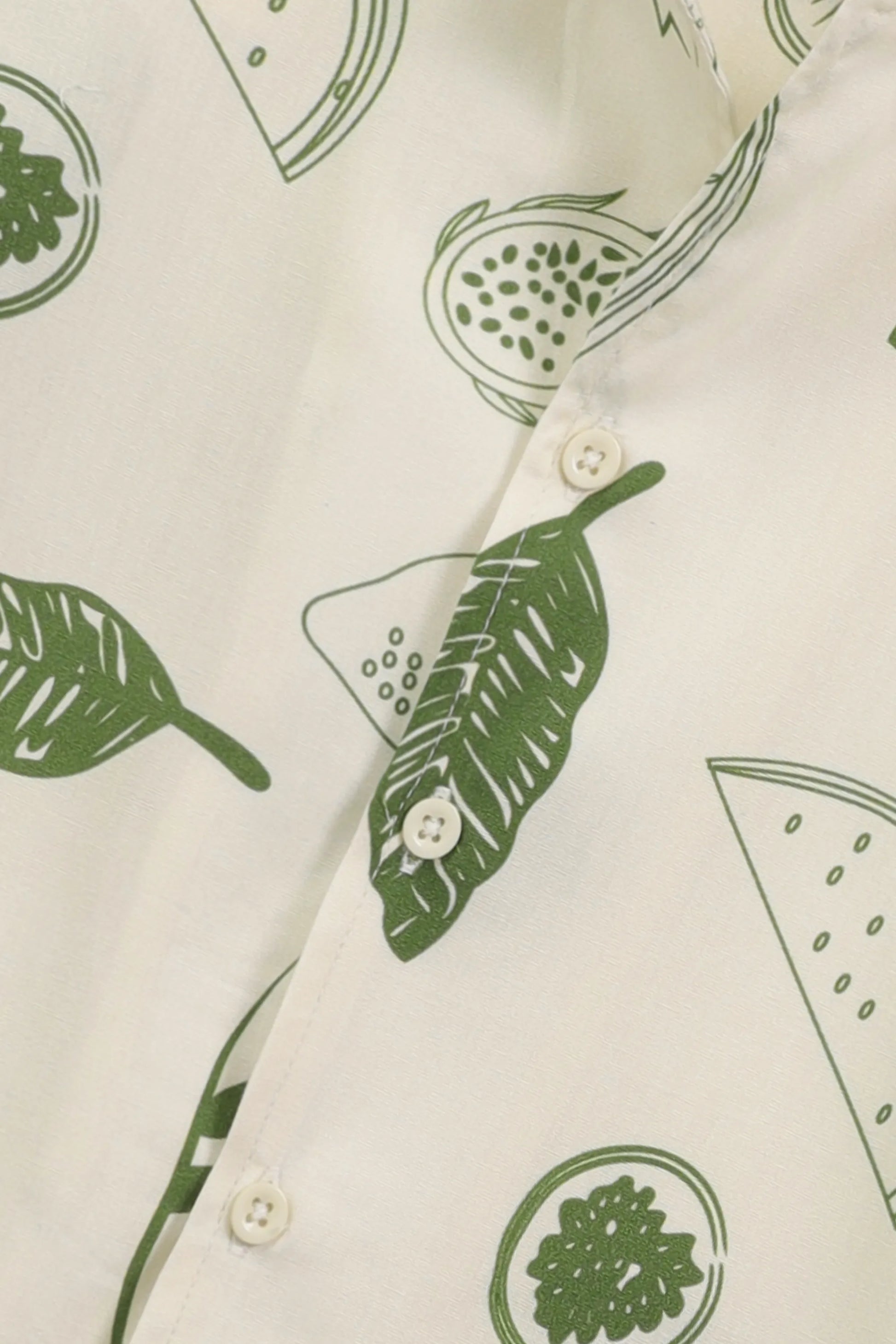 A charming casual shirt designed in breathable cotton with an off white cream tone. The playful fruit and leaf illustrations add a lively touch, while the classic button front and short sleeves ensure timeless appeal. Ideal for casual wear, family outings, and warm season styling.