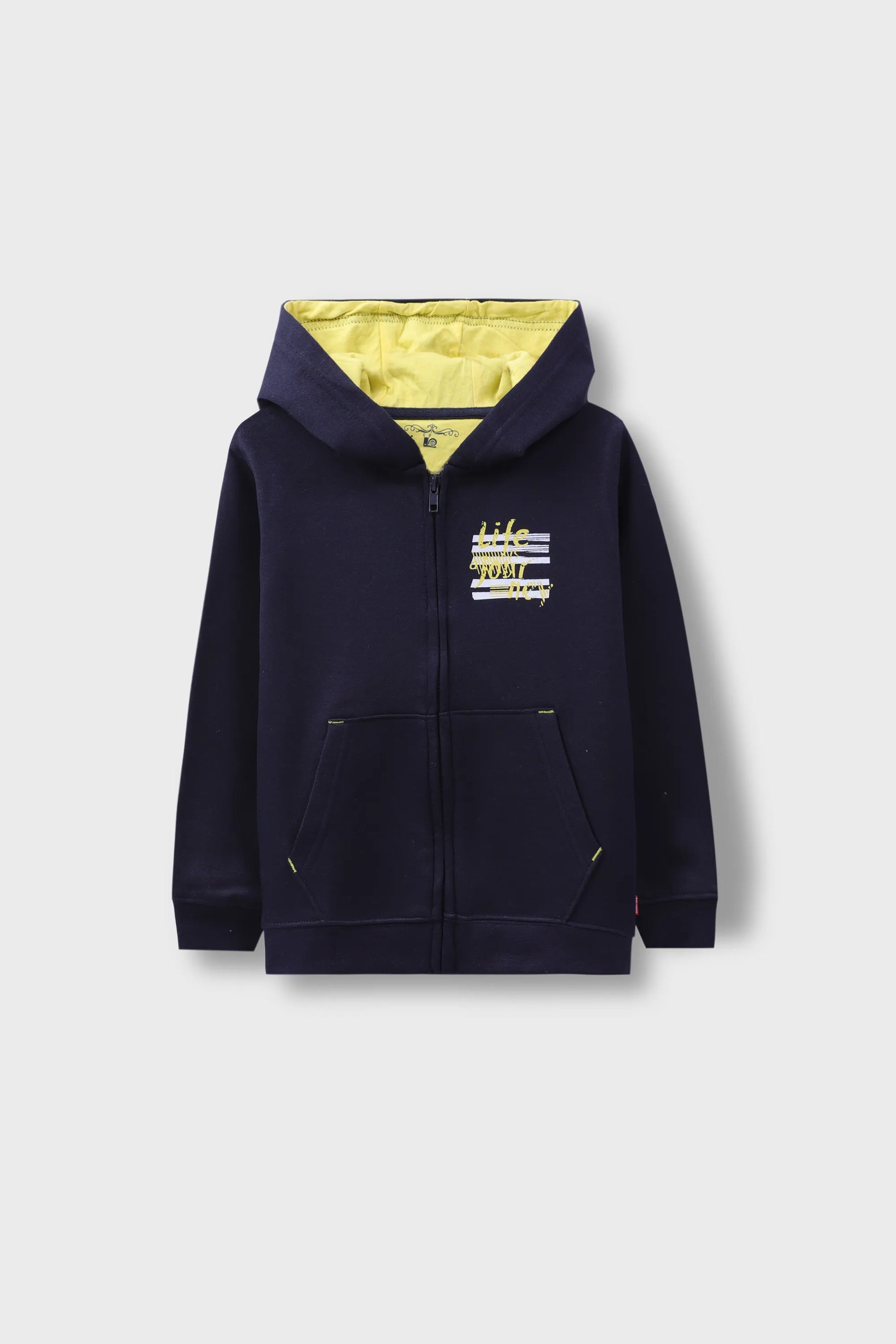 This fleece hoodie in navy blue comes with a hood, full front zipper, ribbed hem and cuffs, and two front split pockets. It showcases a 'Life is a journey' graphic print.