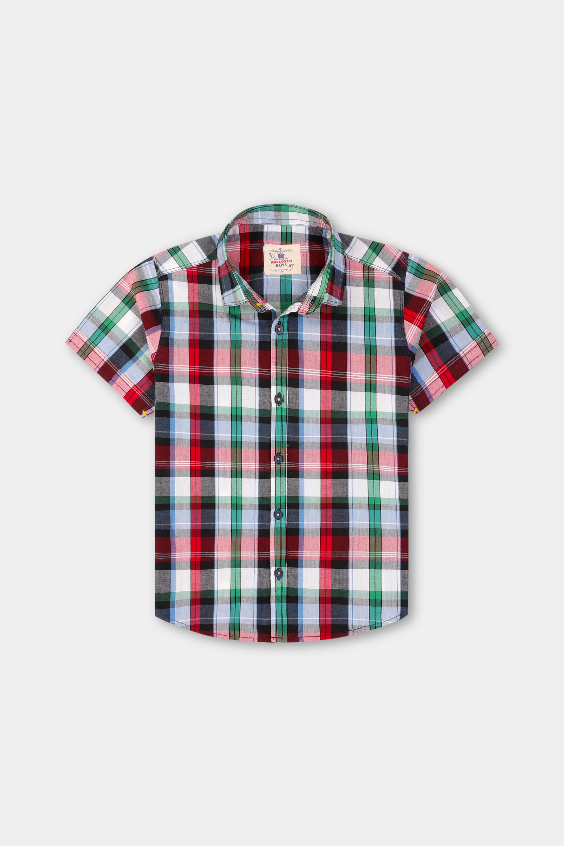 Crafted from soft, breathable cotton, this short-sleeved shirt showcases a bold multicolor plaid in red, green, black, and blue. A classic collar and full button-down front keep the look polished yet playful—perfect for everything from school days to weekend outings. A standout staple for the modern young gent.