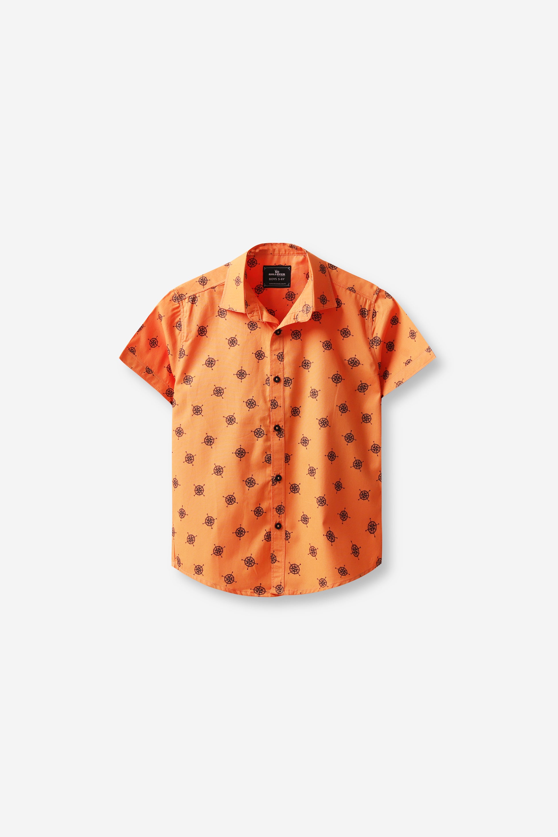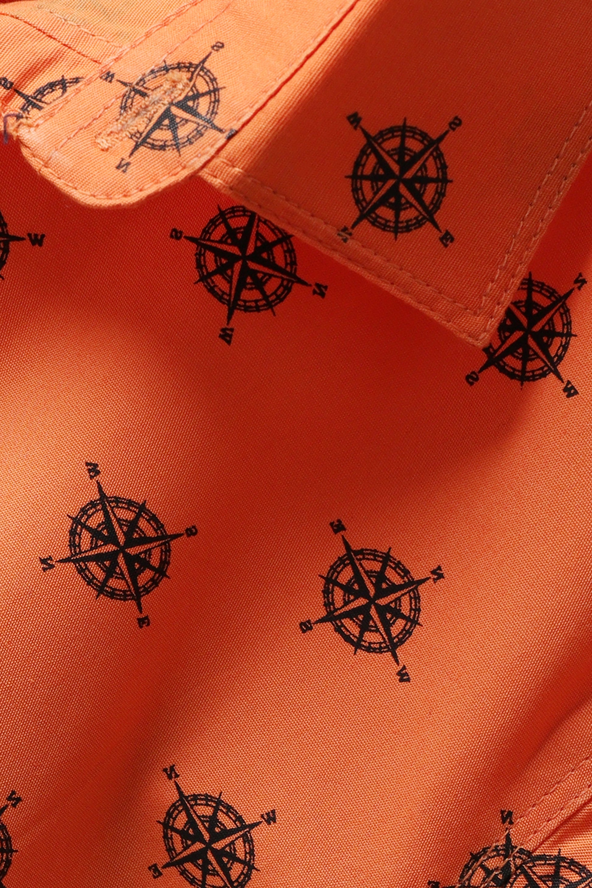 This boys orange cotton shirt features an all over navy compass print. Designed with a crisp collar, button front, and short sleeves. Lightweight and breathable, perfect for casual days, outings, and summer adventures. A playful blend of nautical style and everyday comfort.