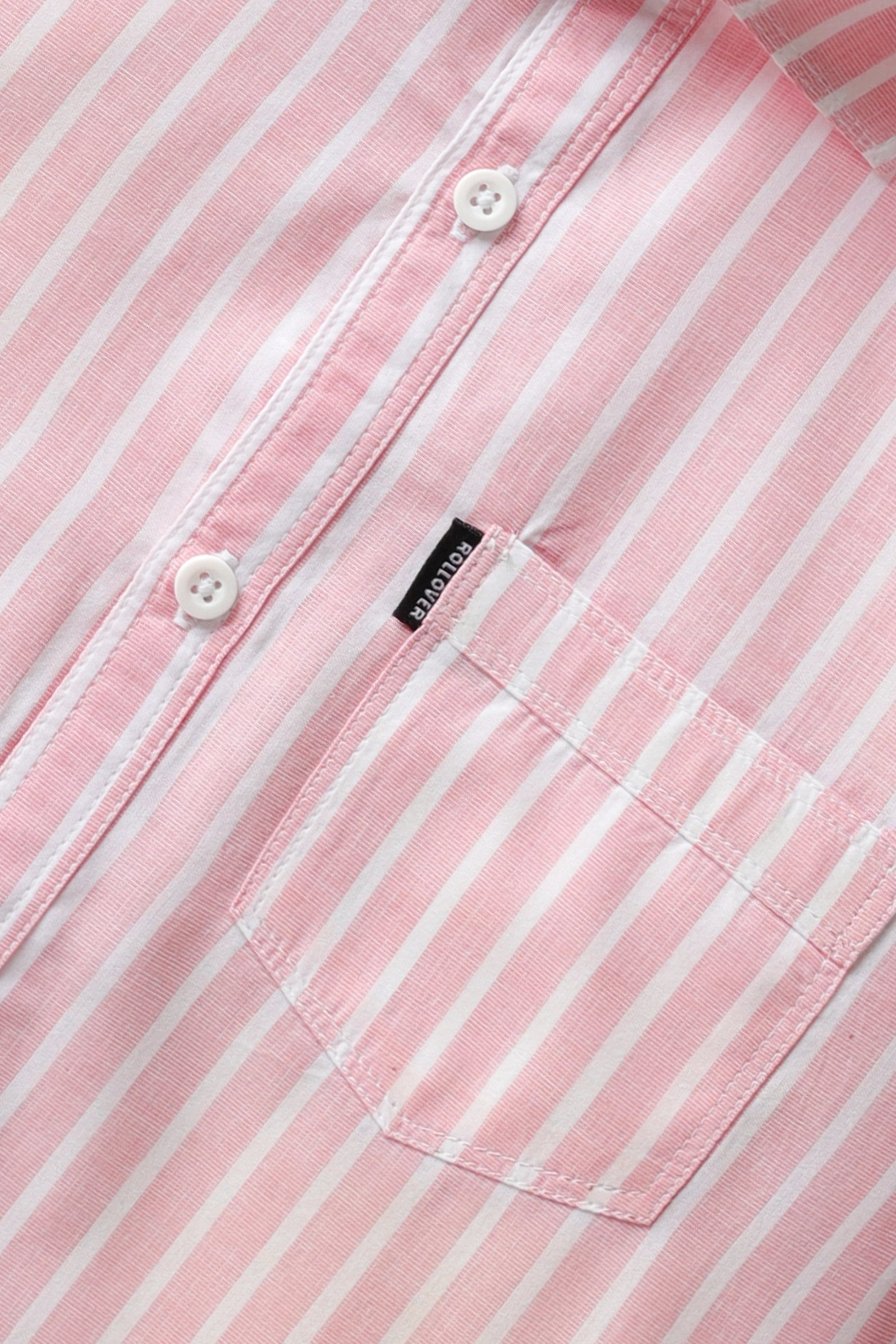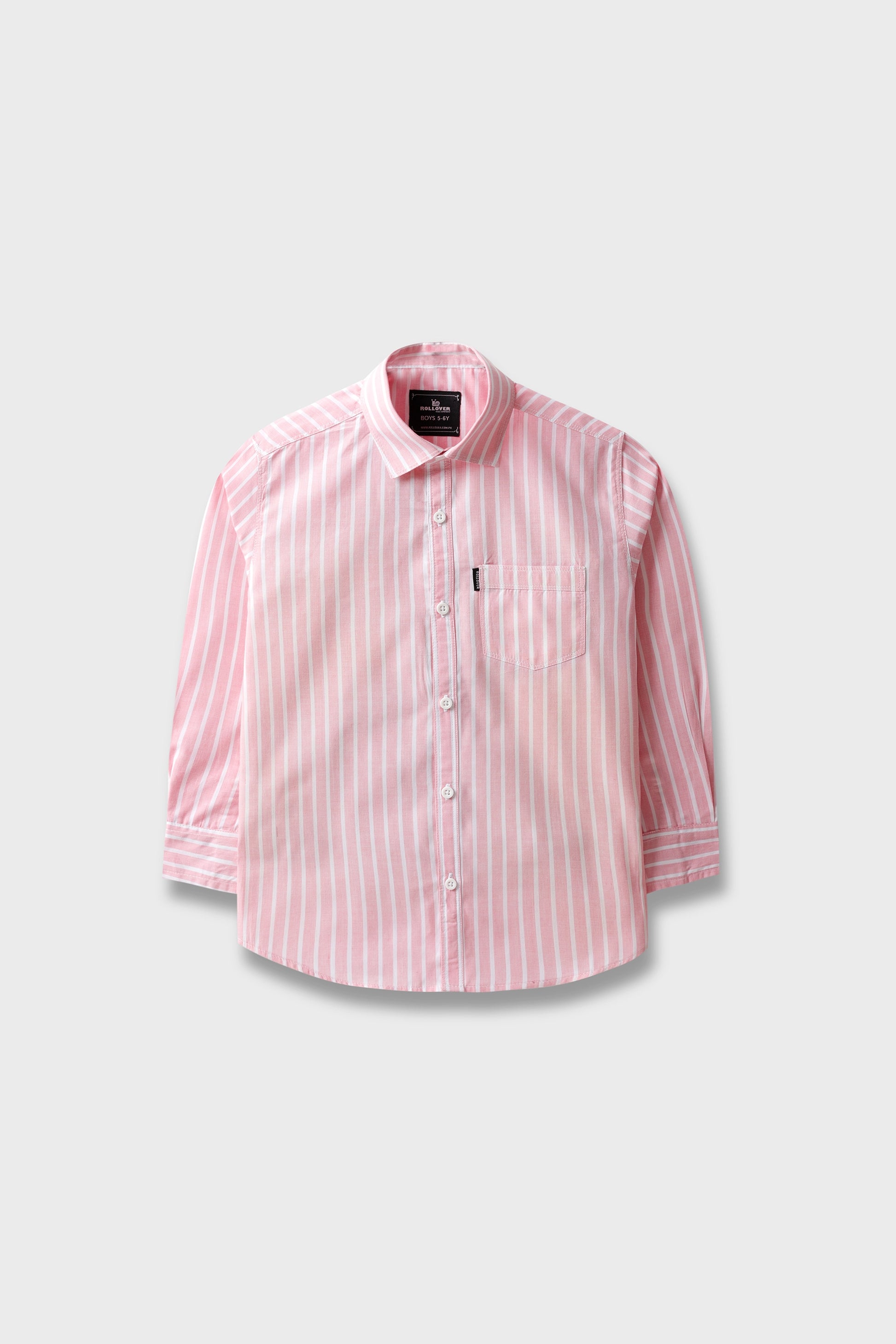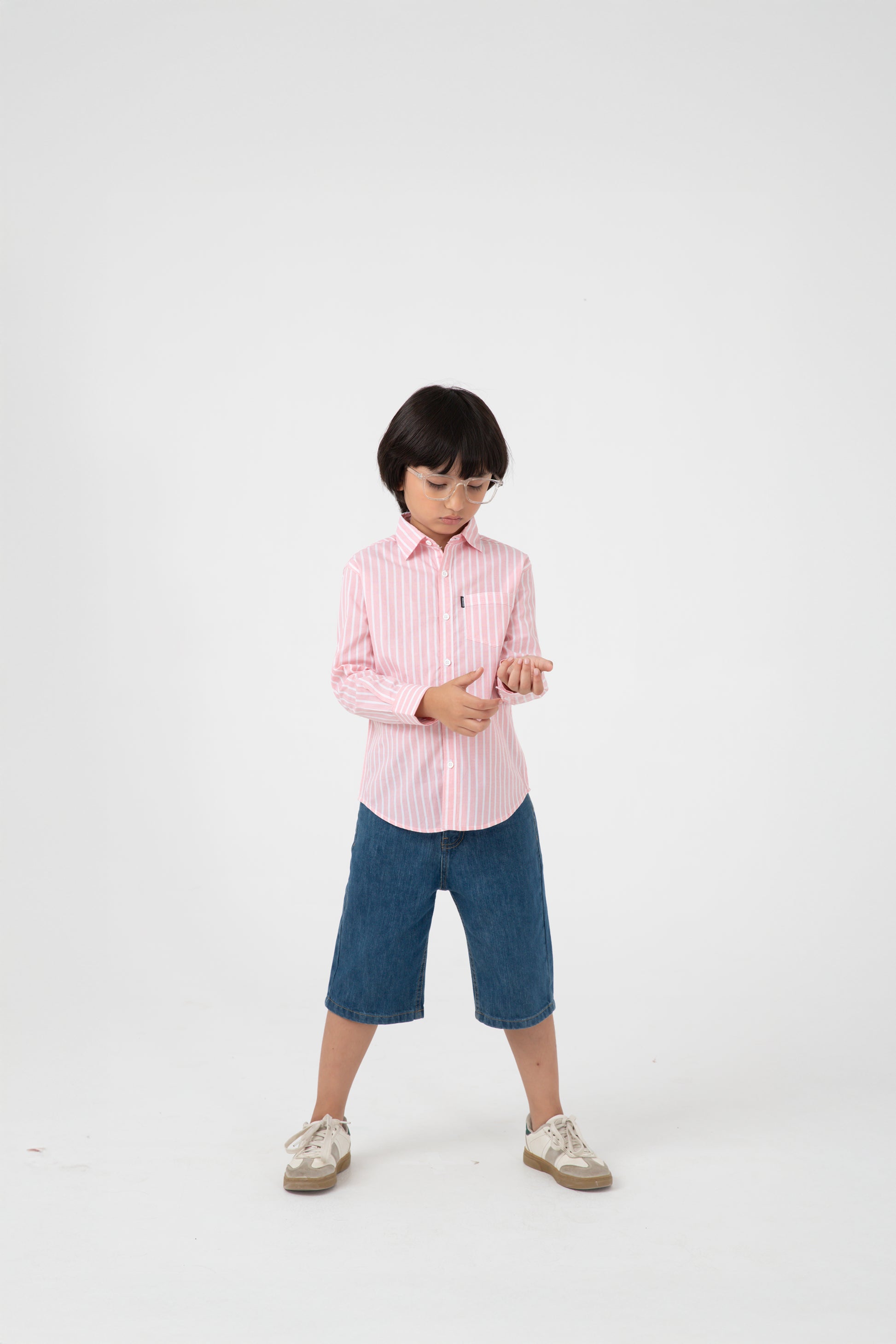 This striped pink shirt blends charm and sophistication. Featuring a button-down front, cuffed sleeves, and a curved hem, it is tailored from premium cotton for breathable wear. The alternating white stripe detail elevates its appeal, making it ideal for school days, dinners, or festive occasions.
