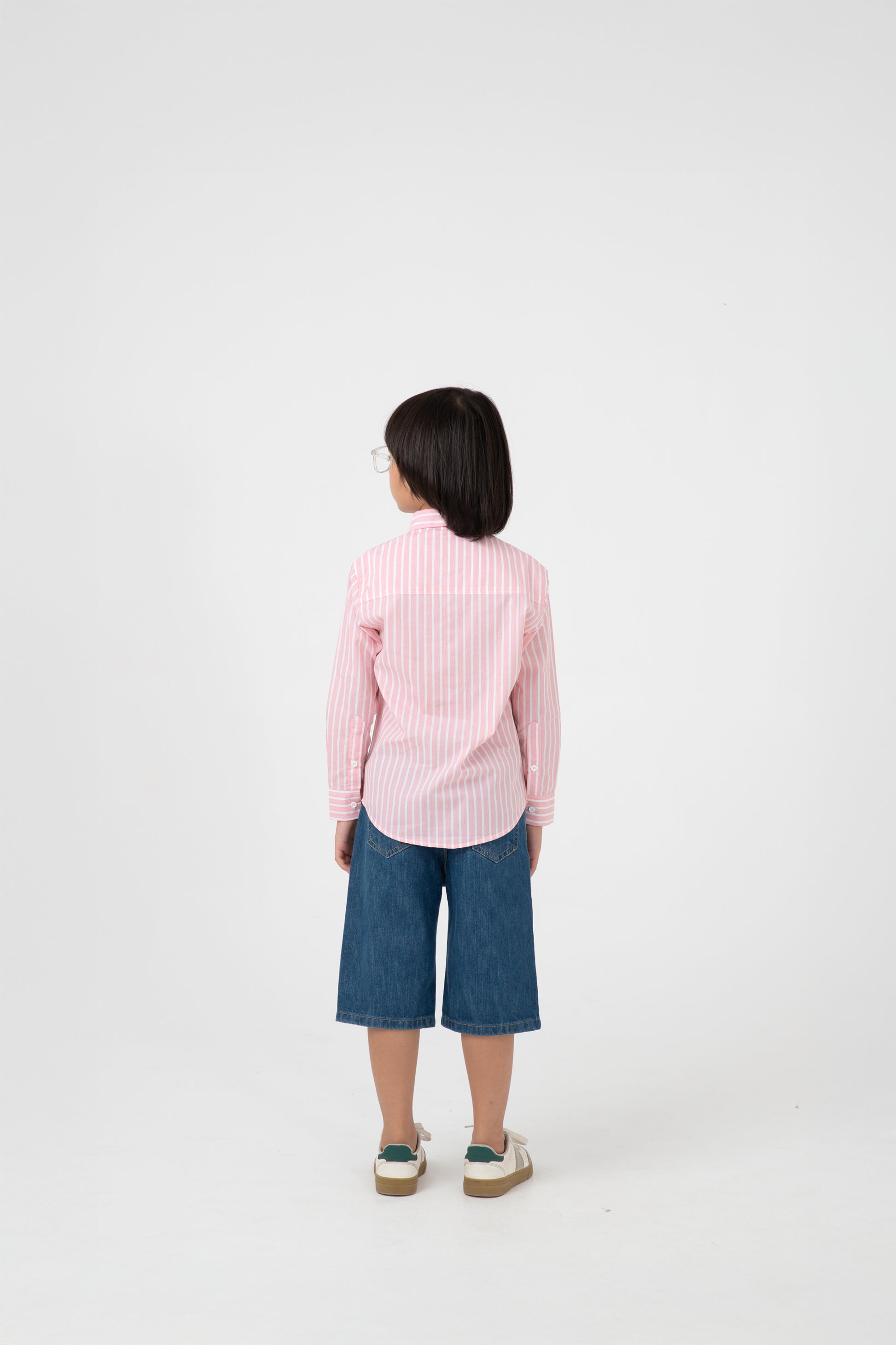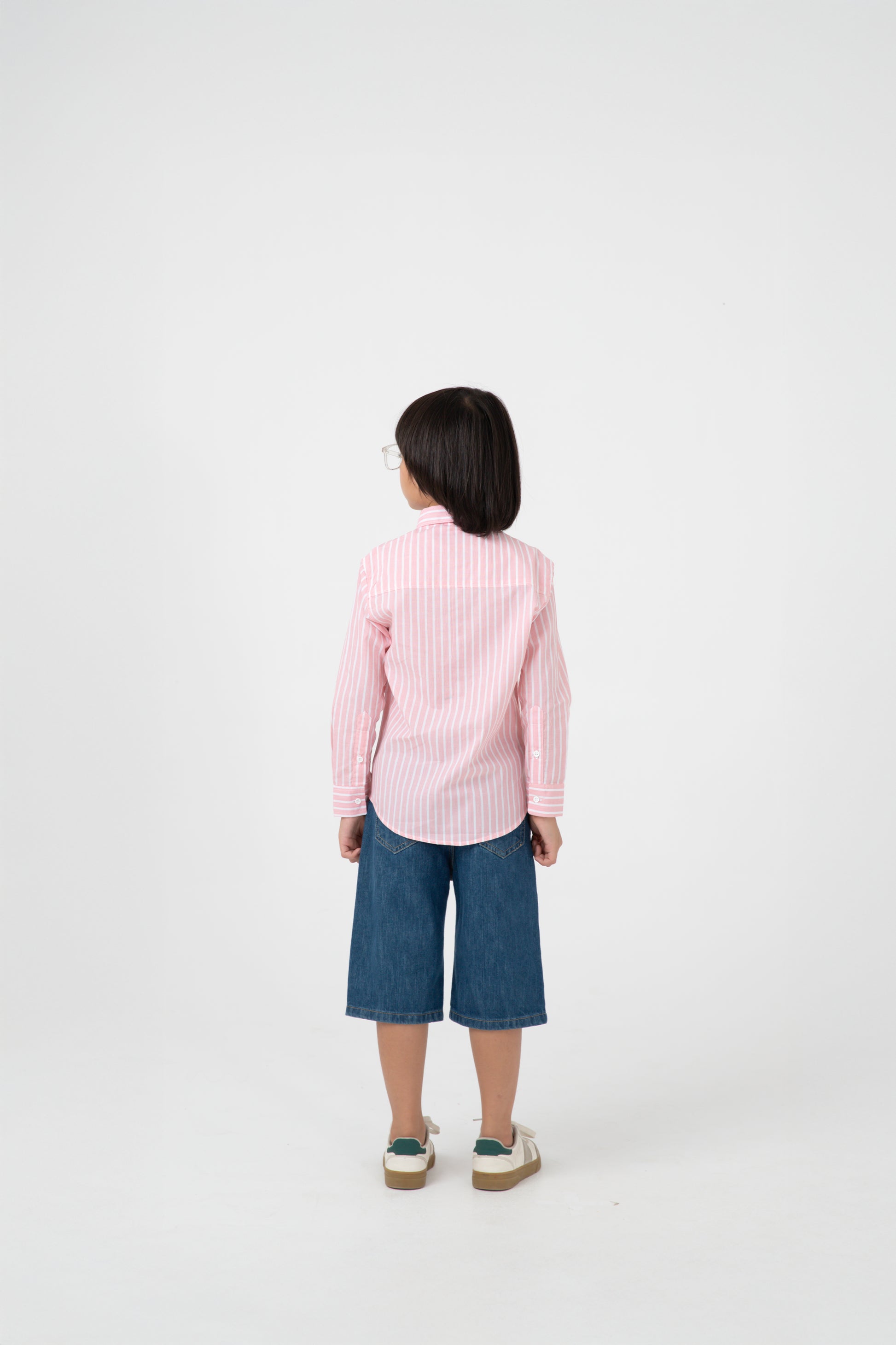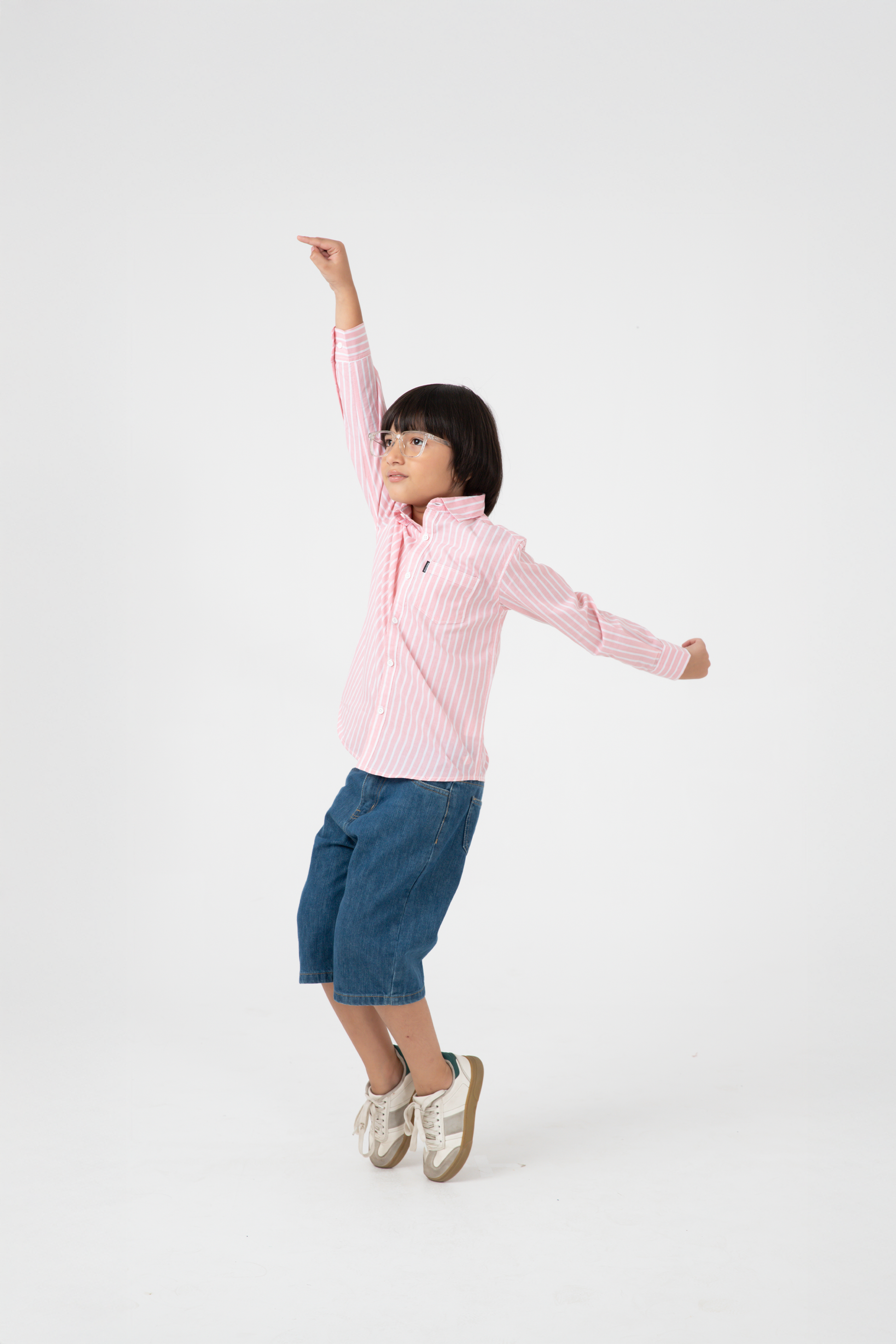 This striped pink shirt blends charm and sophistication. Featuring a button-down front, cuffed sleeves, and a curved hem, it is tailored from premium cotton for breathable wear. The alternating white stripe detail elevates its appeal, making it ideal for school days, dinners, or festive occasions.