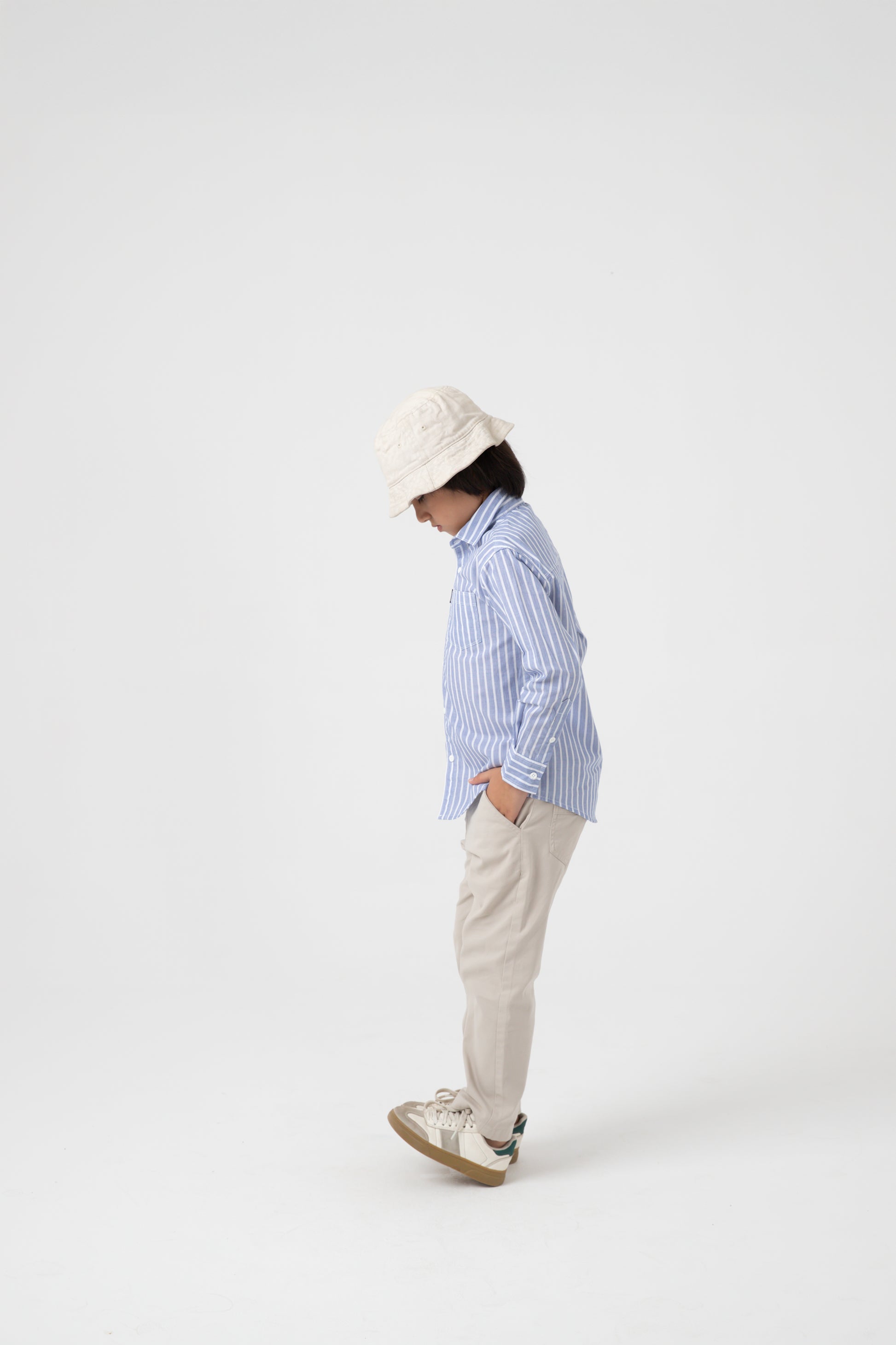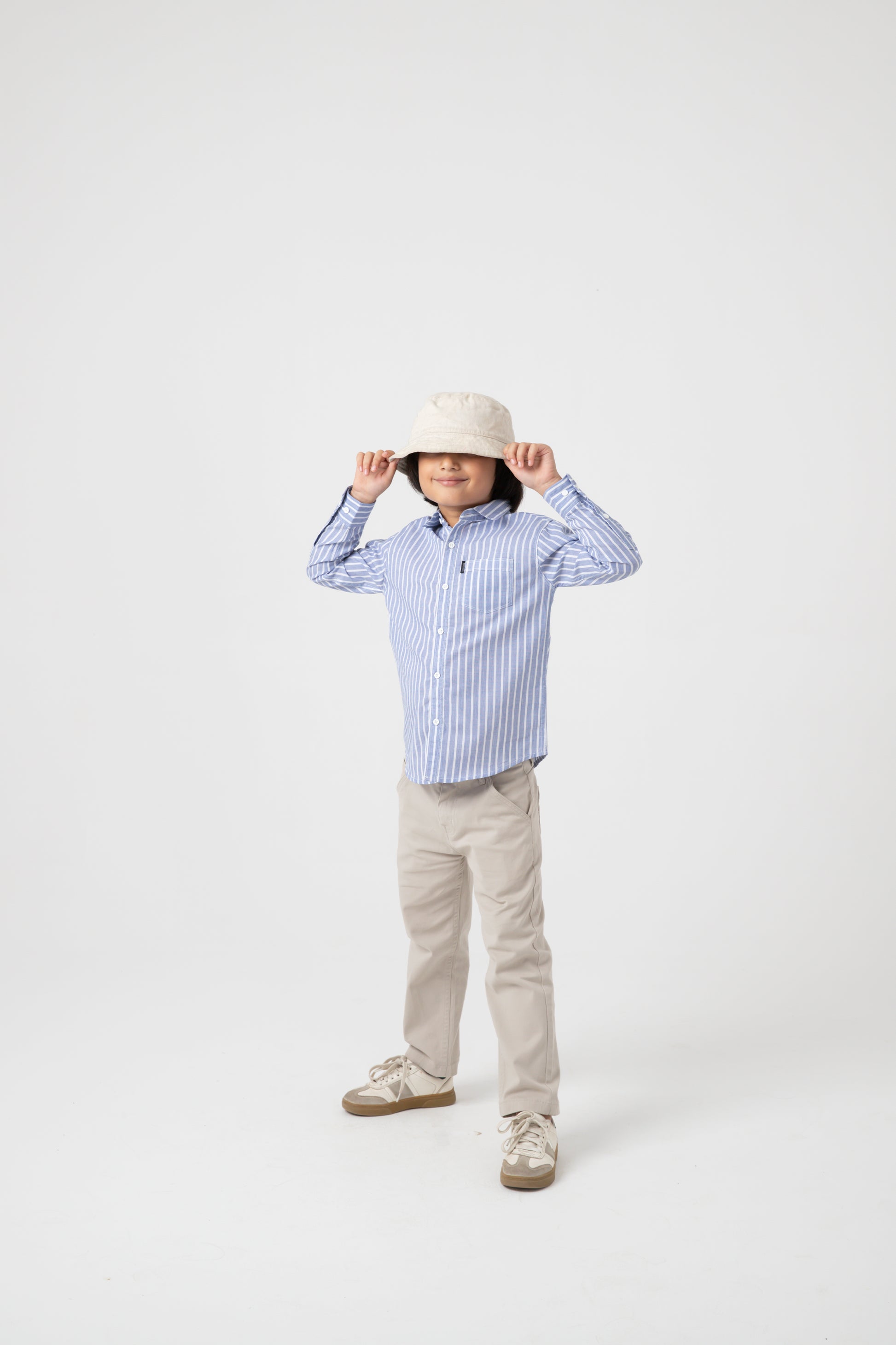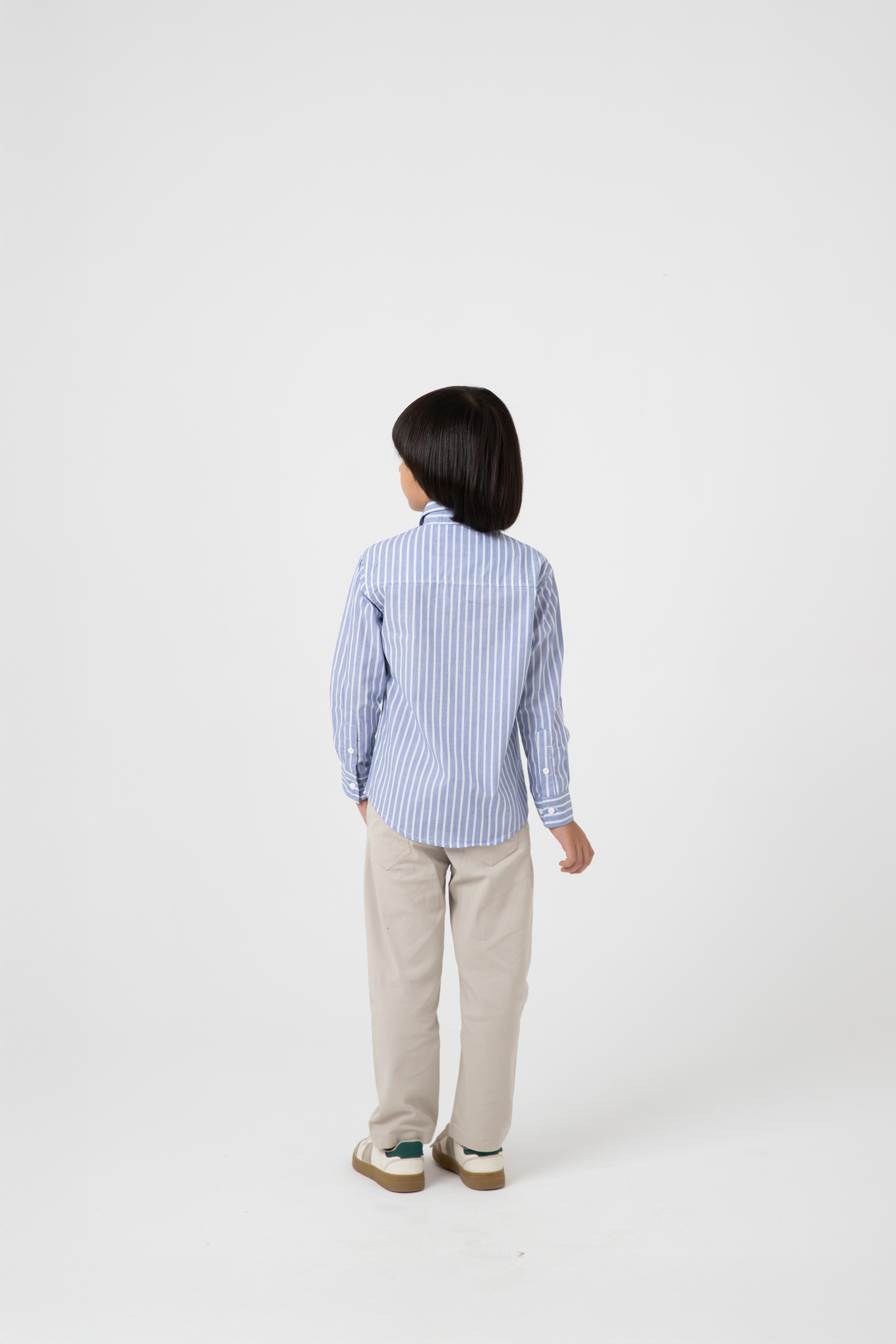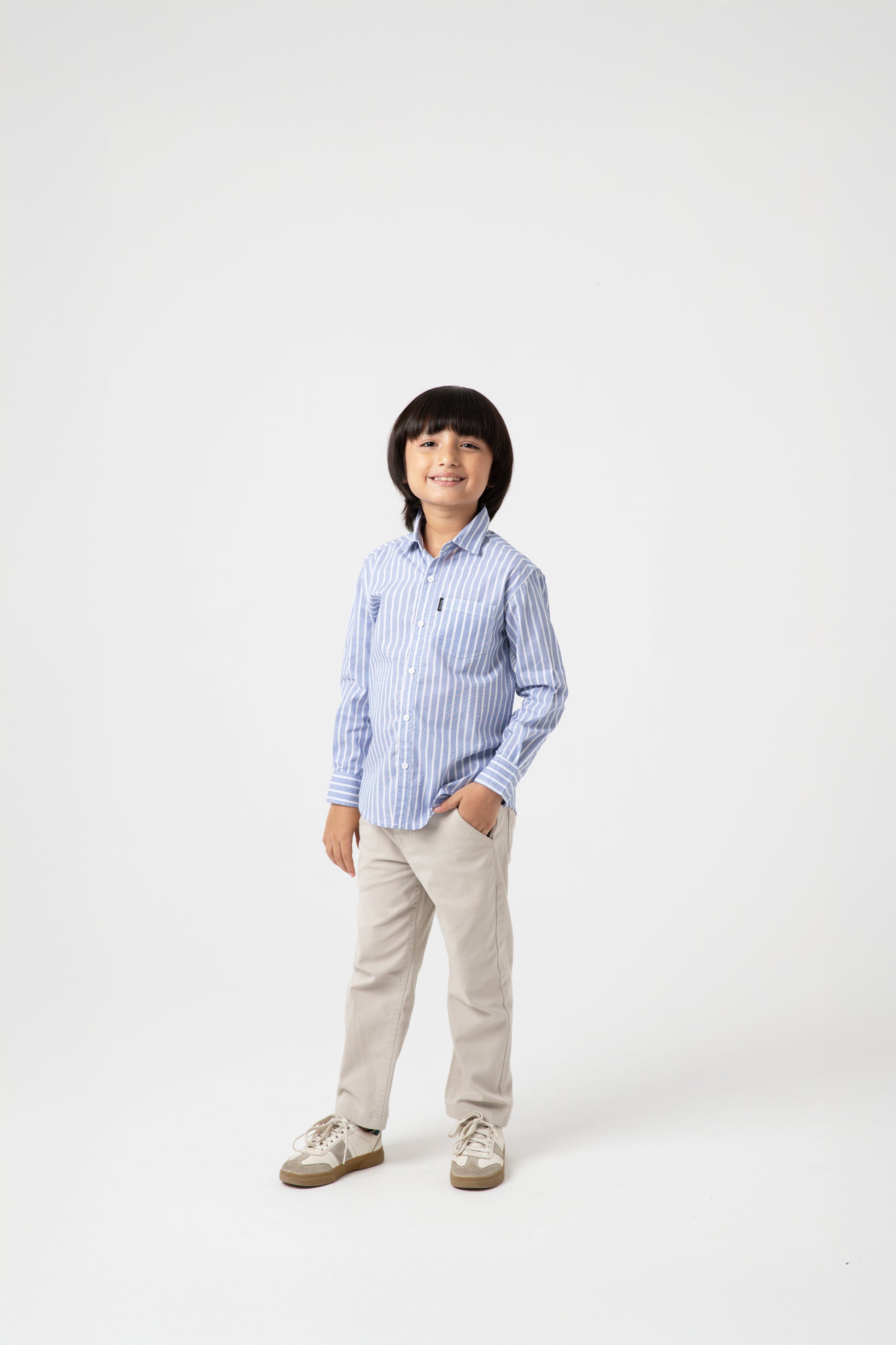 This striped blue shirt blends charm and sophistication. Featuring a button-down front, cuffed sleeves, and a curved hem, it is tailored from premium cotton for breathable wear. The alternating white stripe detail elevates its appeal, making it ideal for school days, dinners, or festive occasions.