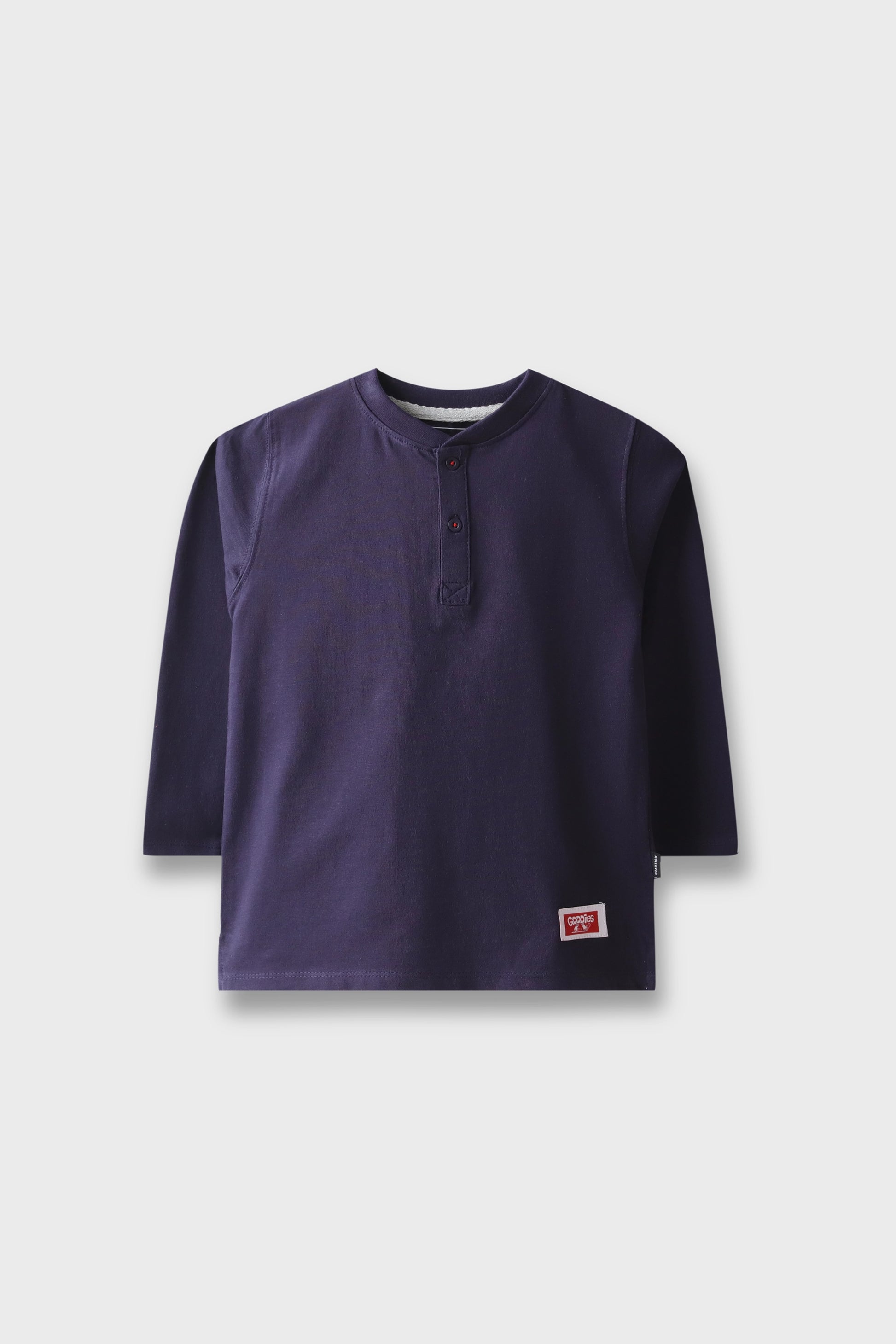 Crafted in navy blue heavy jersey, this full-sleeve T-shirt features a clean silhouette with a subtle front button detail at the neckline. Finished with a sporty patch near the hem, it offers comfort and durability. Ideal for school, play, or layering during breezy days.