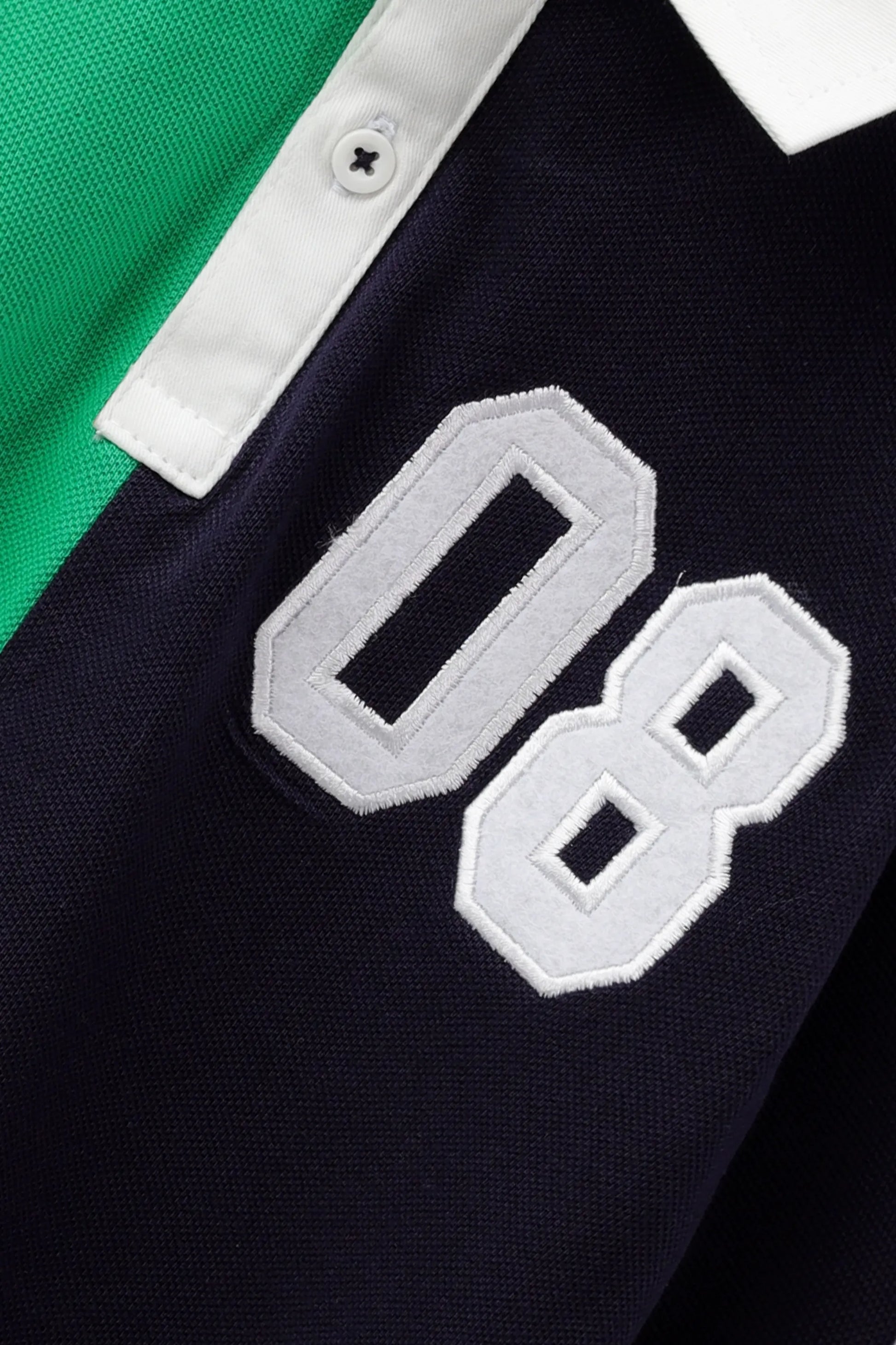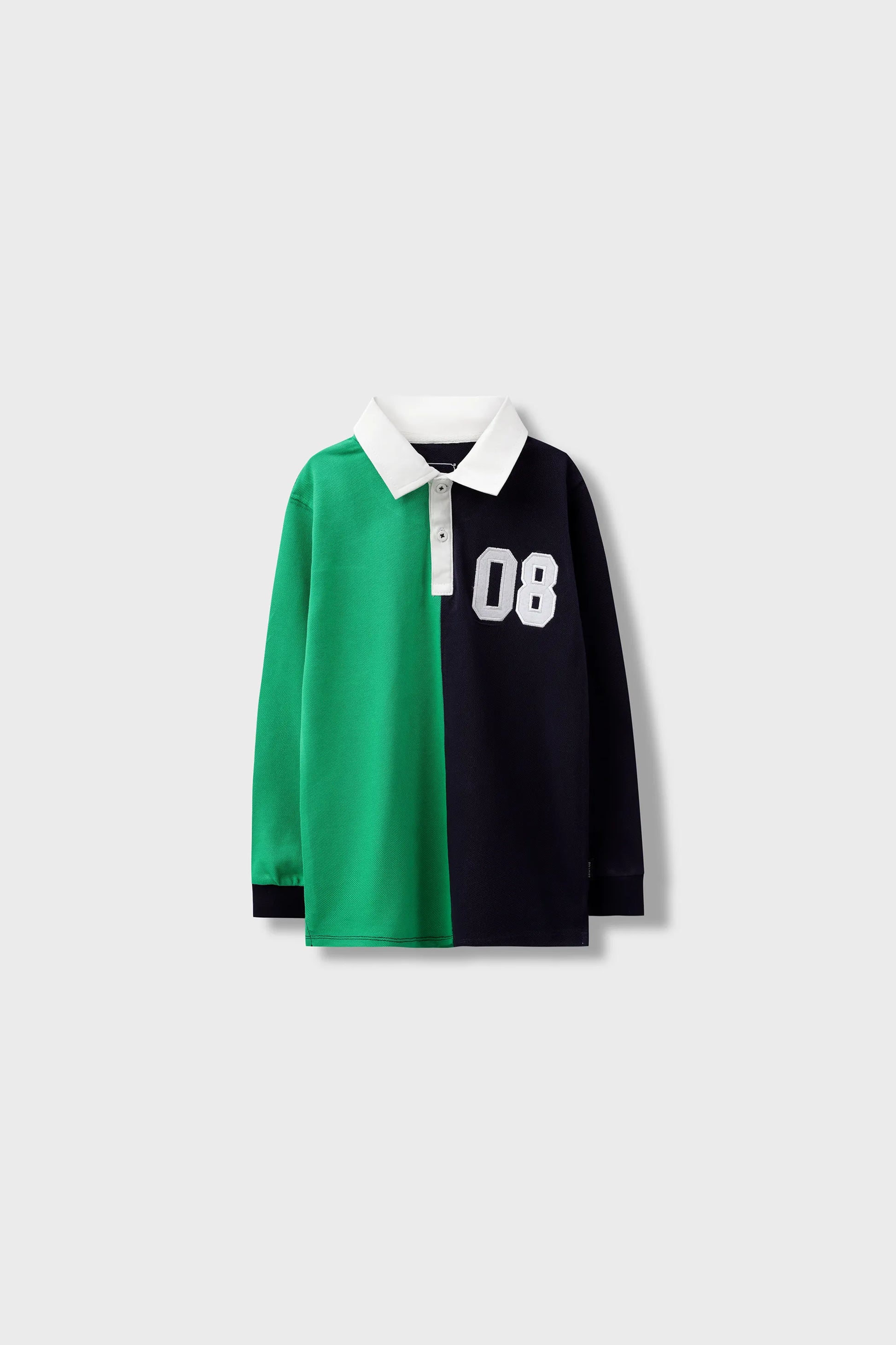 Crafted from premium pique, this polo shirt combines navy blue and green in a striking half-and-half layout. The number patch adds a varsity touch, while the collared neckline keeps it classic. Perfect for school days or weekend outings with confident style.