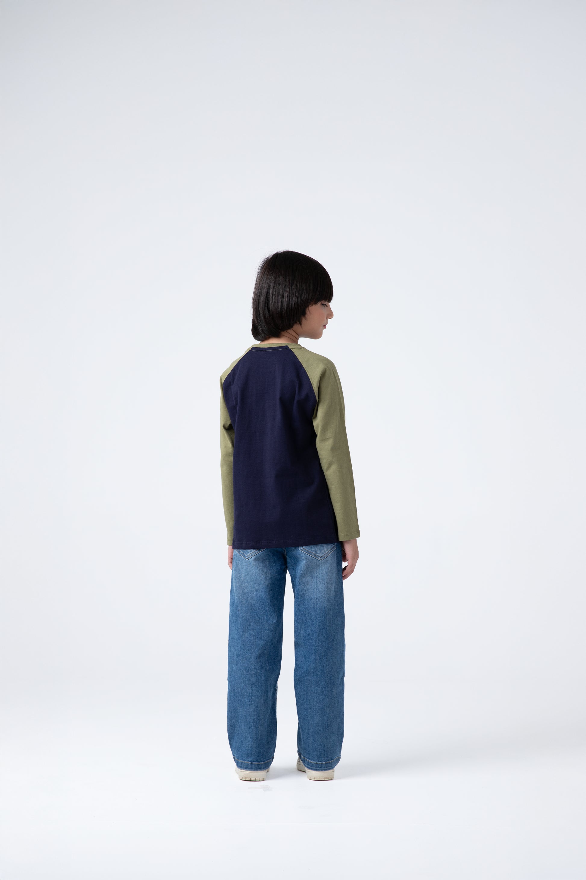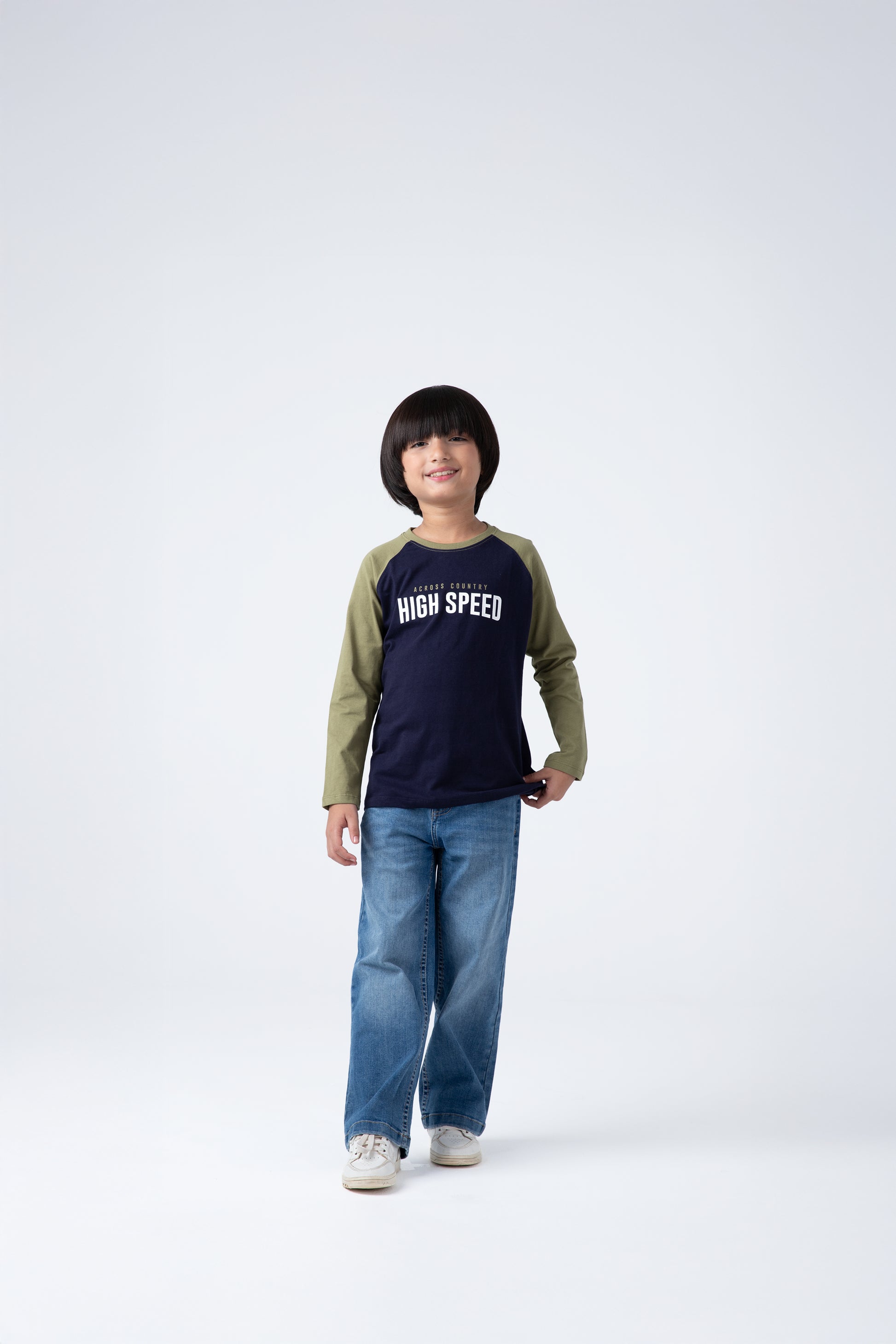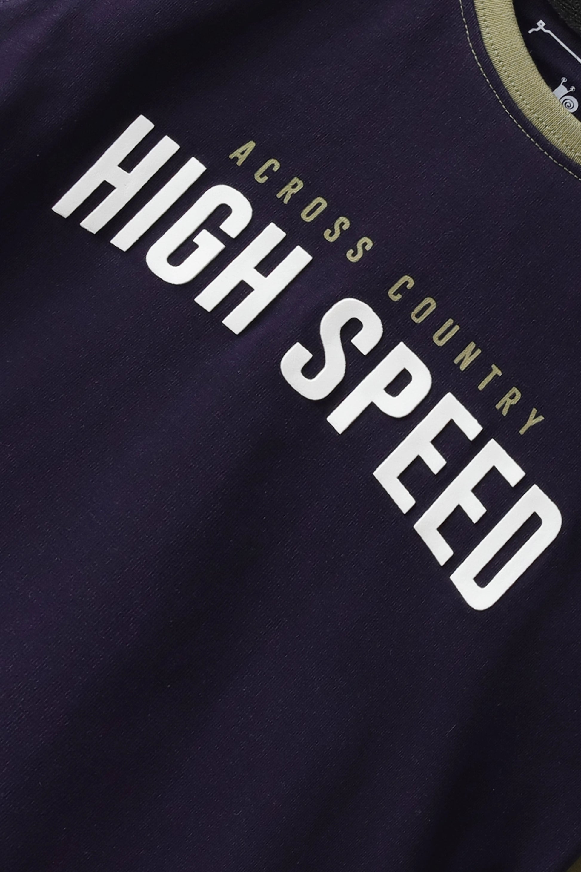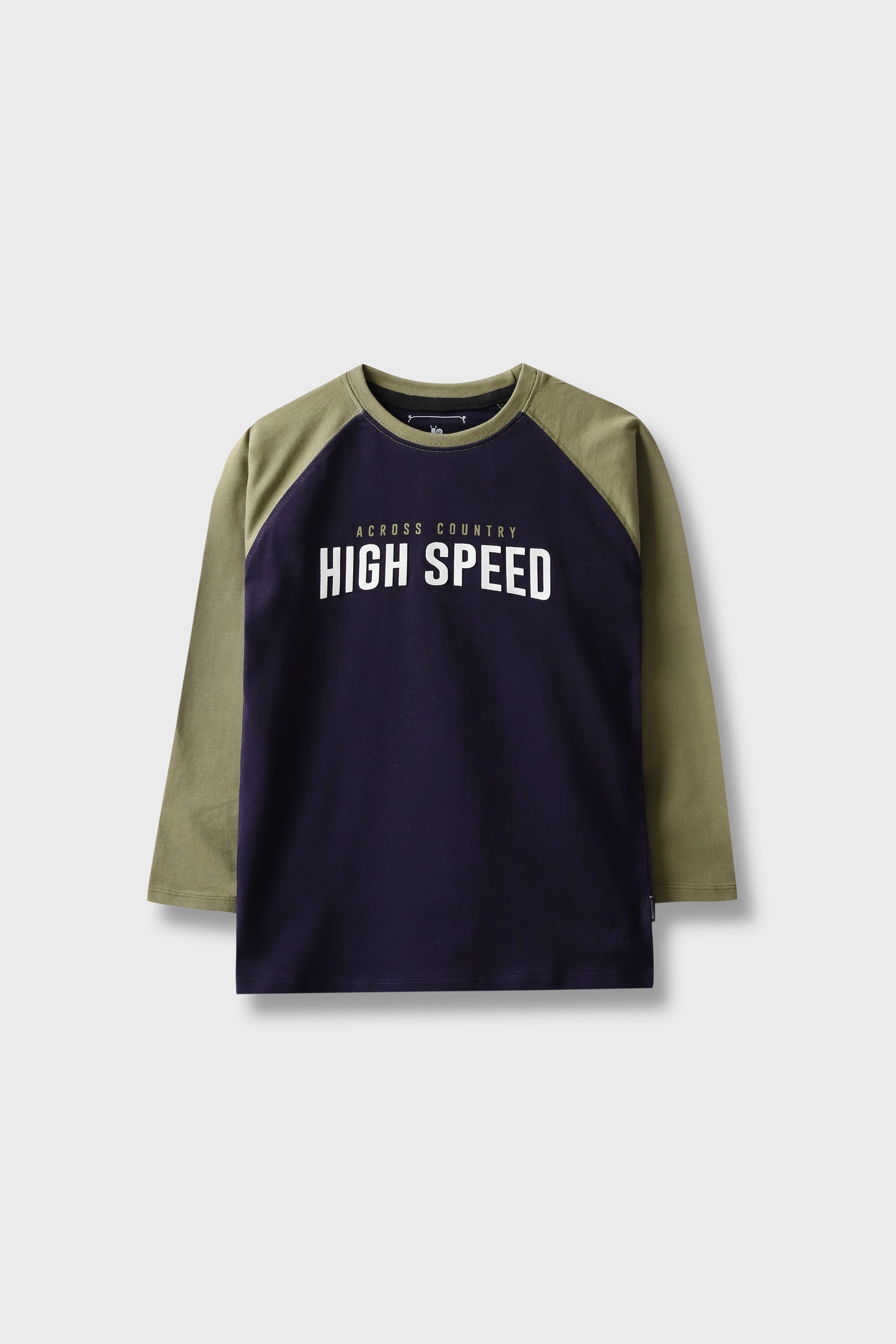 This navy blue t-shirt with olive raglan sleeves is built for boys who love adventure. Crafted in durable heavy jersey, it features a bold "High Speed" print that inspires movement. The contrast sleeves and stretch comfort make it a go-to piece for school, play, or weekend sports sessions.