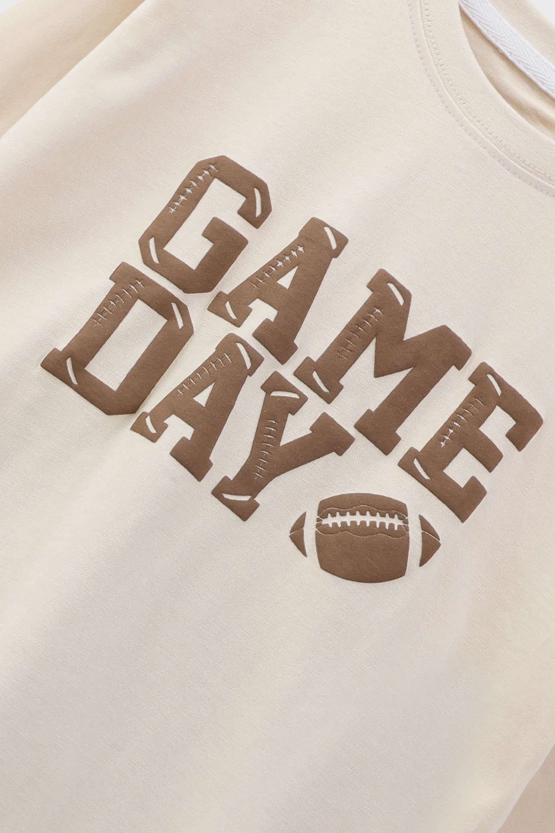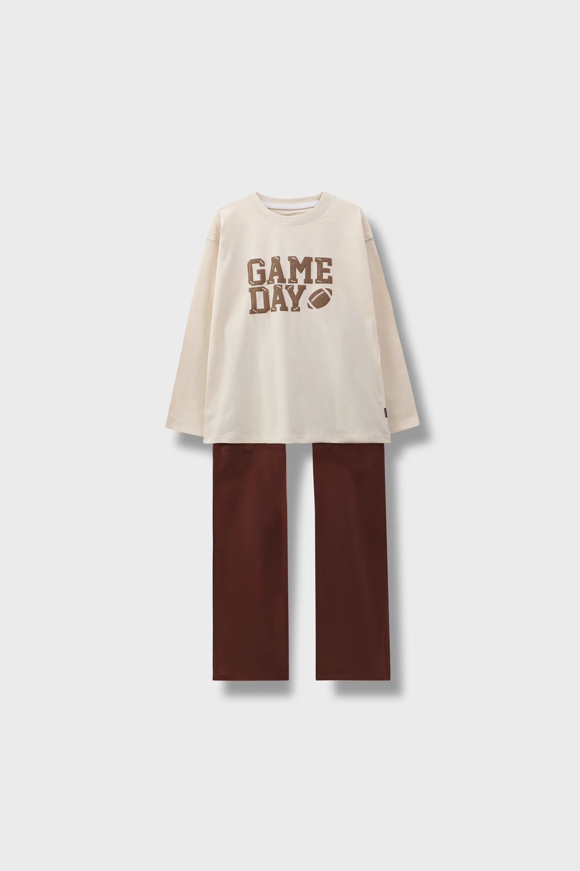 This co-ord set brings style and comfort together with a drop-shoulder off-white tee and elastic waist brown trousers. Crafted from soft heavy jersey, it's ideal for all-day play and casual days out. Bold "Game Day" graphic adds a sporty touch your little one will love to wear.