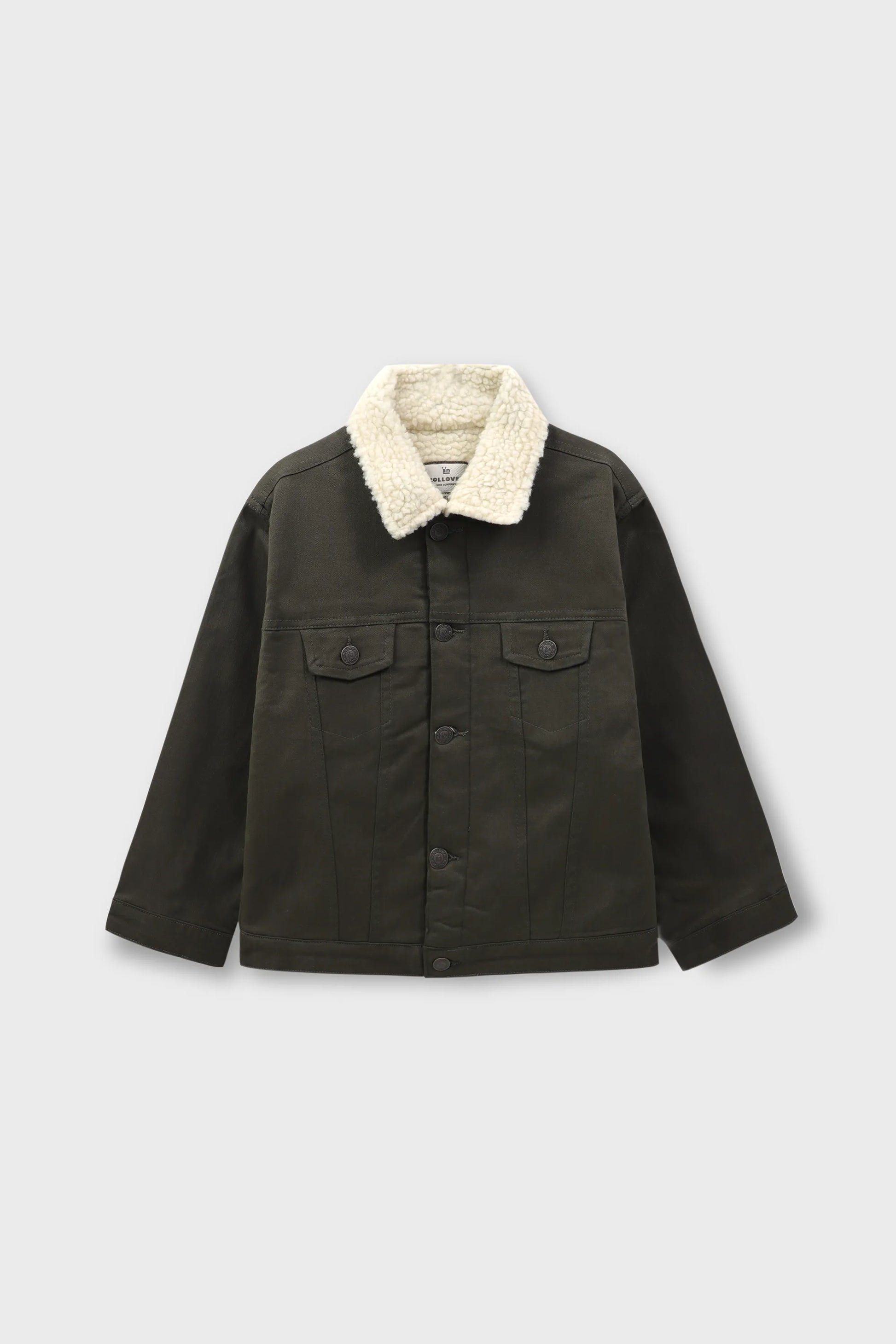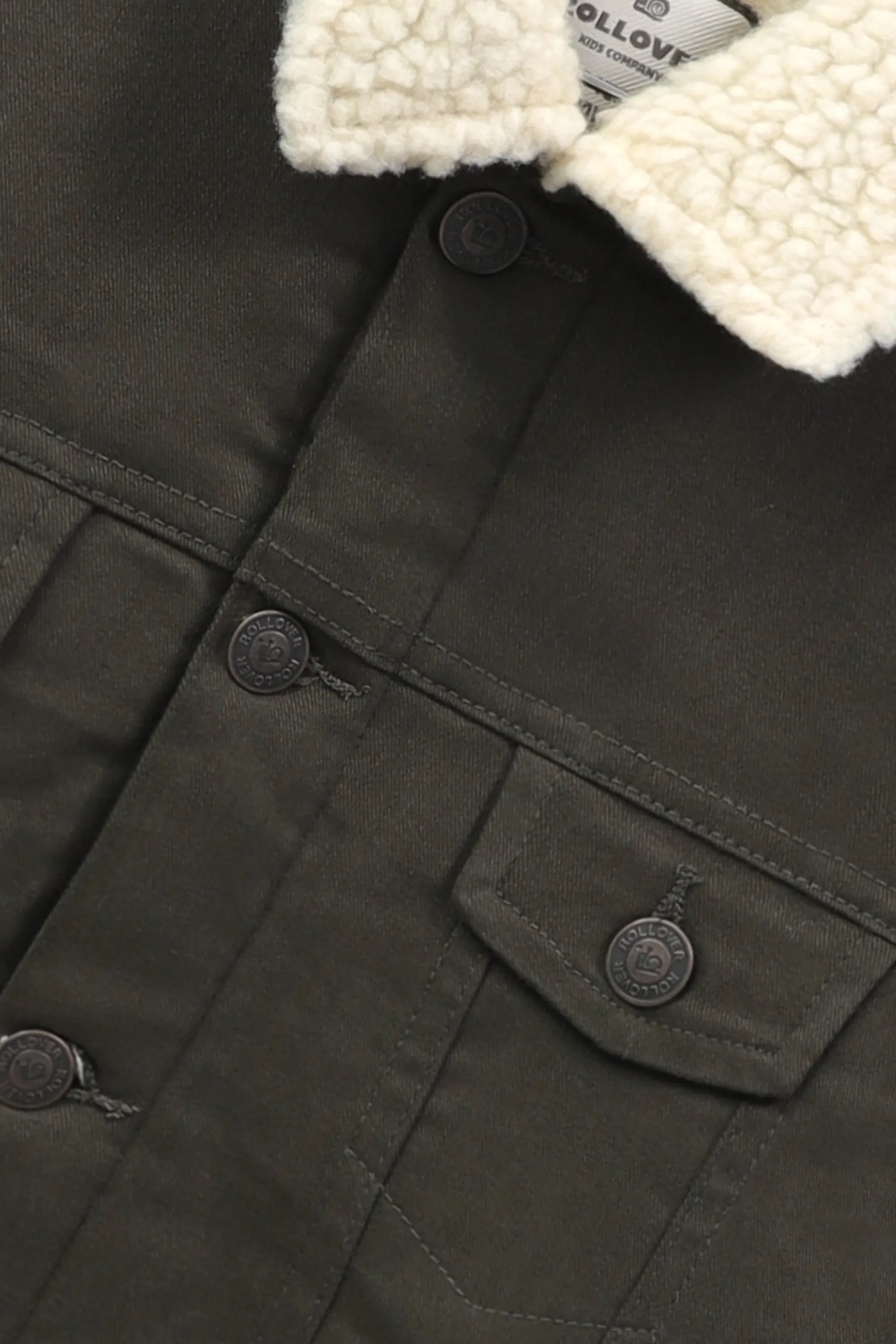 Built for cool adventures, the Olive Trail Coat features rugged twill fabric and a cozy sherpa collar and inner lining for added warmth. Buttoned closure ensures a secure fit while front flap pockets hold his essentials. The dark olive hue adds bold style to this winter-ready jacket. Functional, fashionable, and full of attitude.