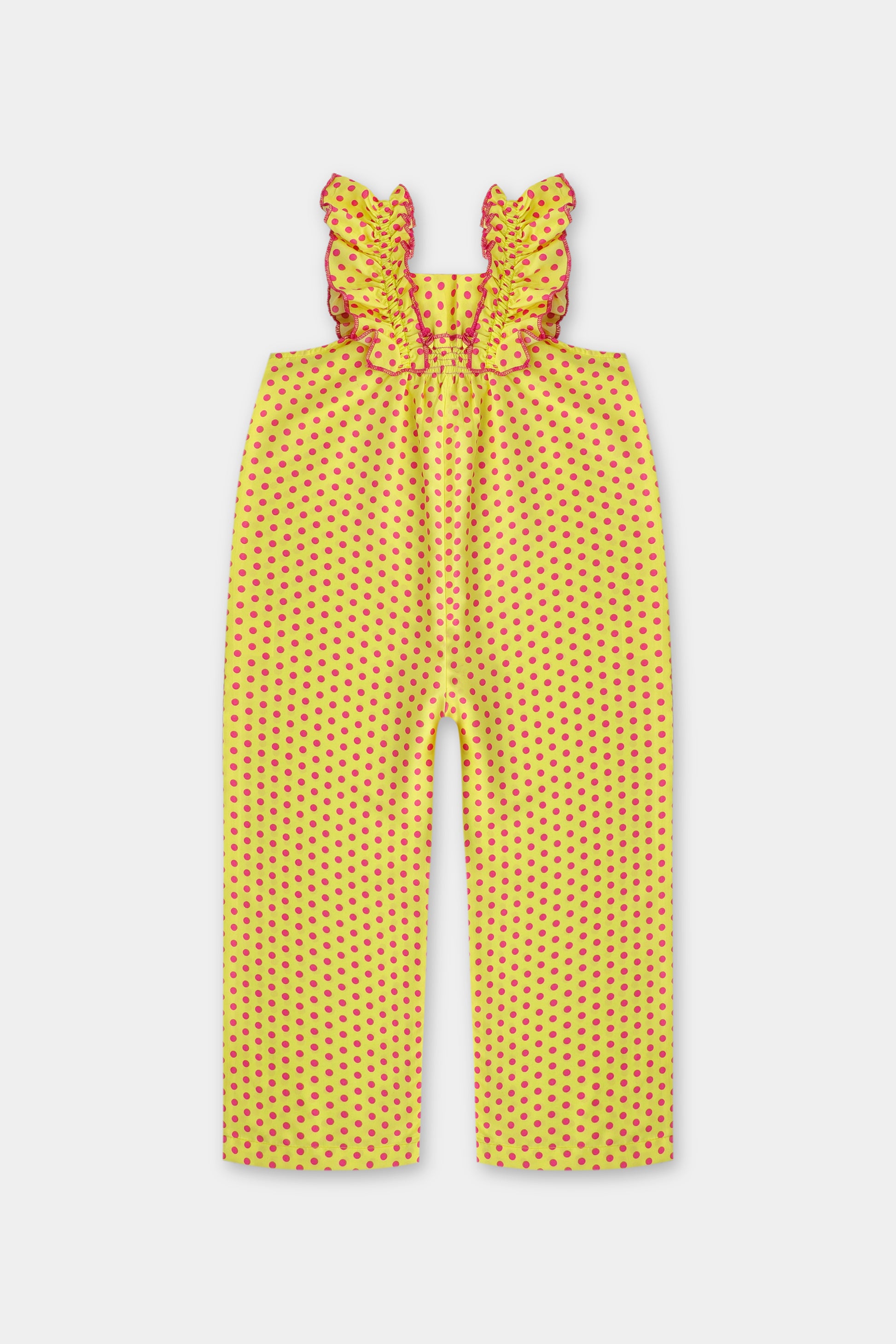 Brighten up her day with the Sunny Delight Ruffle Jumpsuit! Made from soft and breathable cotton, this jumpsuit features adorable ruffled straps, an elasticated back, and playful pink polka dots. Perfect for warm days, it offers a comfortable and stylish fit for casual outings, playdates, and summer adventures.
