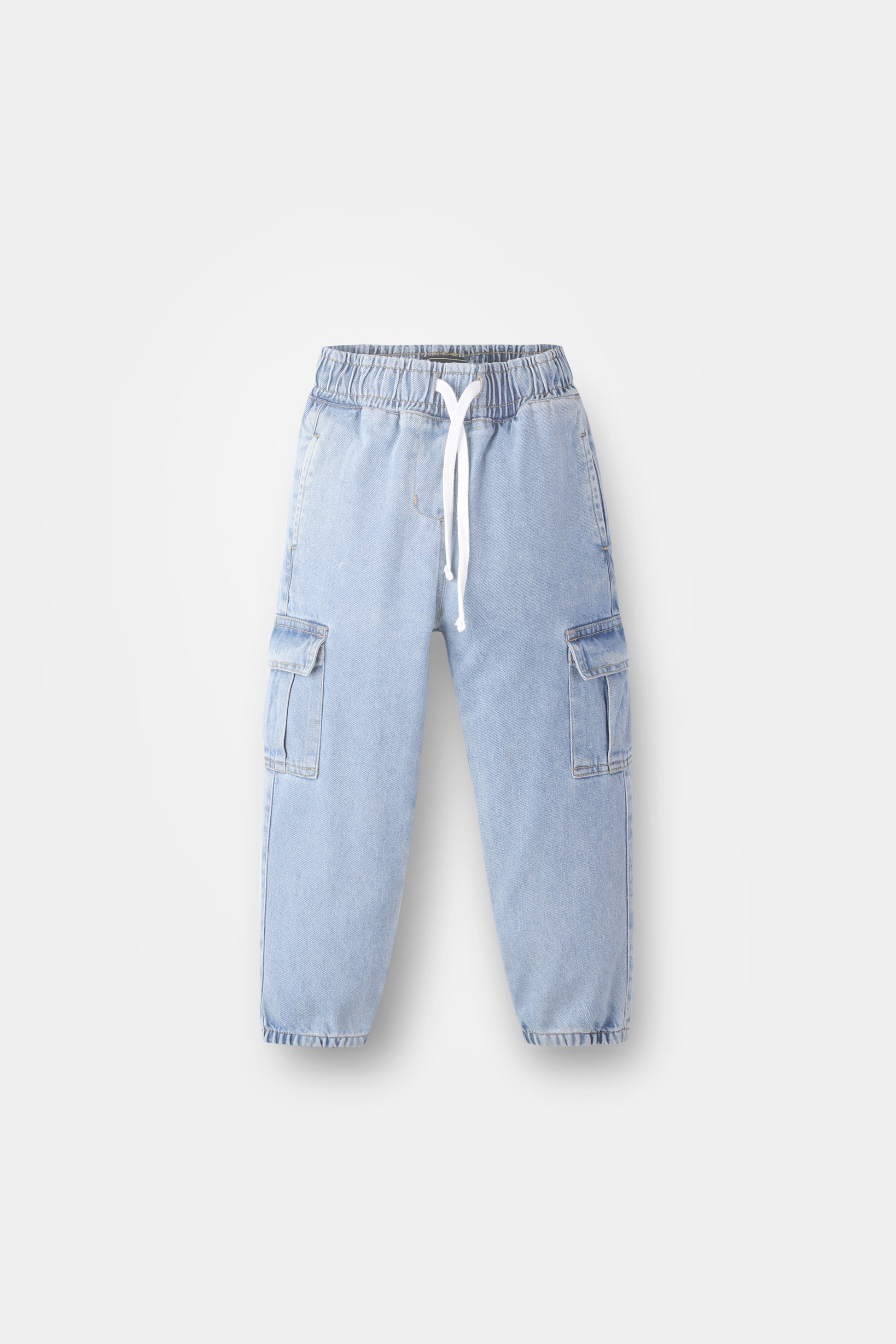 Crafted for tiny trendsetters, these cargo jeans feature roomy side pockets and elasticated ankles for a sporty finish. The light blue denim adds a timeless touch, while the adjustable drawstring waist ensures day-long comfort. Great for school, play, or travel.