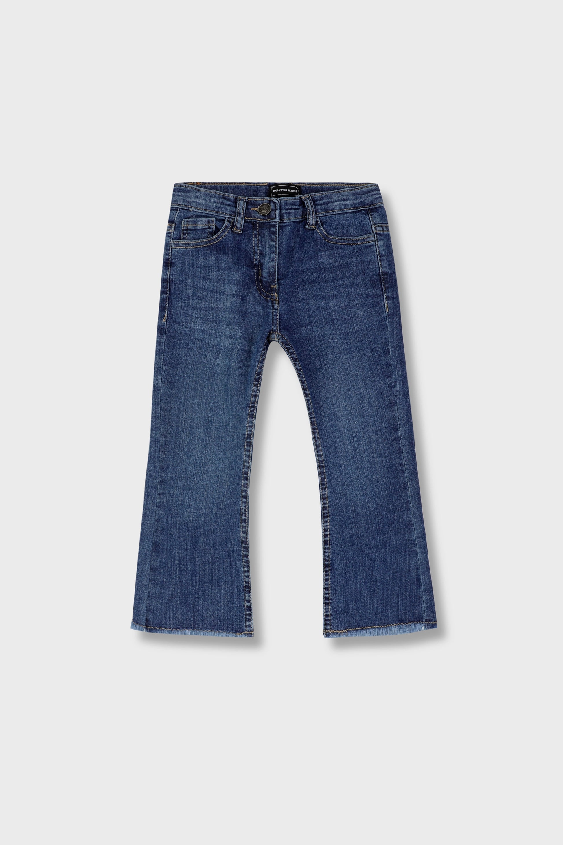 Add a fun twist to her denim collection with these bell bottom jeans in soft blue denim. Designed with a snug fit through the hips and dramatic flare below the knee, they feature frayed hems for an edgy finish. The perfect blend of retro and cool for casual days out.