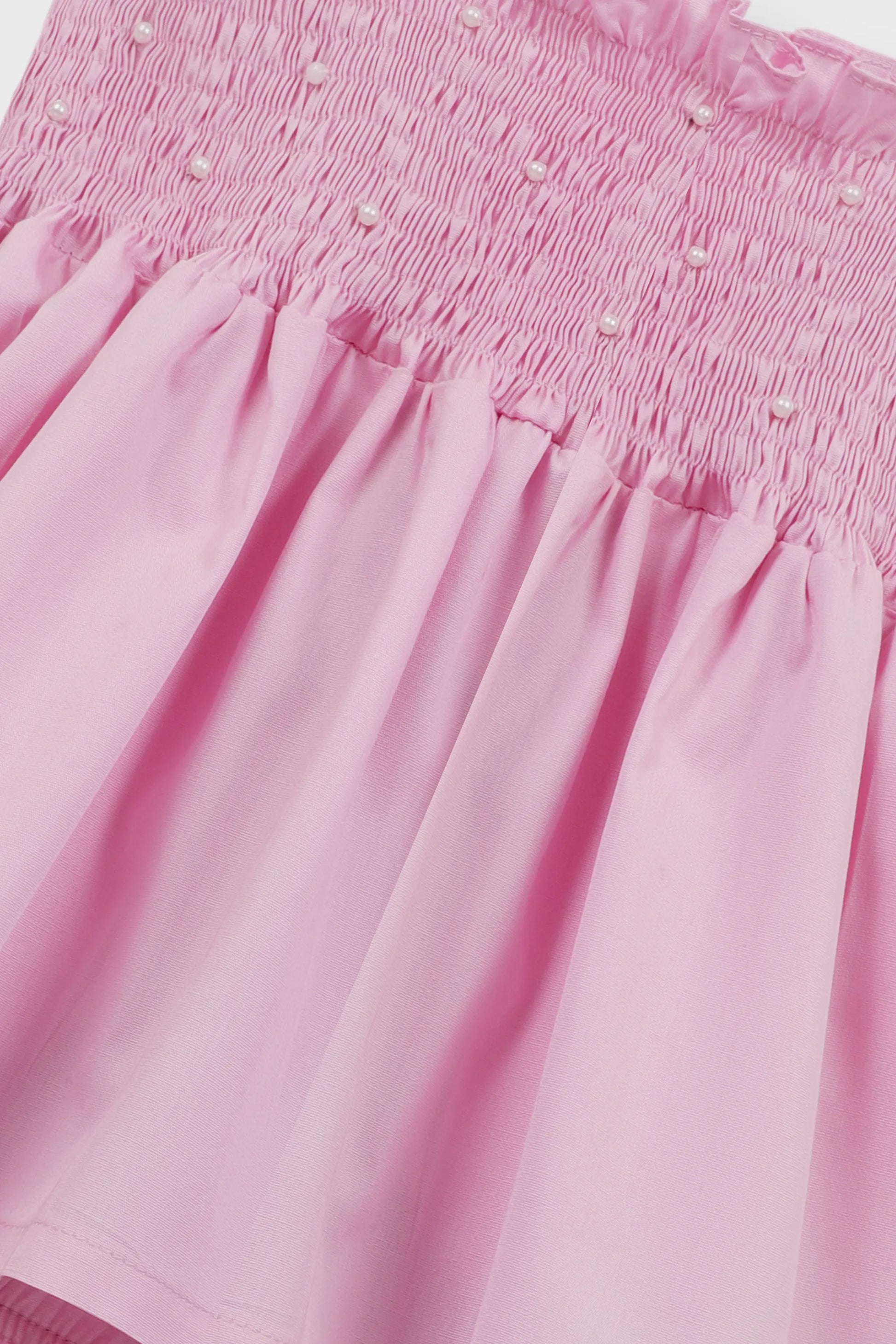 Crafted from breathable cotton, this pink dress set showcases a beautifully smocked bodice with gentle gathers for ease. Frilled shoulder straps and a straight hem create a graceful silhouette. The coordinated shorts offer a relaxed fit, making it perfect for warm days, active play, and adorable summer styling.