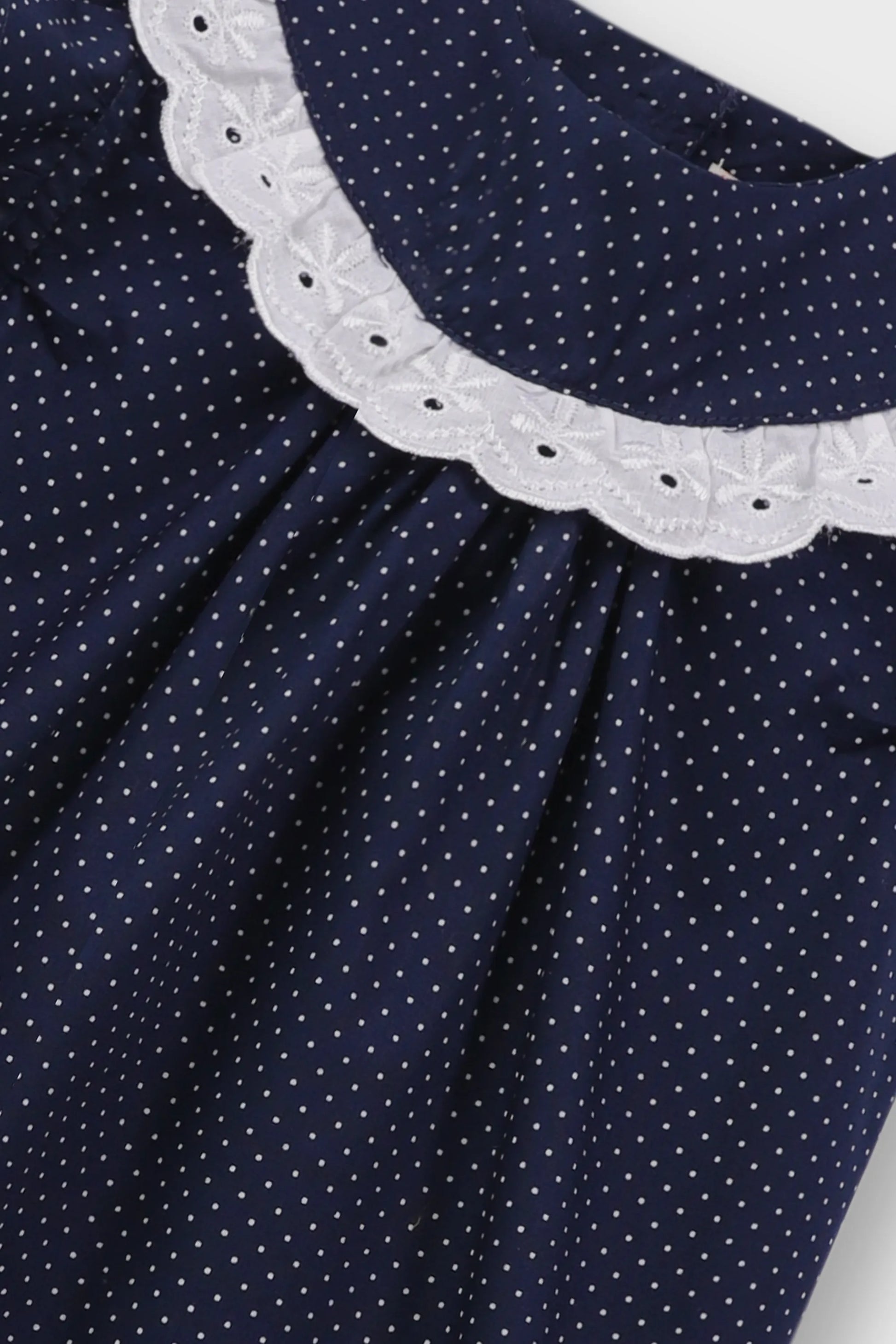 This charming cotton dress set features a deep navy base adorned with delicate white polka dots. Designed with soft gathers, flutter sleeves, and an elegant lace neckline, it pairs perfectly with matching shorts. Breathable fabric and a relaxed silhouette ensure comfort for playful days.