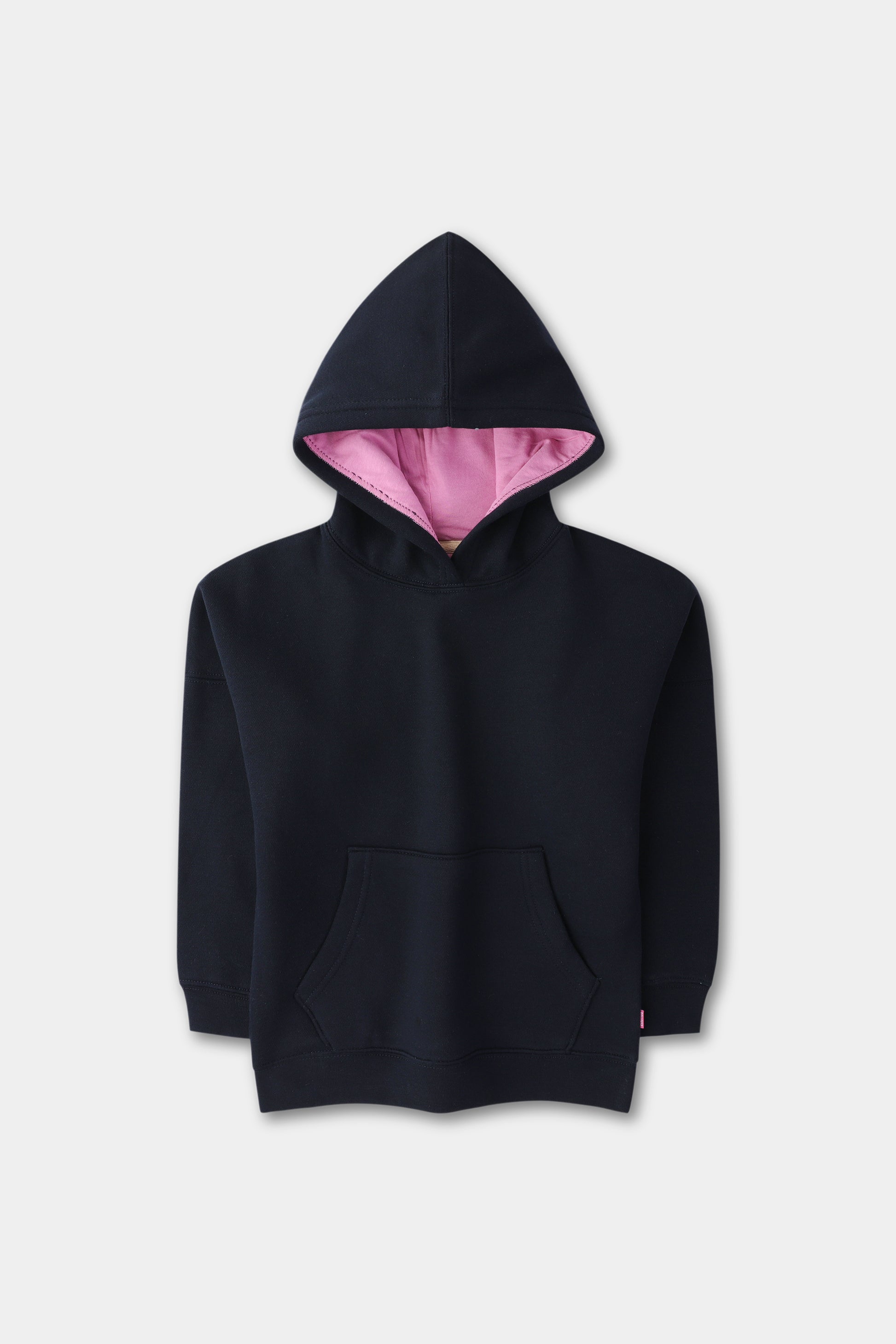 Keep it simple and stylish with this girls' navy blue solid hoodie made in premium fleece. Featuring same-color ribbed cuffs and hem for a clean finish and the front joint pocket for a practical touch, making it perfect for casual wear. Whether she’s running errands with you or hanging out with friends, this hoodie offers warmth and style in one.