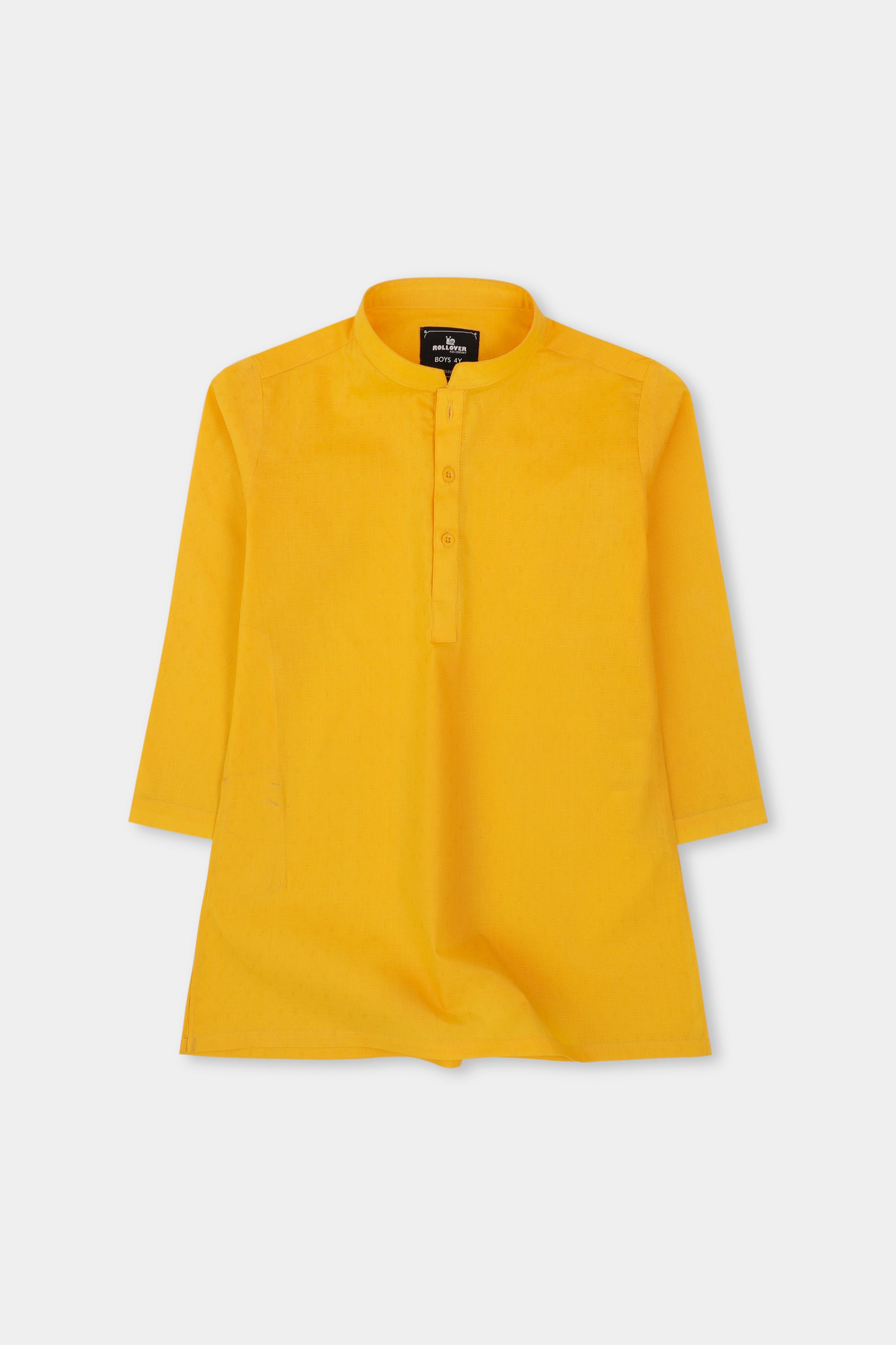 The Yellow Cotton Kurta is a statement piece for boys who love ethnic wear. Featuring a neat band collar, self-print detailing, and full-length sleeves, this yellow kurta is both comfortable and stylish. Perfect for weddings, festivals, and family dinners, it pairs beautifully with white or beige trousers.
