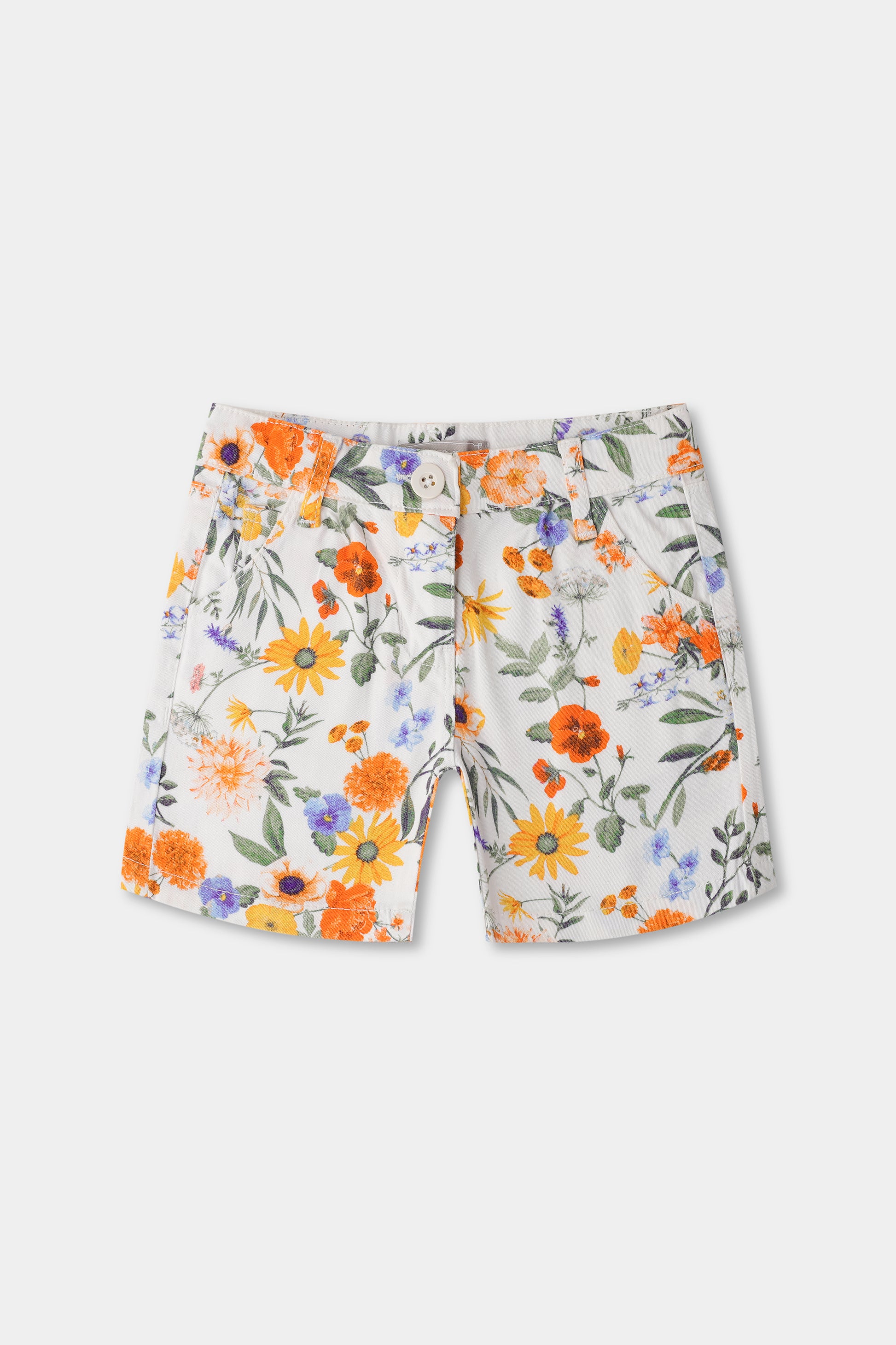 These Floral Fantasy Twill Shorts bring a pop of color and elegance to your girl's wardrobe. Featuring a lively mix of flowers and greenery on a soft twill base, they are breathable, lightweight, and easy to style. Perfect for a sunny day out or a relaxed weekend look.