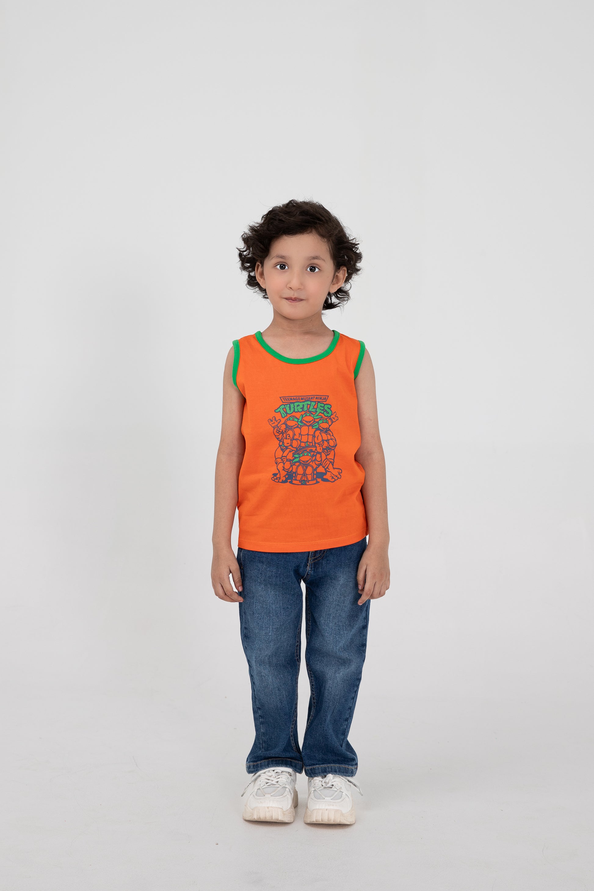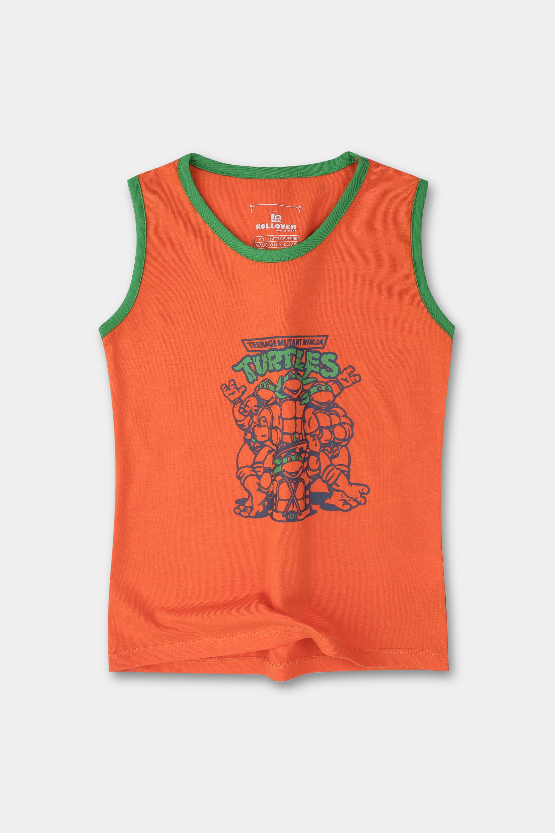 Designed for little heroes, this orange jersey tank top features an energetic Teenage Mutant Ninja Turtles print, inspiring fearless fun. The soft, breathable fabric keeps kids comfortable in warm weather, while the green ribbed trim adds a sporty touch. Perfect for playdates and outdoor activities!