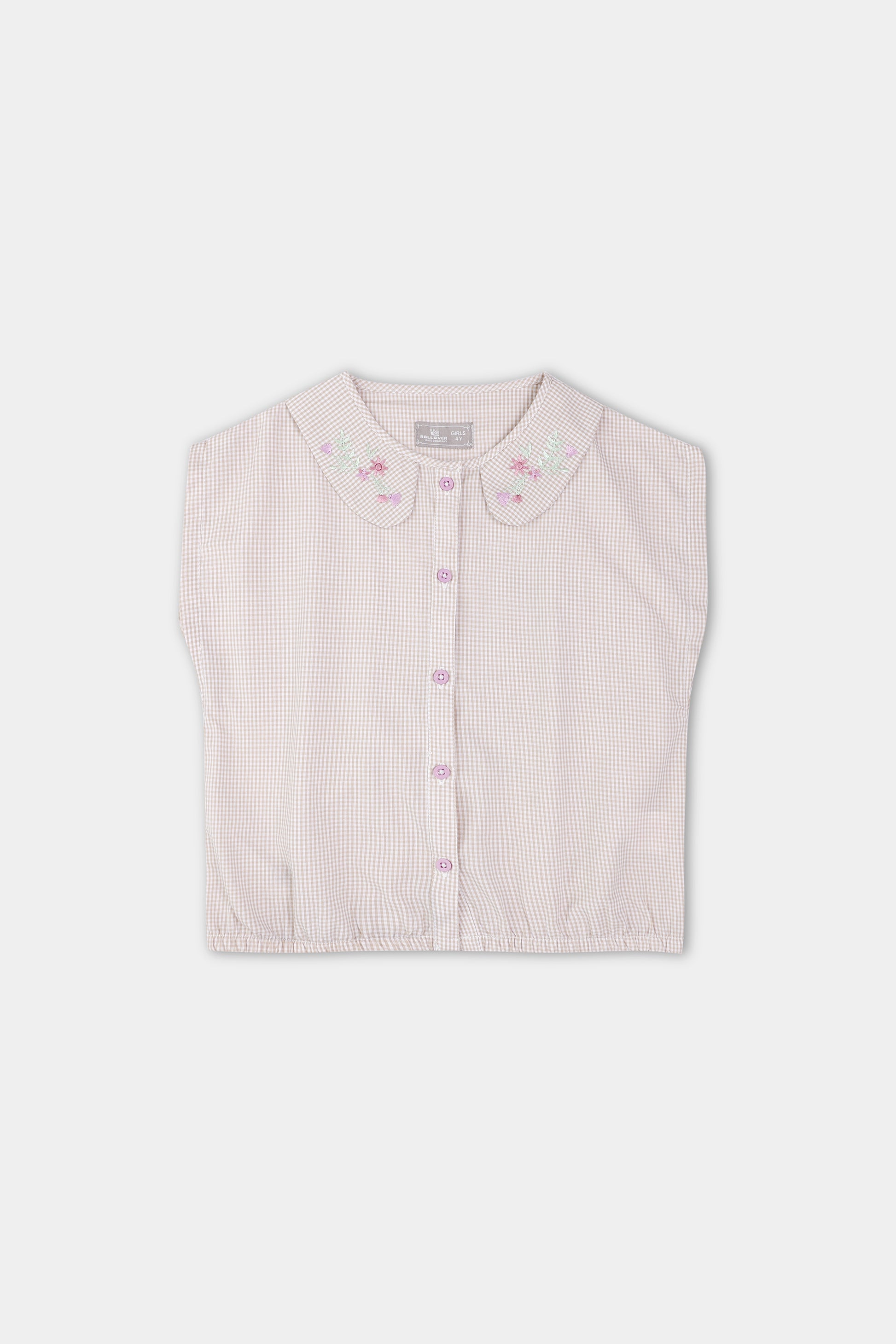 A charming cotton top in brown with a classic rounded collar and subtle floral embroidery for an elegant touch. The boxy shoulders and elasticated hem add a trendy appeal, while the plastic button placket makes dressing easy. Perfect for pairing with skirts, jeans, or shorts for a stylish look.