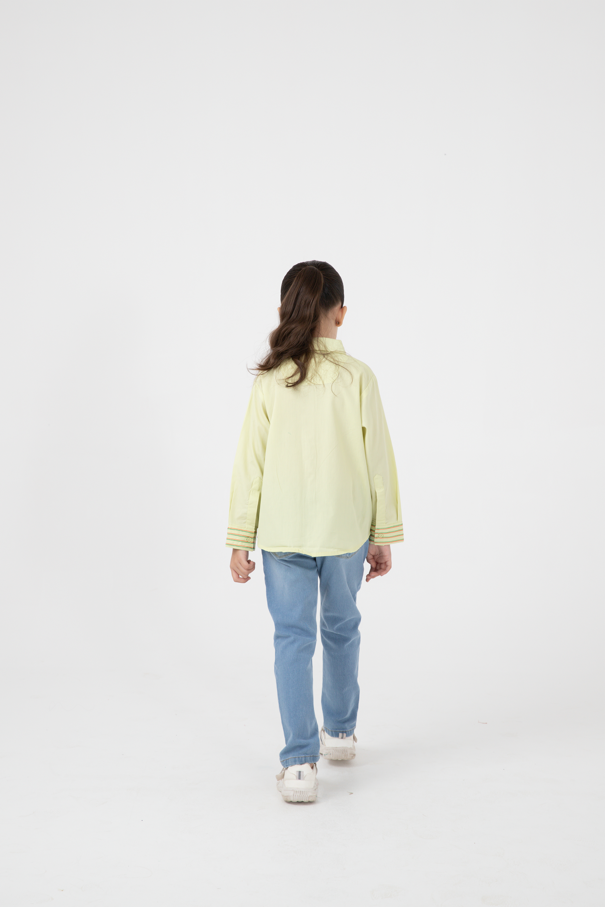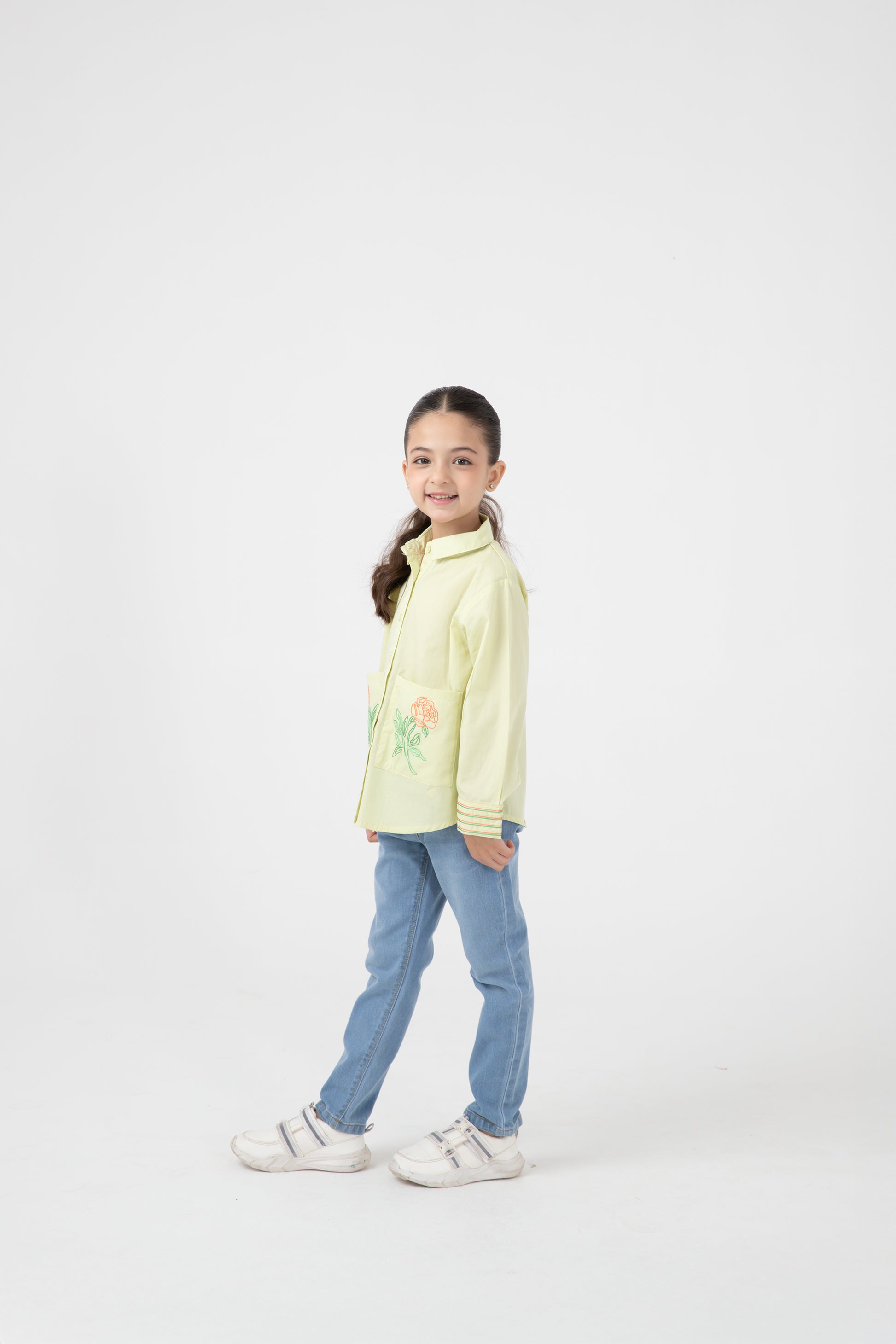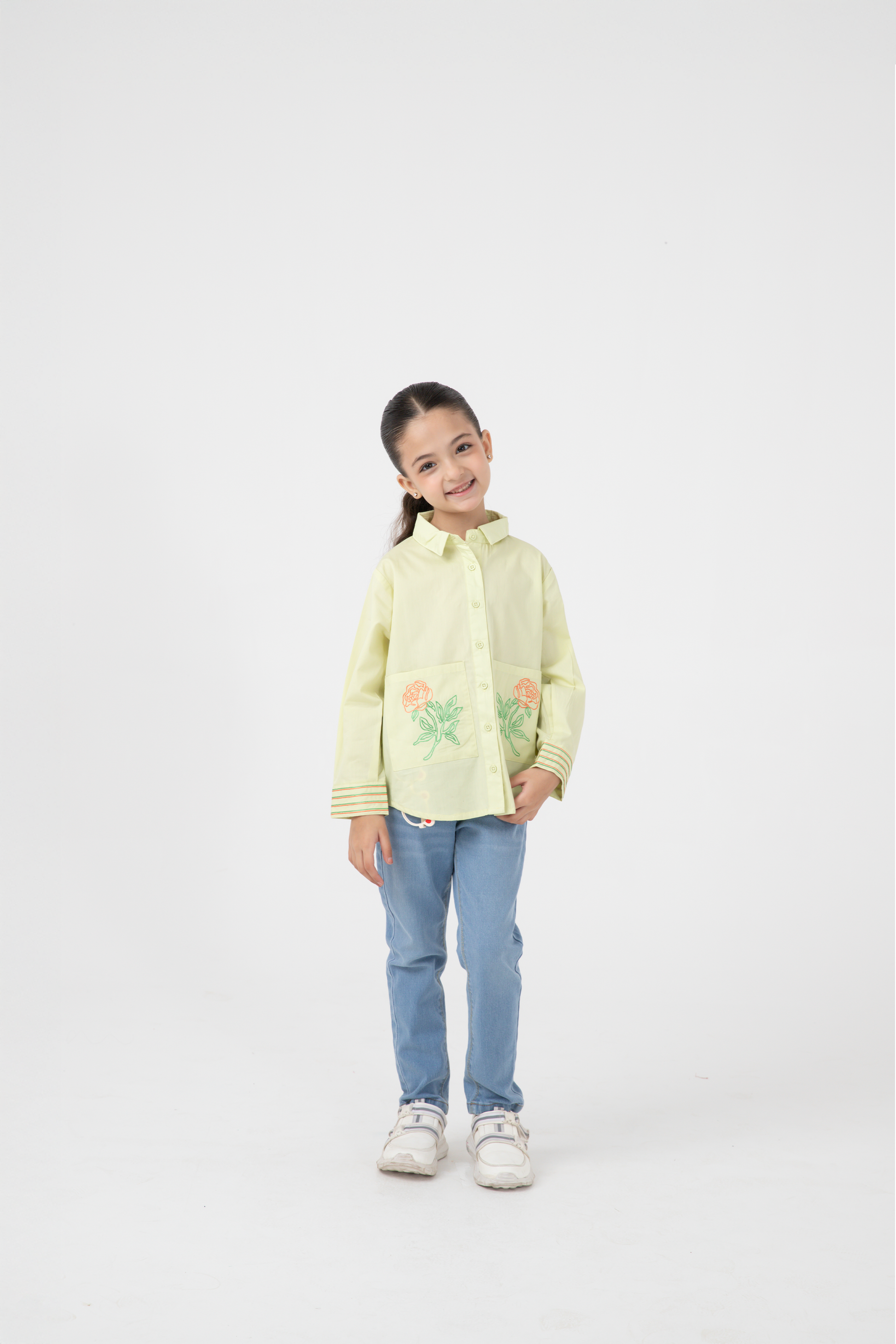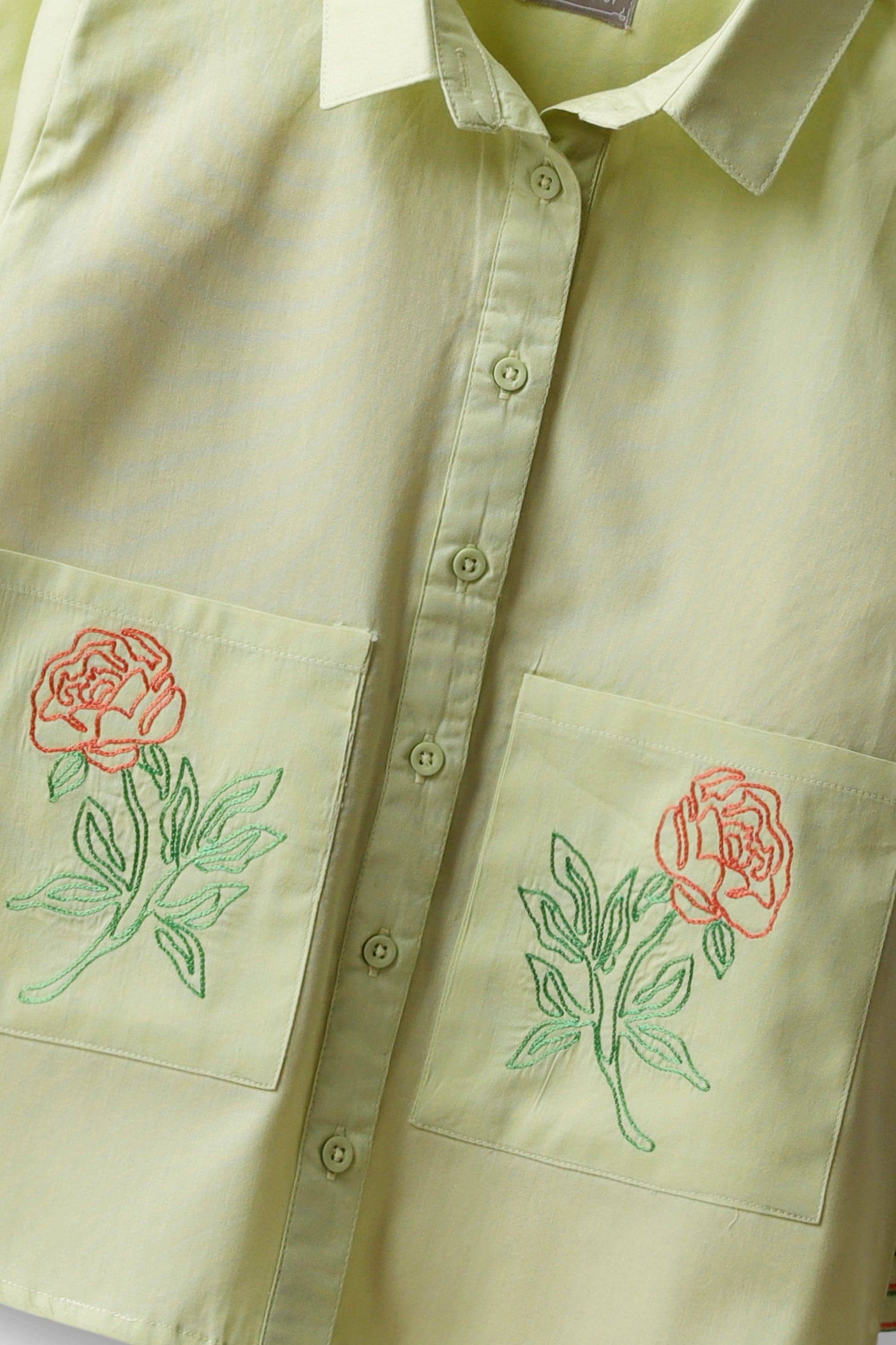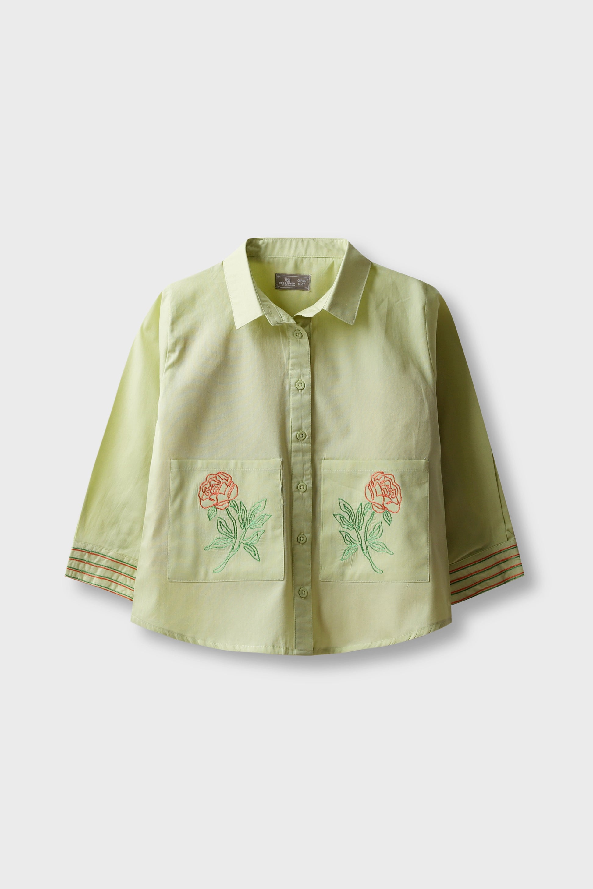 This girls light sage cotton top features charming floral embroidery on both pockets. Detailed with a button front, smart collar, and cuffed sleeves with vibrant stripe accents. Soft, breathable fabric makes it ideal for casual outings and special moments with a touch of playful elegance.