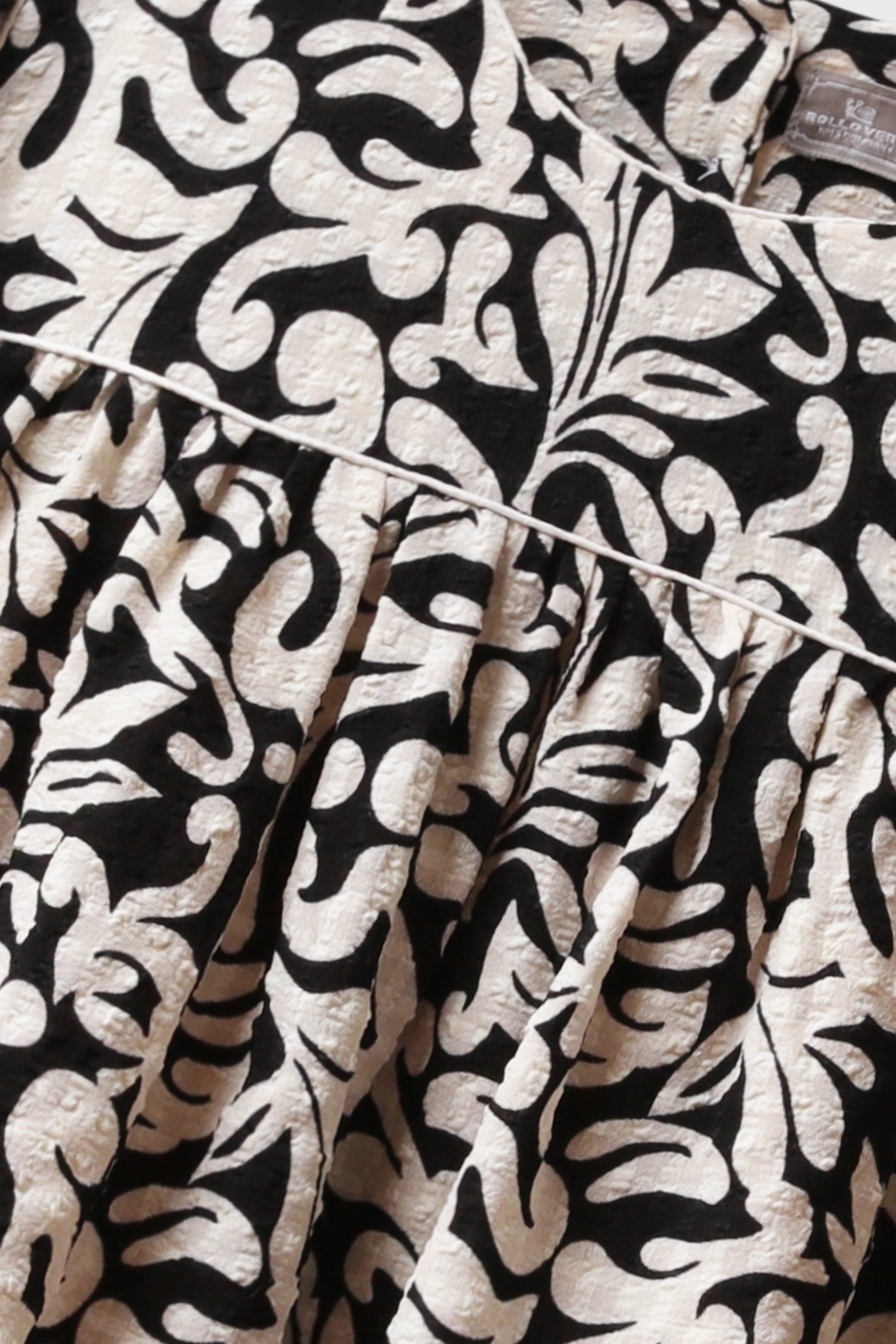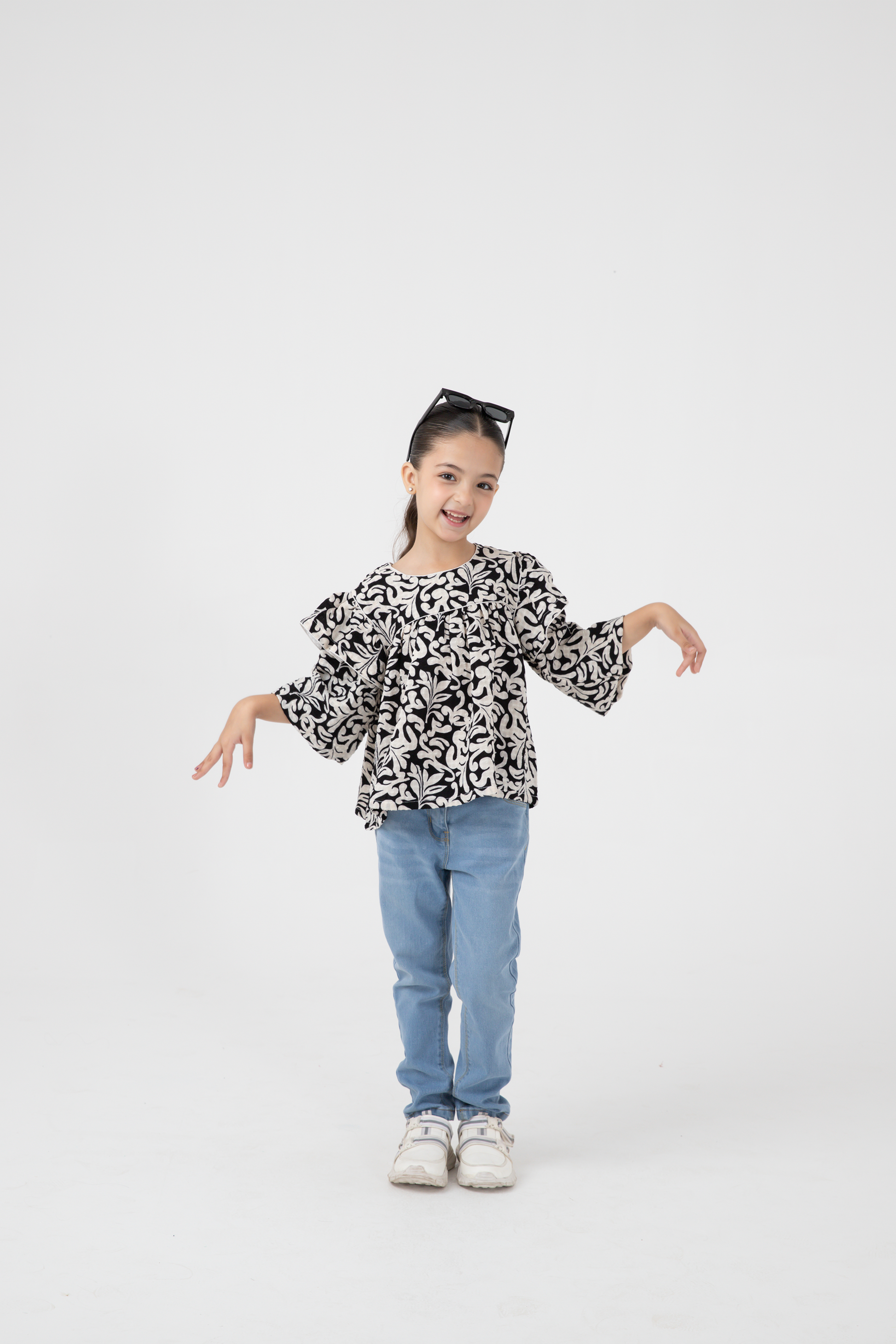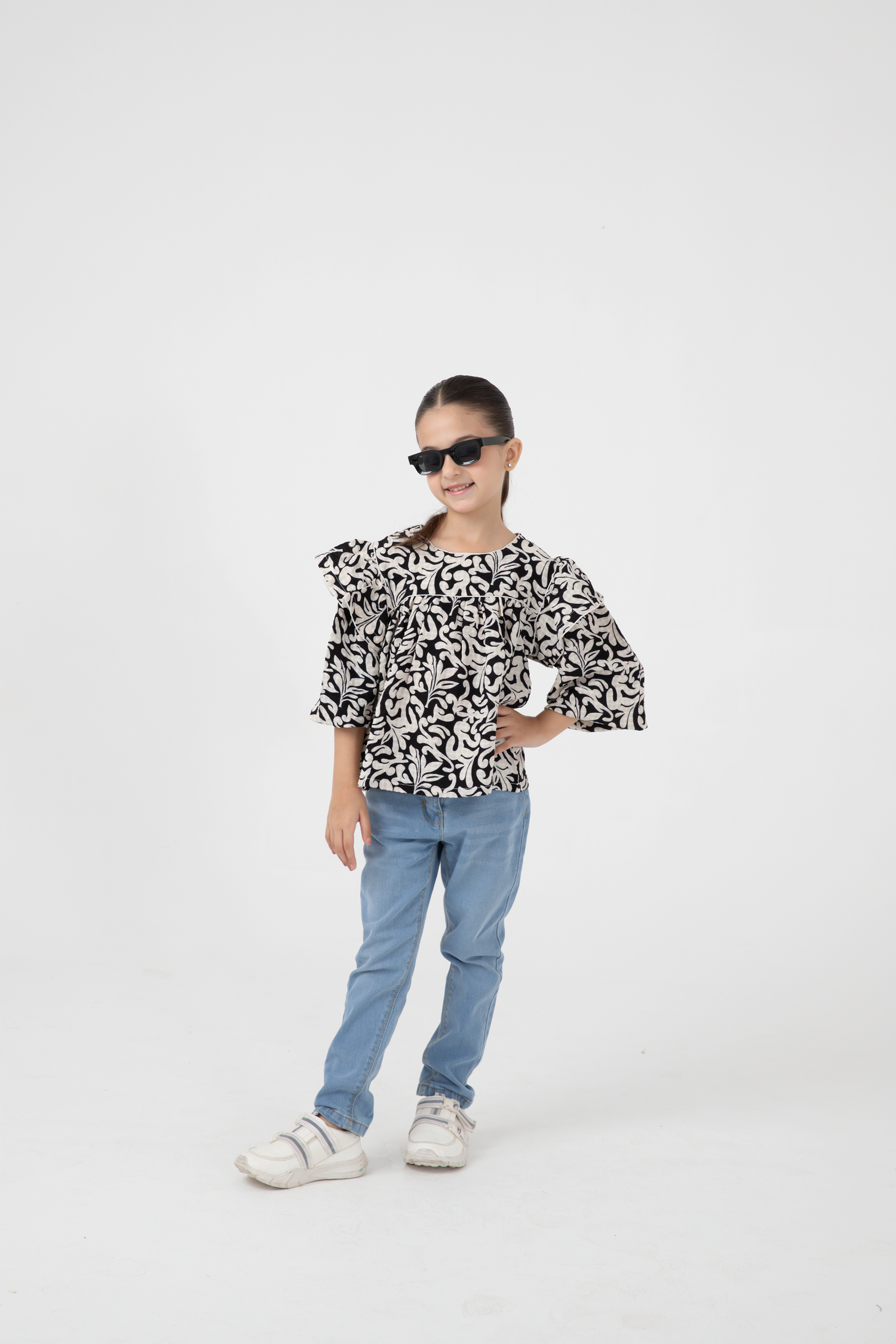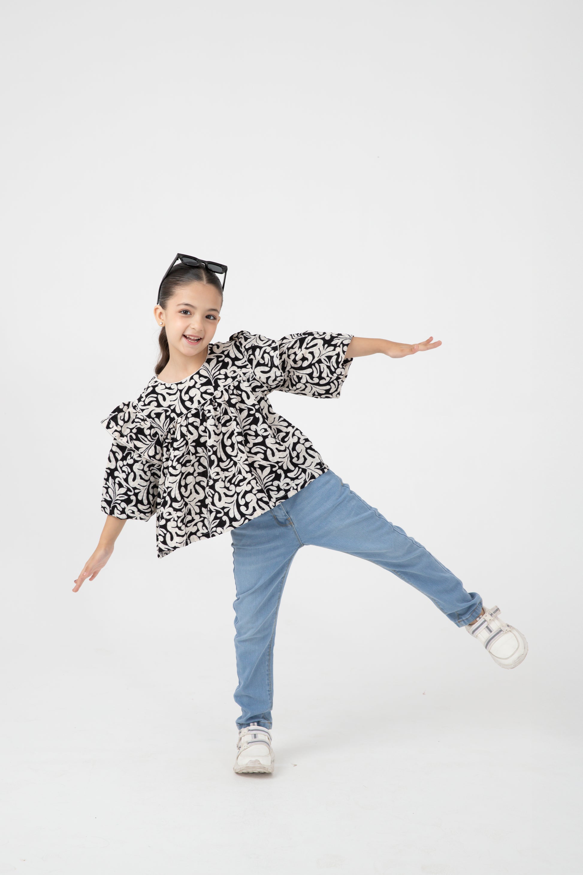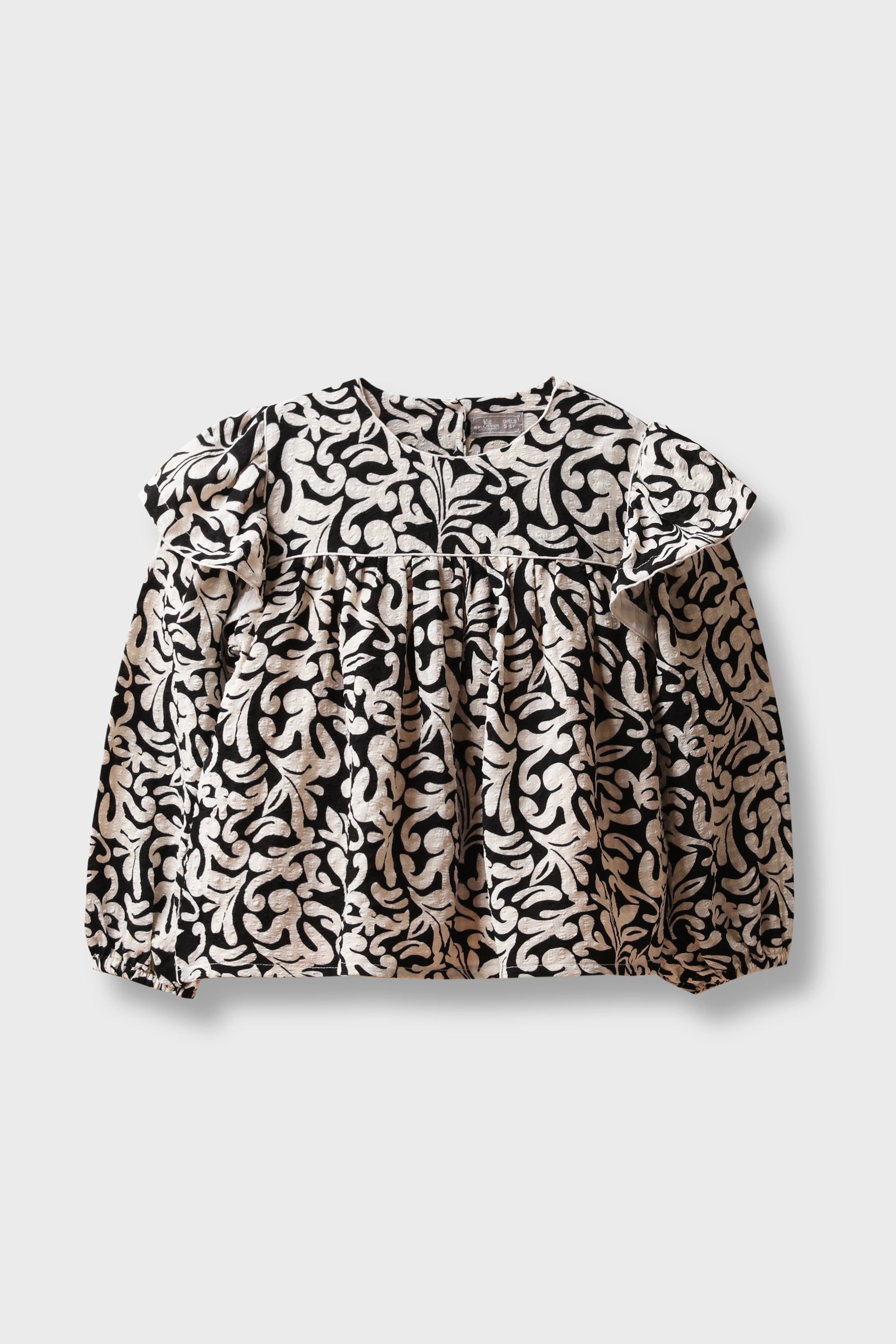 Made in breathable black cotton, this girls top is covered in an eye catching off white botanical swirl print. Featuring gathered front details and puffed sleeves, it offers a relaxed yet stylish look. A versatile piece for casual outings and special occasions.