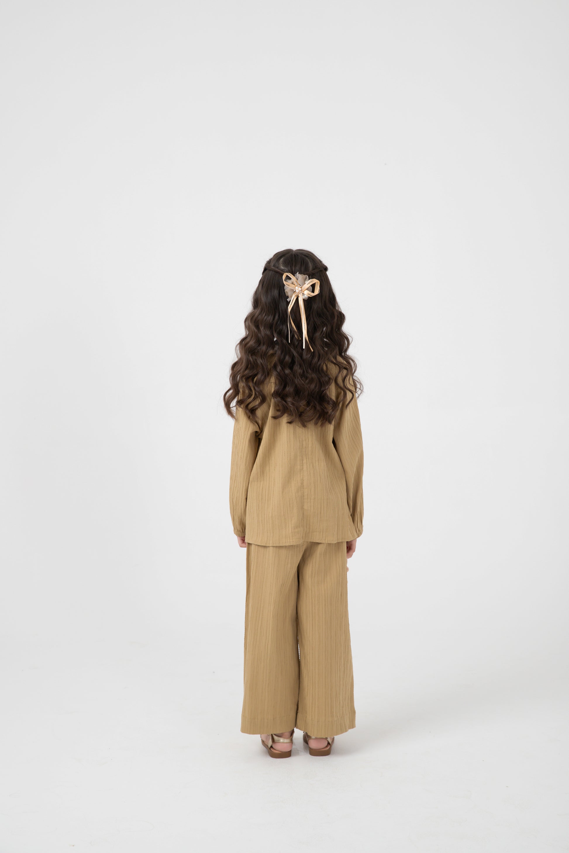 Chic yet simple, this khaki cotton co-ord blends classic design with contemporary comfort. The long-sleeved top is shaped with soft pleats and gentle gathers, complementing the flowy pants with an elastic waist. Ideal for play or pause, it is a wardrobe must-have for minimalist charm.