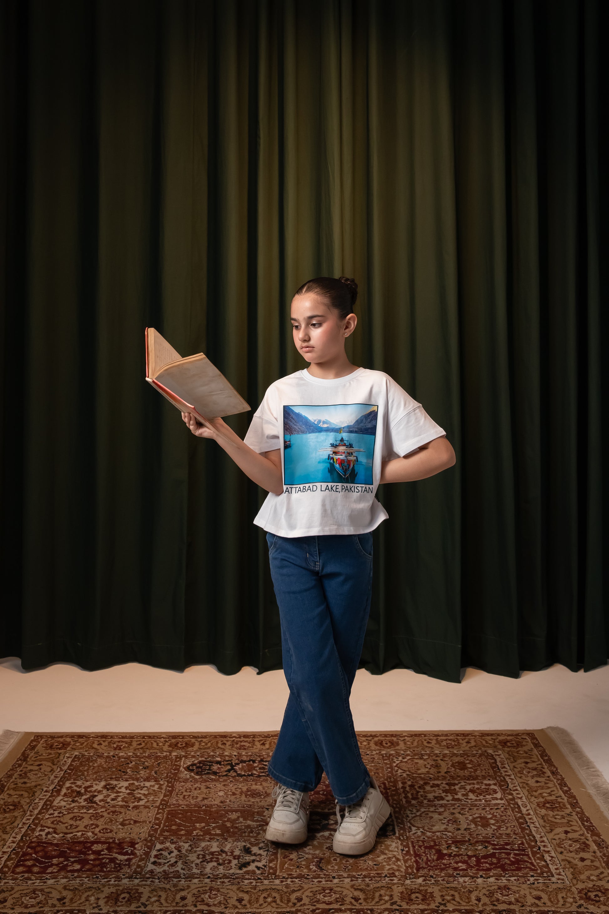 Let him dream big in this cotton knit t-shirt featuring a picturesque view of Attabad Lake. The detailed graphic captures stunning mountain reflections and boat life. Made for comfort and creativity, this lightweight tee adds natural charm and travel vibes to his independence day celebration.