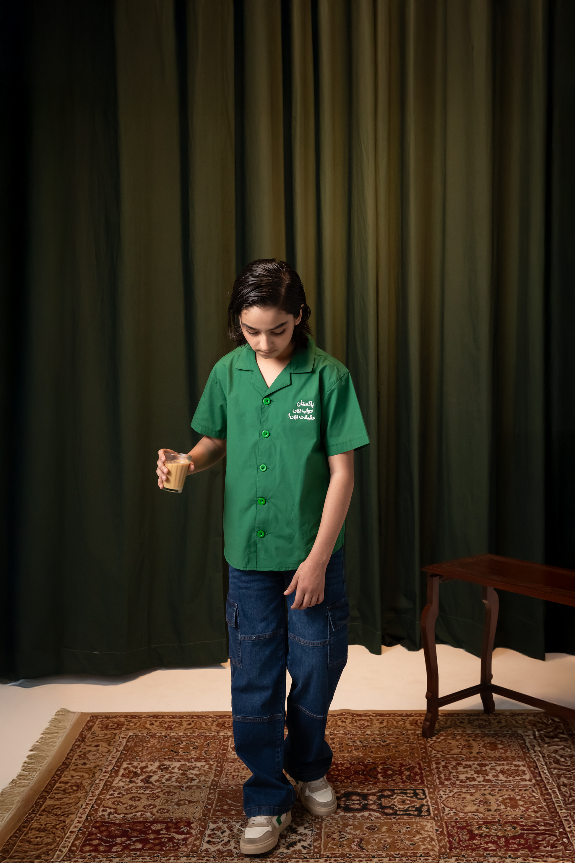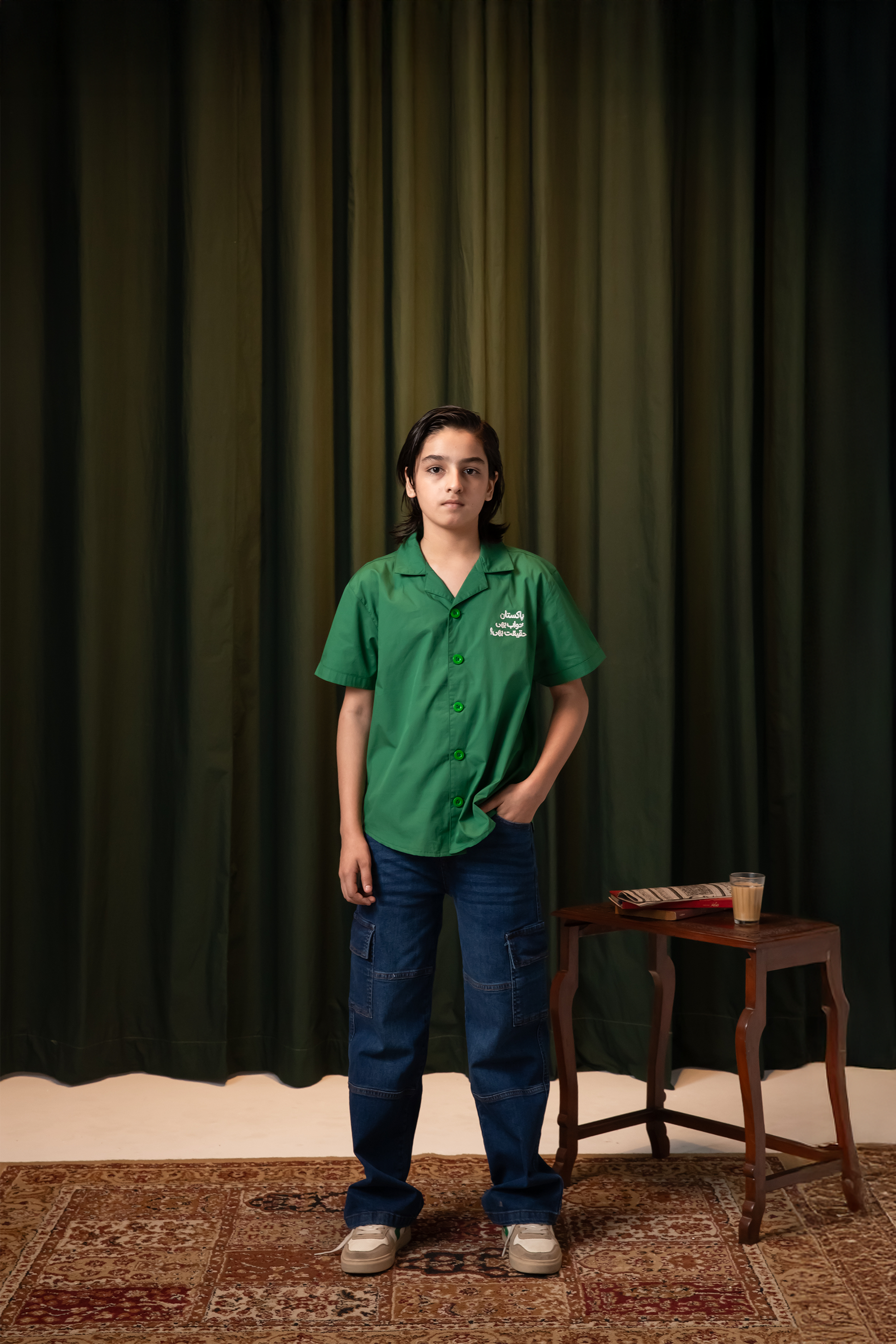 Dress him in the colors of courage and pride. This Independence Day shirt, made in soft green cotton, features meaningful Urdu embroidery and a laid-back silhouette. Designed for festive events and flag-waving moments, it’s a standout addition to every young patriot’s wardrobe. Breathable, bold, and ready for celebration.