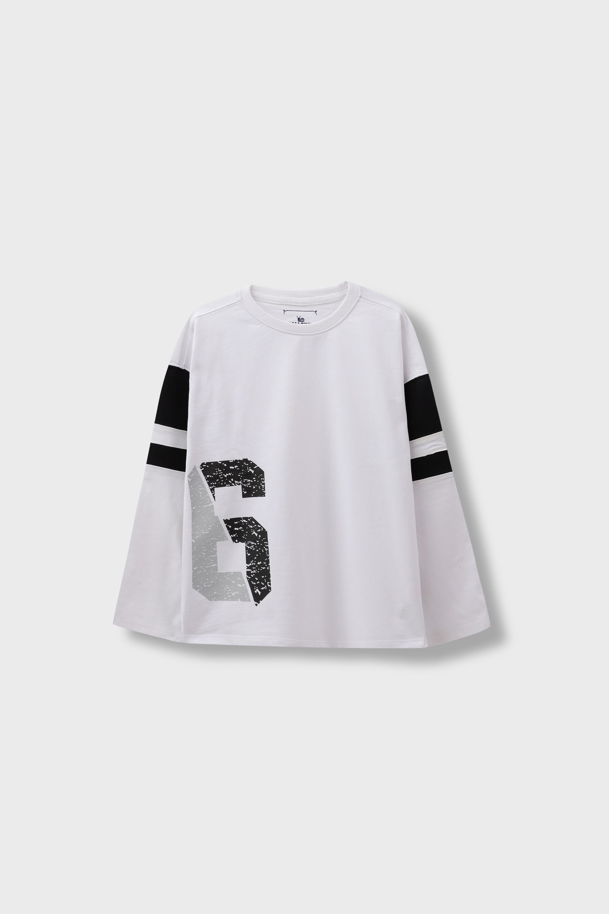 Amp up your boy’s streetwear game with this white drop shoulder tee featuring bold contrast sleeve stripes and a cracked varsity-style number print. Crafted from heavy jersey for comfort and durability, it's a sporty essential for playdates, casual outings, and everything in between. Style meets performance in one go.