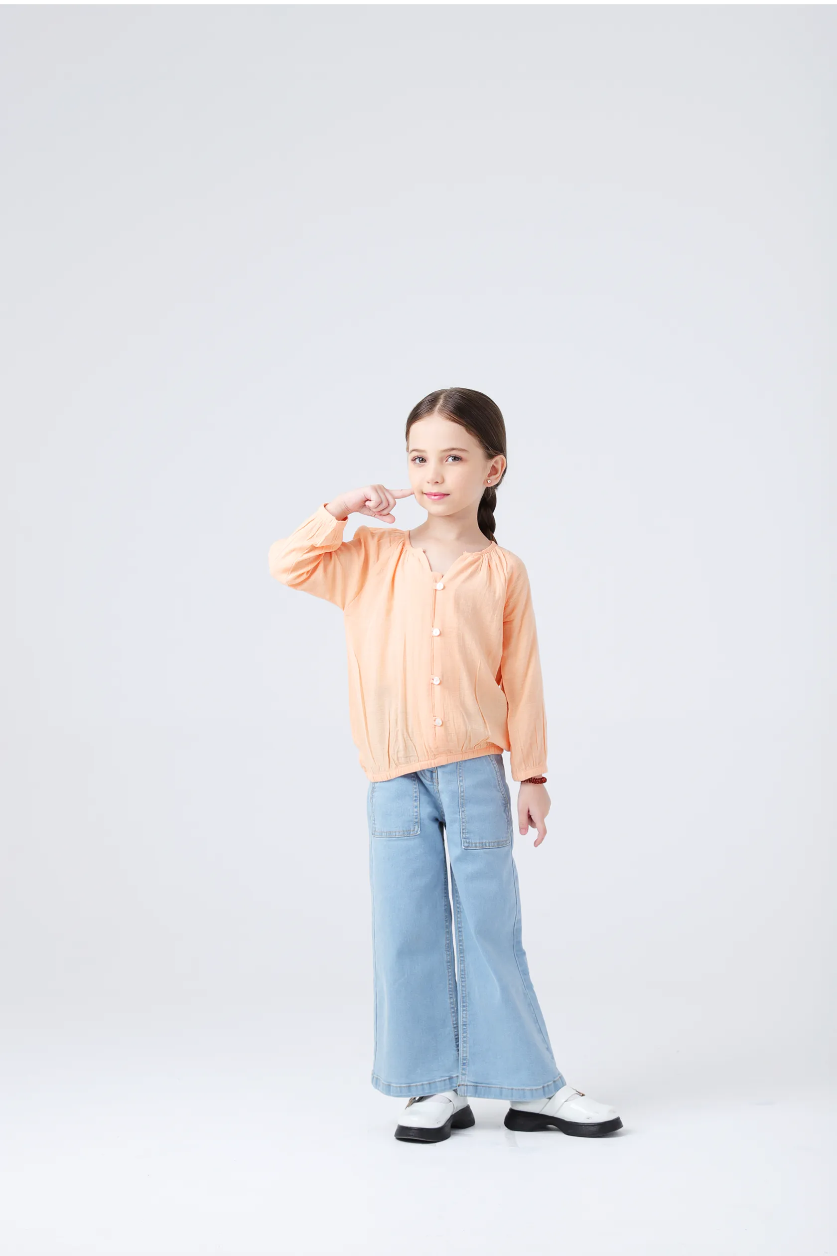 A soft peach cotton top with a front button closure and sweet V opening. Elasticated hem and sleeves offer a gathered look that’s both comfy and stylish—perfect for sunny days.