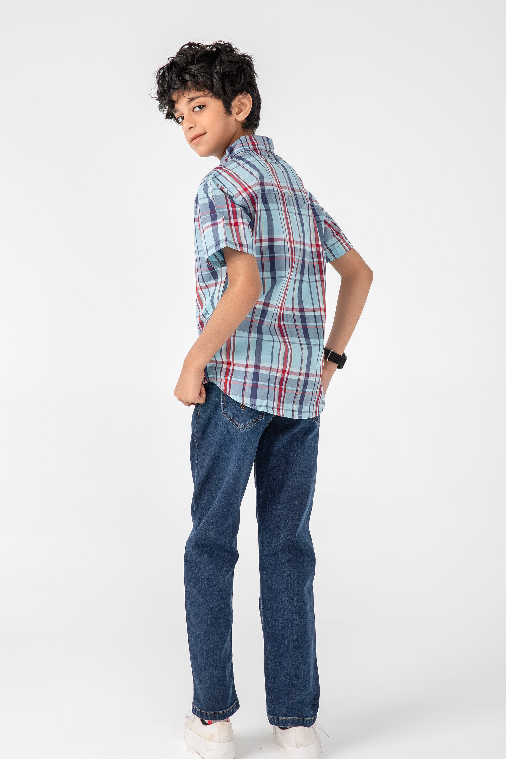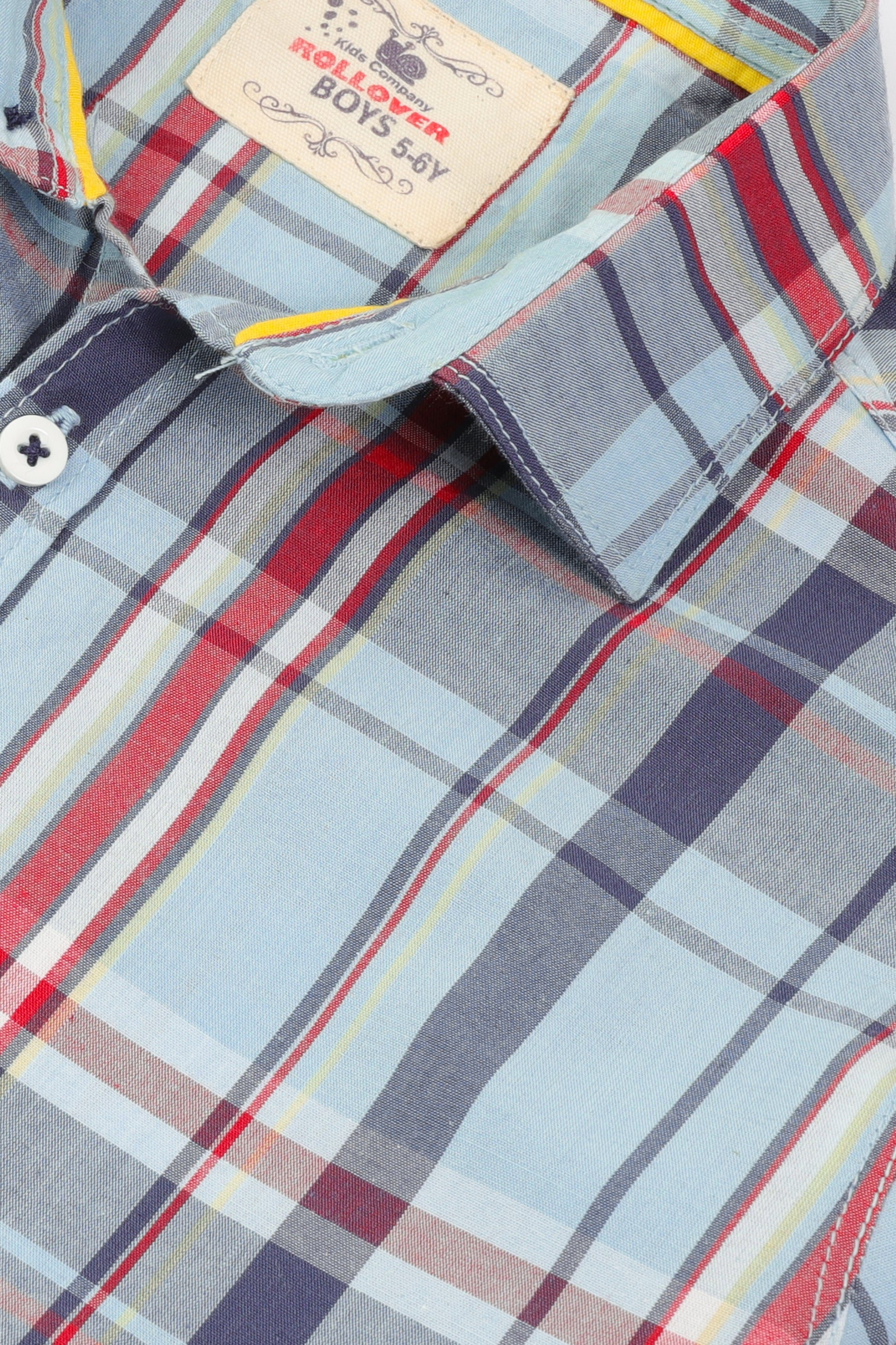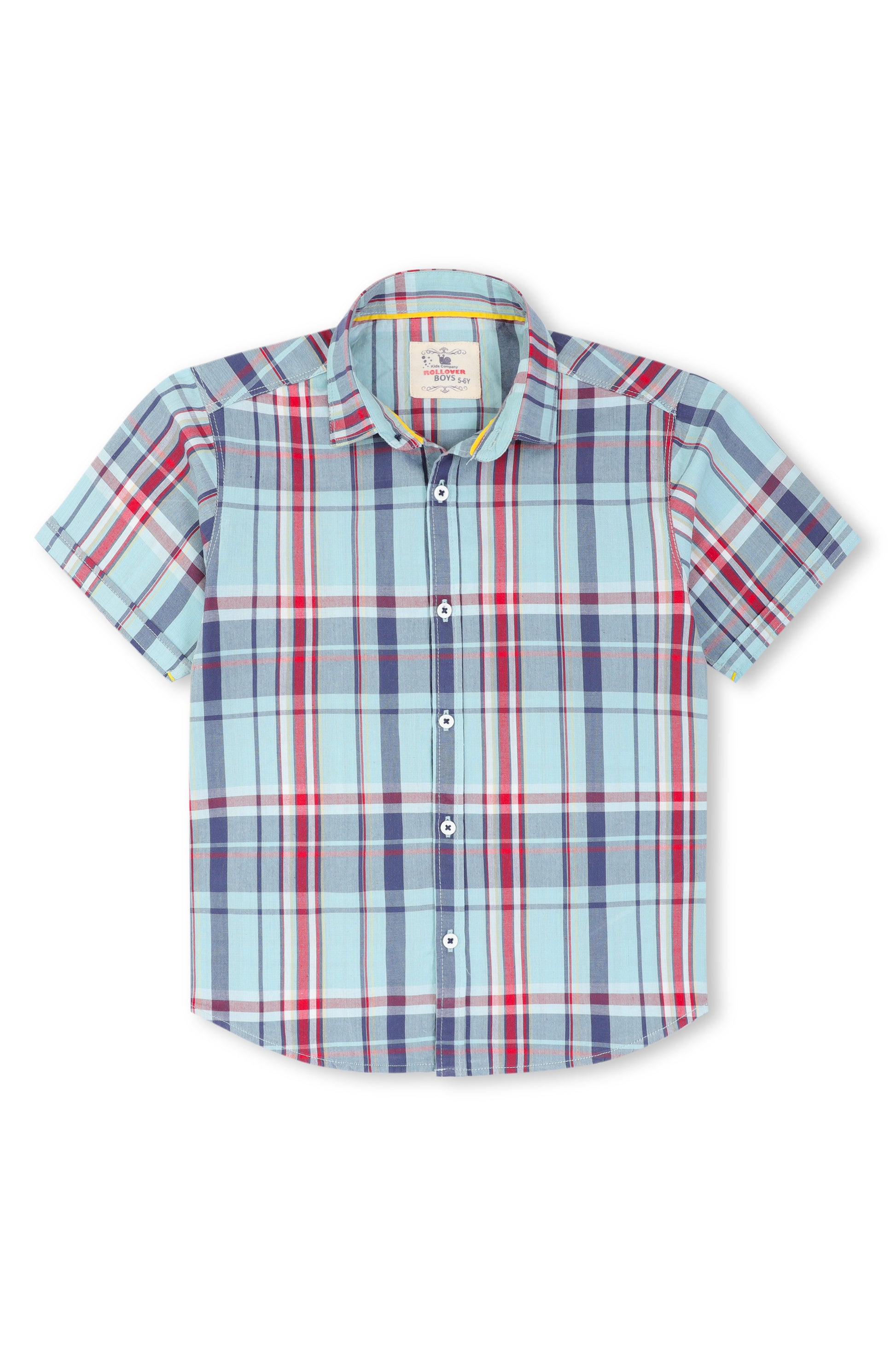 Create a stylish ensemble for him with this sky blue check shirt. The breathable cotton fabric and casual style make it a go-to piece for everyday wear.