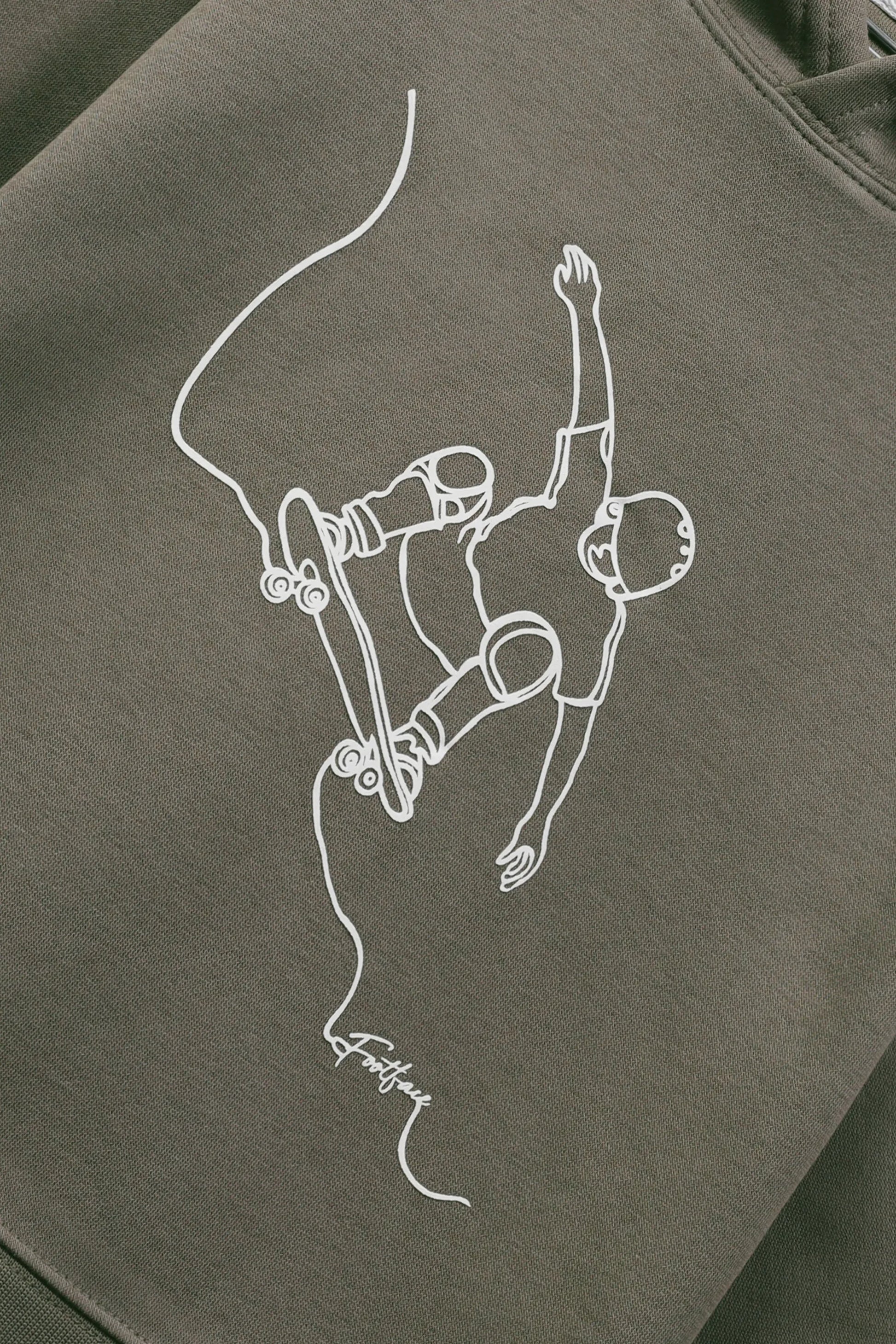For boys who live to move, this olive green fleece hoodie brings serious skatepark energy. The pullover style with a self-fabric hood lining, raglan sleeves, and bold skater graphic amps up the attitude. Cozy cuffs and a laid-back fit make it ideal for everyday wear with street-style flair.